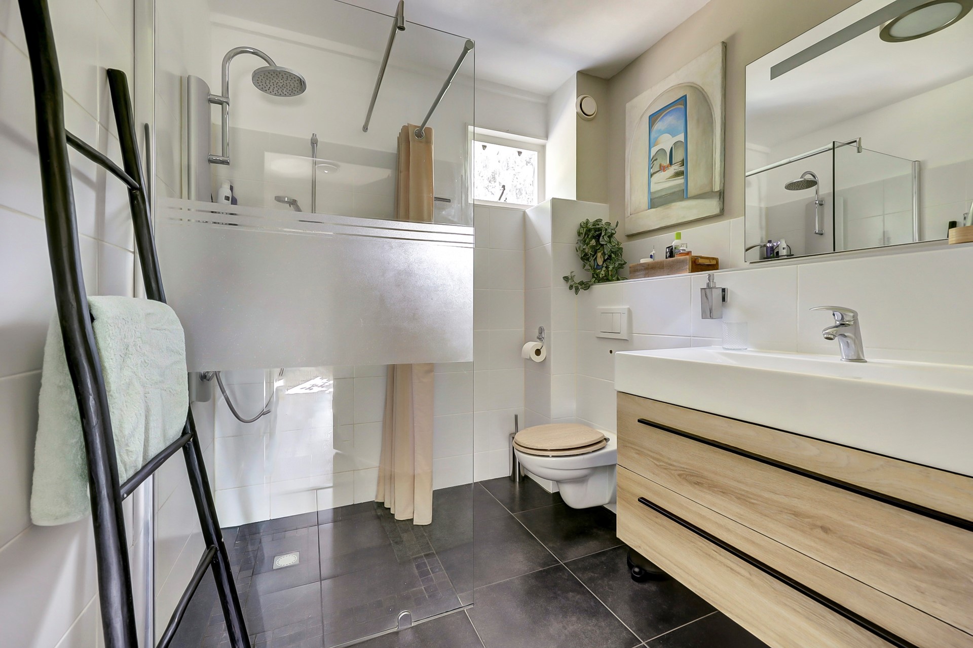 Overloop met toegang tot twee slaapkamers en de badkamer. Ook hier ligt een doorlopende PVC-vloer. De badkamer is modern en praktisch ingericht met douche, toilet en wastafelmeubel.