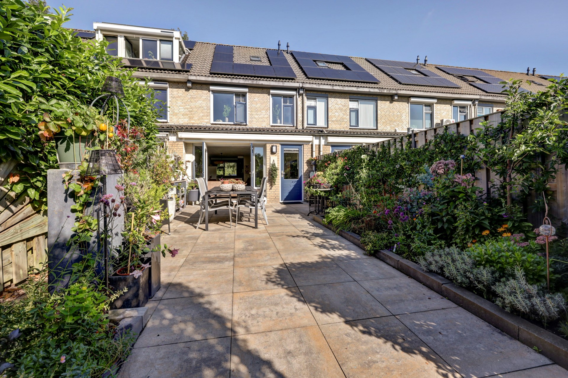 De diepe achtertuin biedt veel privacy en is grotendeels bestraat, met groene borders langs de zijkanten. Aan de gevel bevindt zich een zonnescherm, zodat je ook op warme dagen volop kunt genieten.