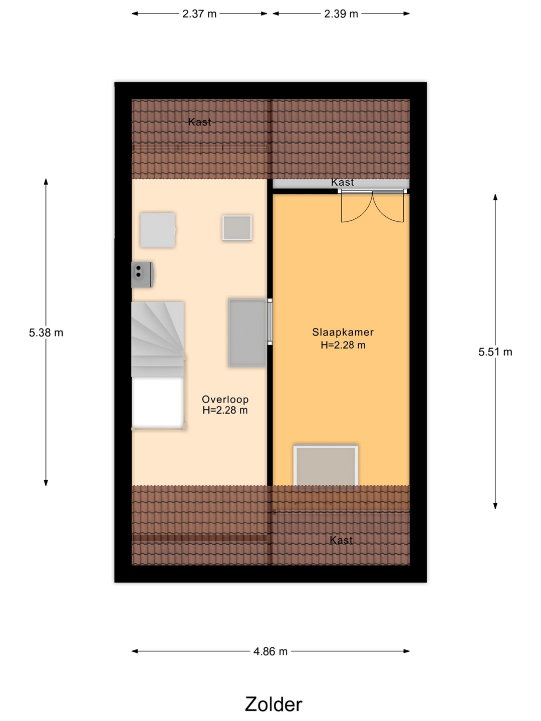 Overloop met dakraam, cv-opstelling en aansluiting voor de wasmachine. Ruime zolderkamer met dakraam, bergruimte achter de knieschotten en toegang tot een bergvliering.