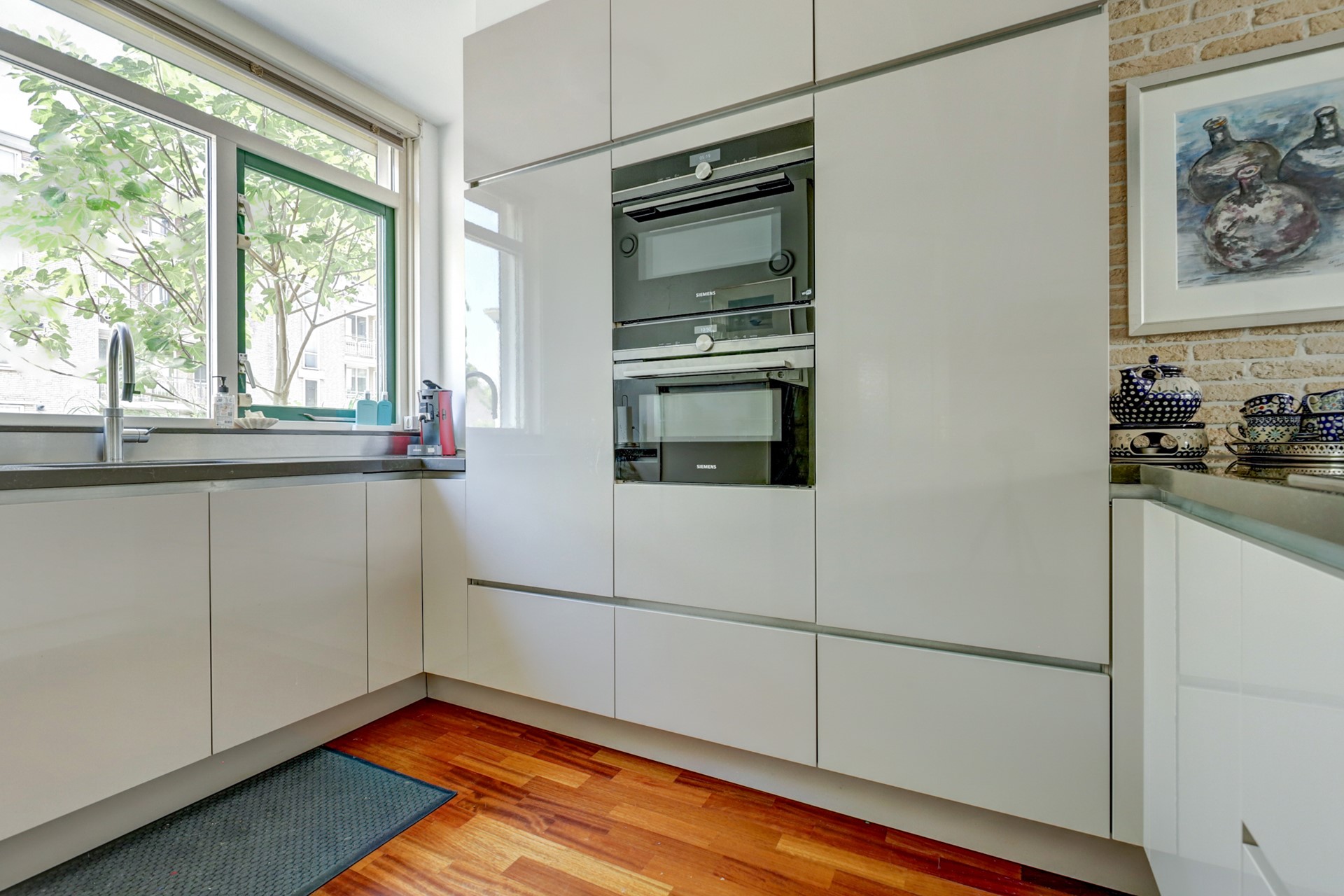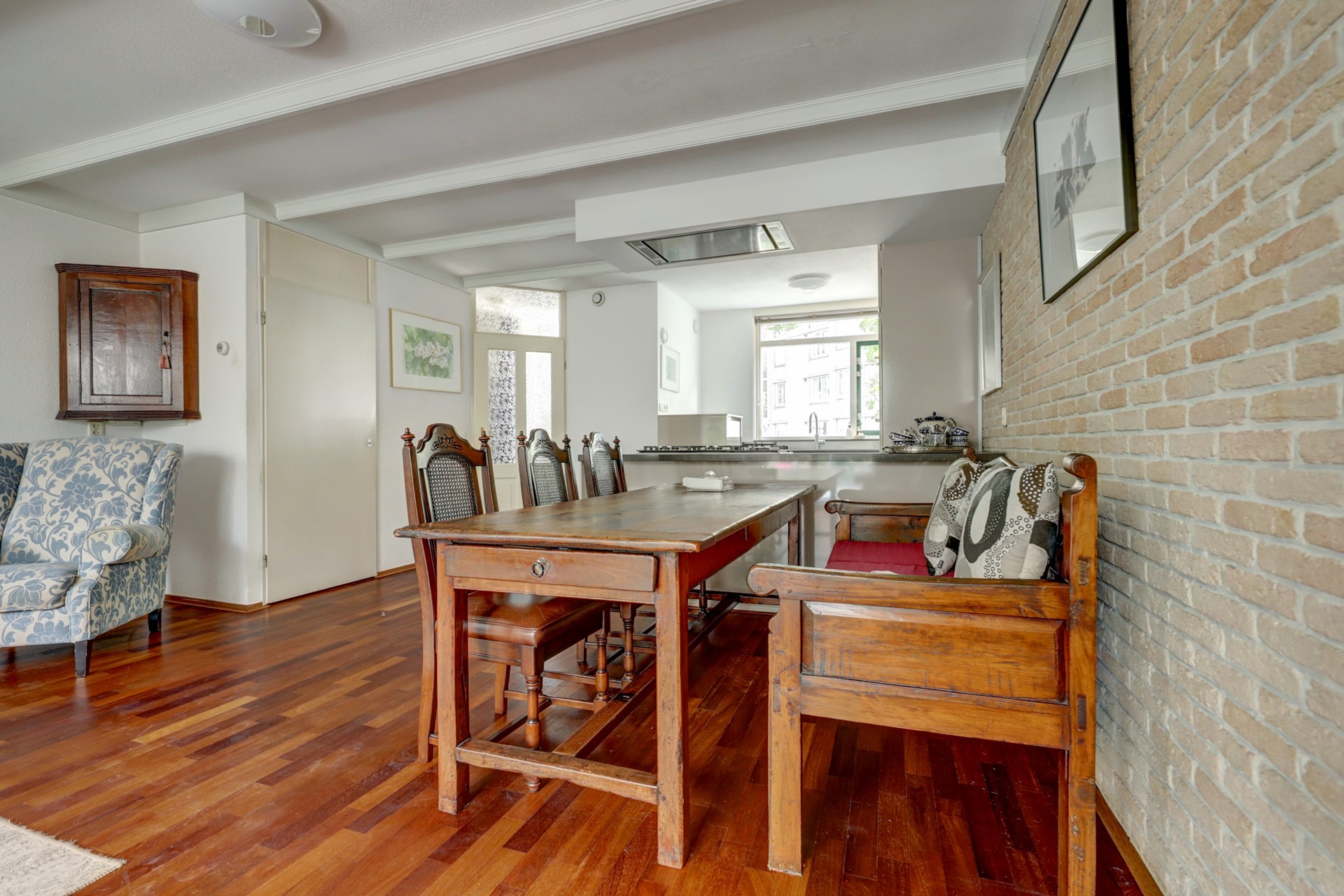 U wordt verwelkomd in een lichte hal met toiletruimte, meterkast en trapopgang. Aan de voorzijde van de woning bevindt zich een moderne keuken in U-opstelling, compleet met schiereiland en voorzien van alle nodige inbouwapparatuur op werkhoogte. De uitgebouwde, tuingerichte woonkamer biedt volop ruimte en heeft een praktische trapkast. Via de schuifpui betreedt u de woningbrede serre, een heerlijke plek om te ontspannen en te genieten van het uitzicht op de perfect onderhouden tuin.