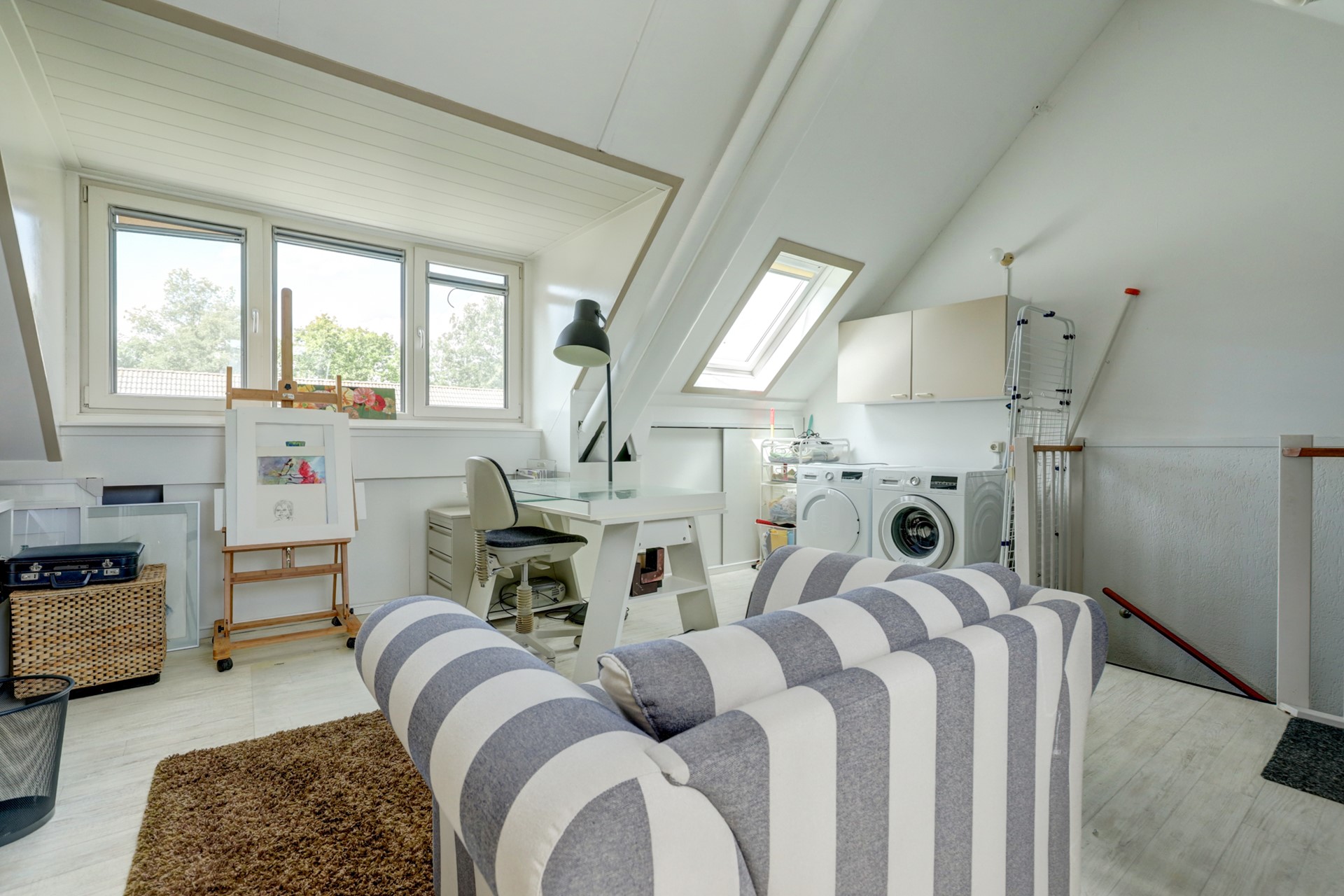 De ruime zolder biedt veel mogelijkheden. De grote open ruimte is perfect om een extra slaapkamer of werkruimte te realiseren. Een dakkapel aan de achterzijde zorgt voor extra licht en ruimte. Hier vindt u tevens de unit van de heteluchtverwarming, de cv-ketel voor warm water en de aansluiting voor de wasmachine.