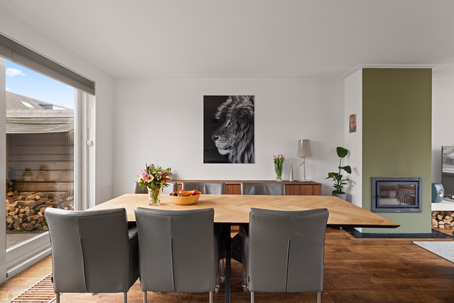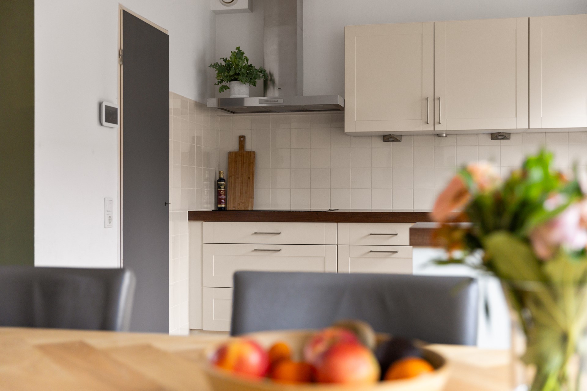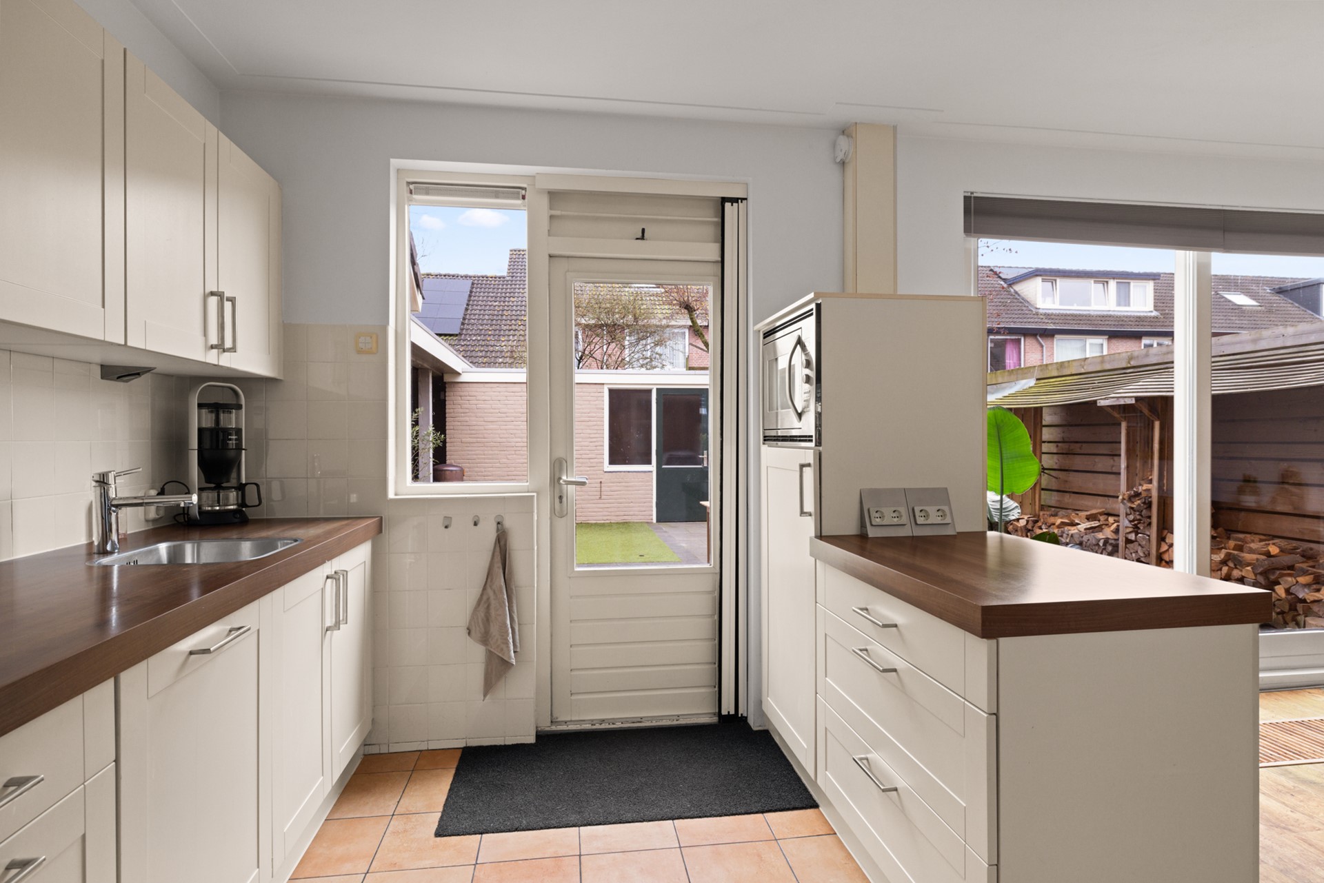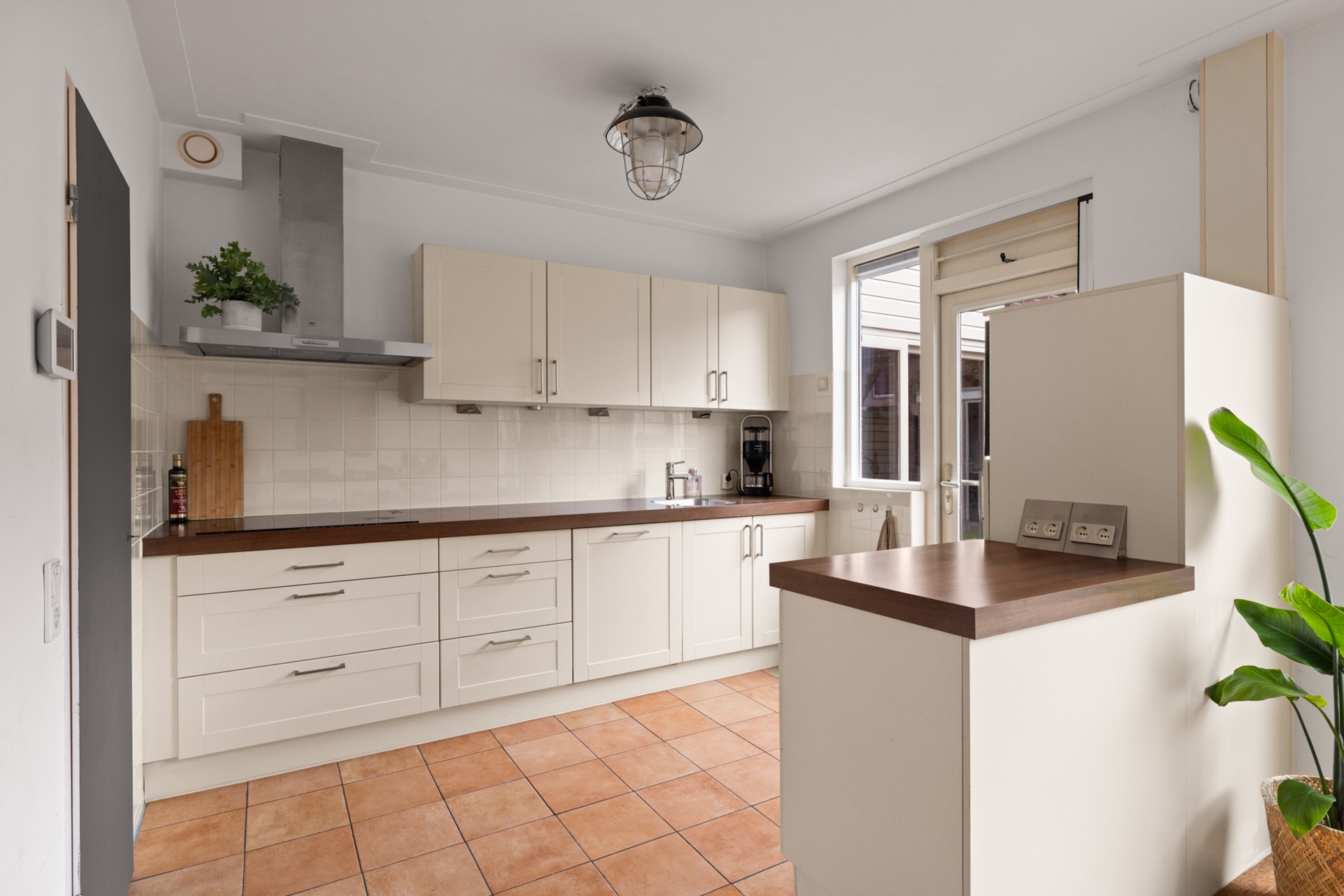 Entree met hal, trapopgang en toiletruimte. De ruime woonkamer is heerlijk licht dankzij de grote ramen en beschikt over een houtkachel en een schuifpui naar de tuin. De halfopen keuken is opgesteld in een dubbele opstelling en voorzien van een trapkast en een deur naar buiten.