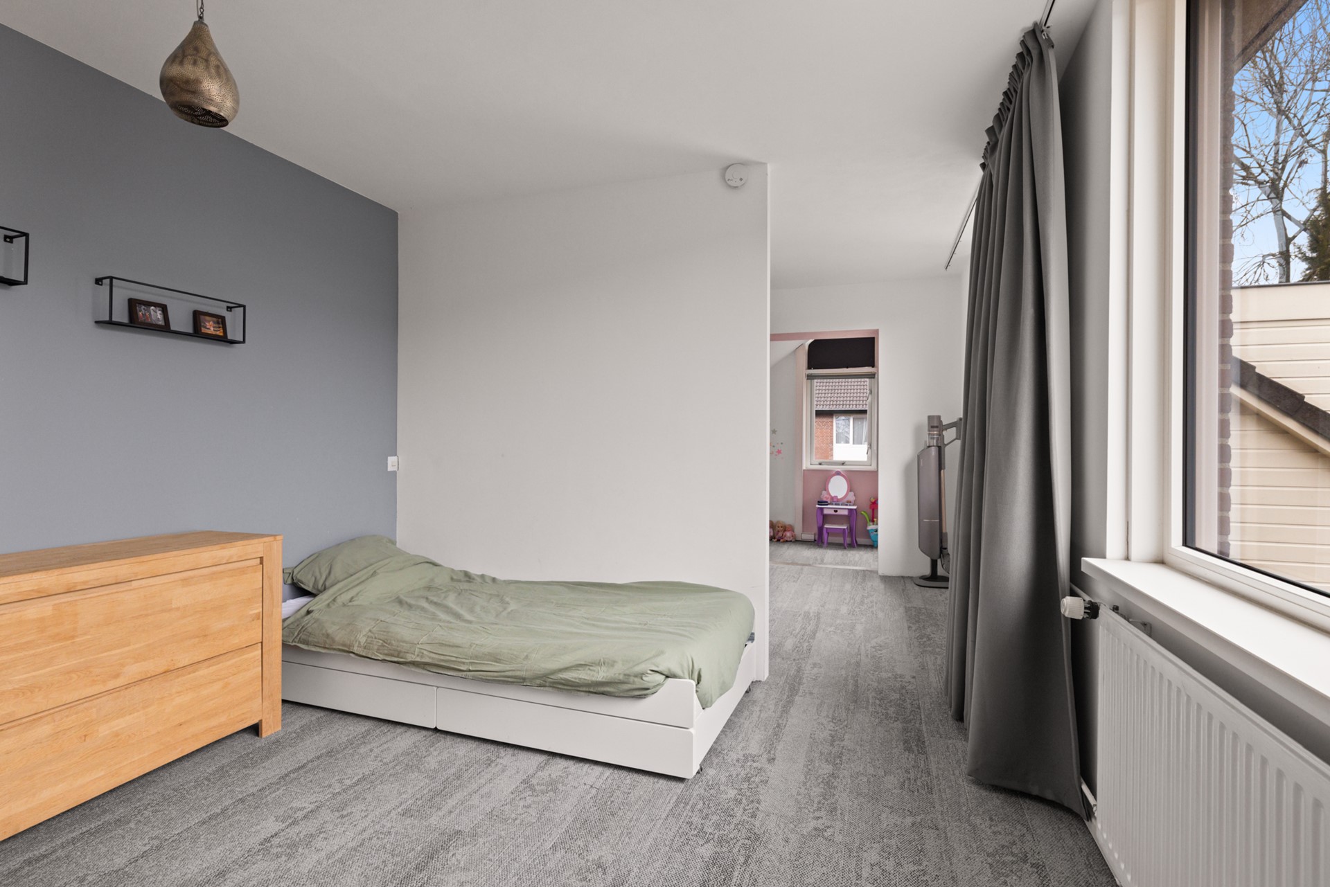 Overloop met toegang tot een slaapkamer aan de voorzijde, voorzien van een Frans balkon. De badkamer beschikt over een toilet, wastafelmeubel en douche. Aan de achterzijde bevindt zich een ruime slaapkamer die is verdeeld in drie delen, waarvan één deel boven de uitbouw ligt. Indien gewenst is het mogelijk om op deze verdieping drie slaapkamers te realiseren.