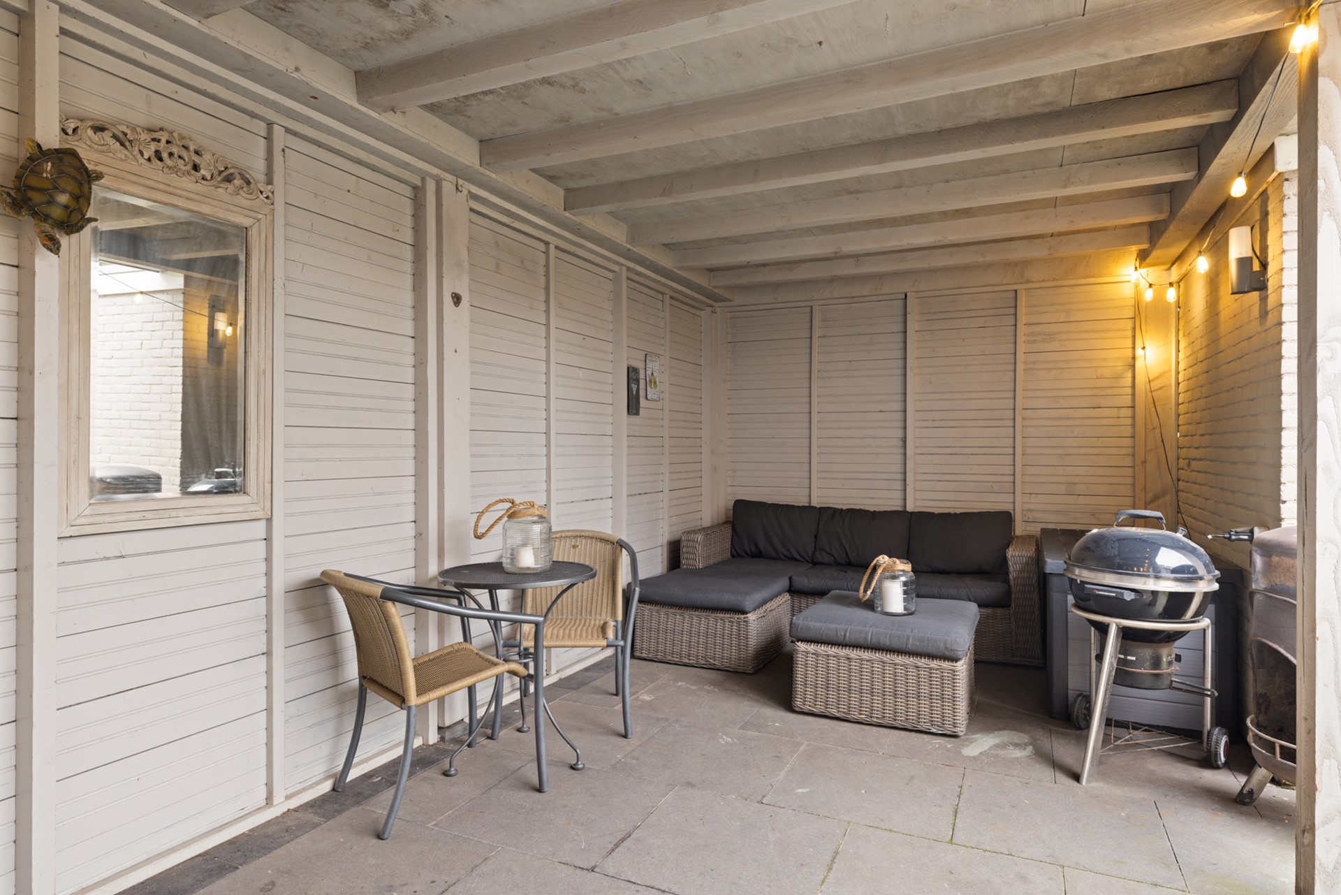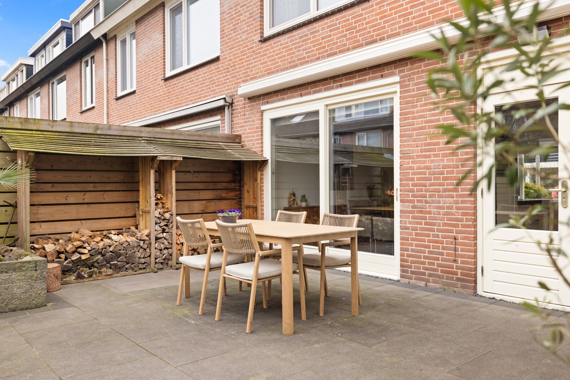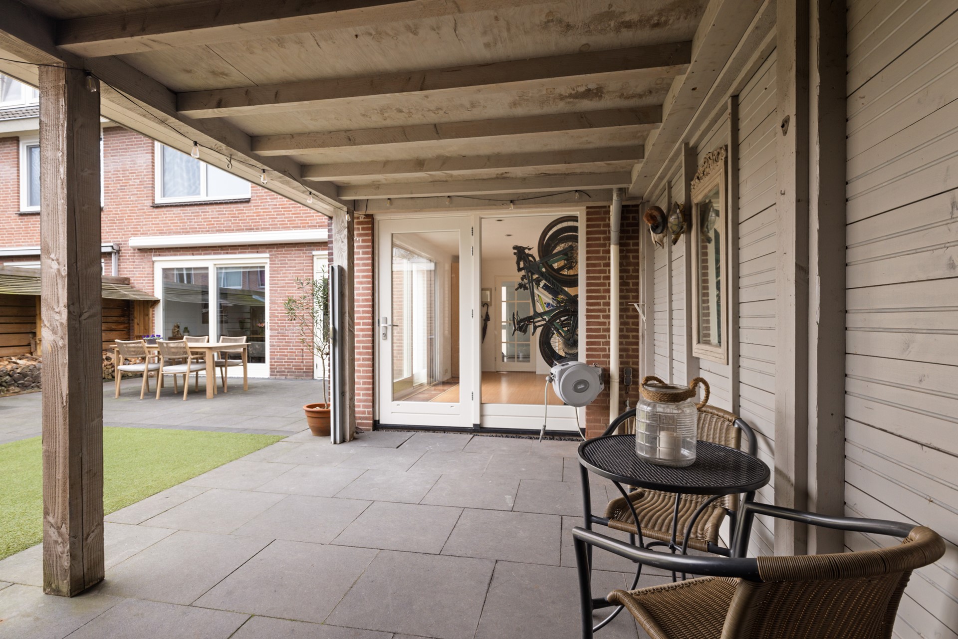 De achtertuin is onderhoudsvriendelijk ingericht en beschikt over een overkapping, berging en een achterom. Aan de voorzijde, bij de uitbouw, bestaat de mogelijkheid om te parkeren op eigen terrein.