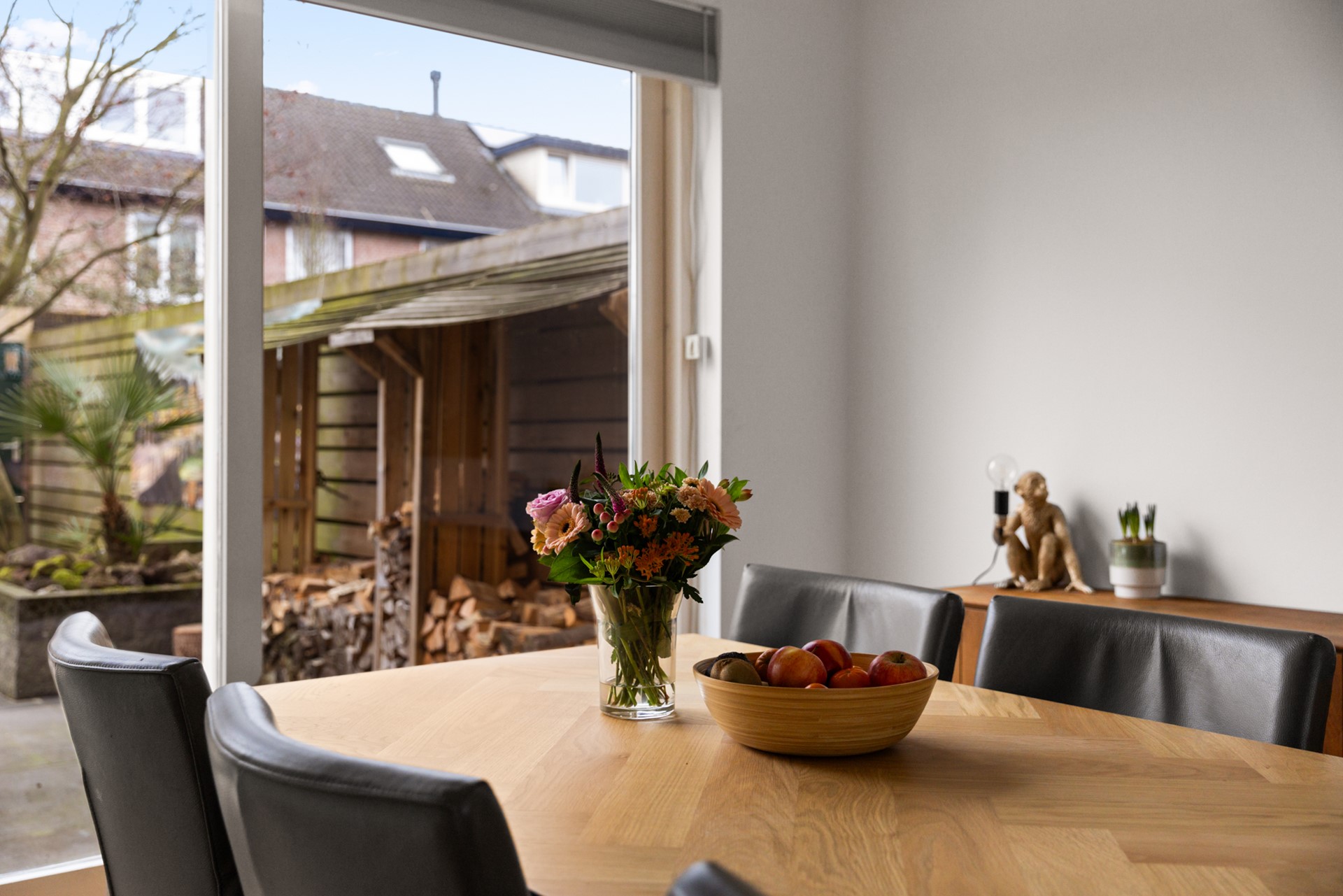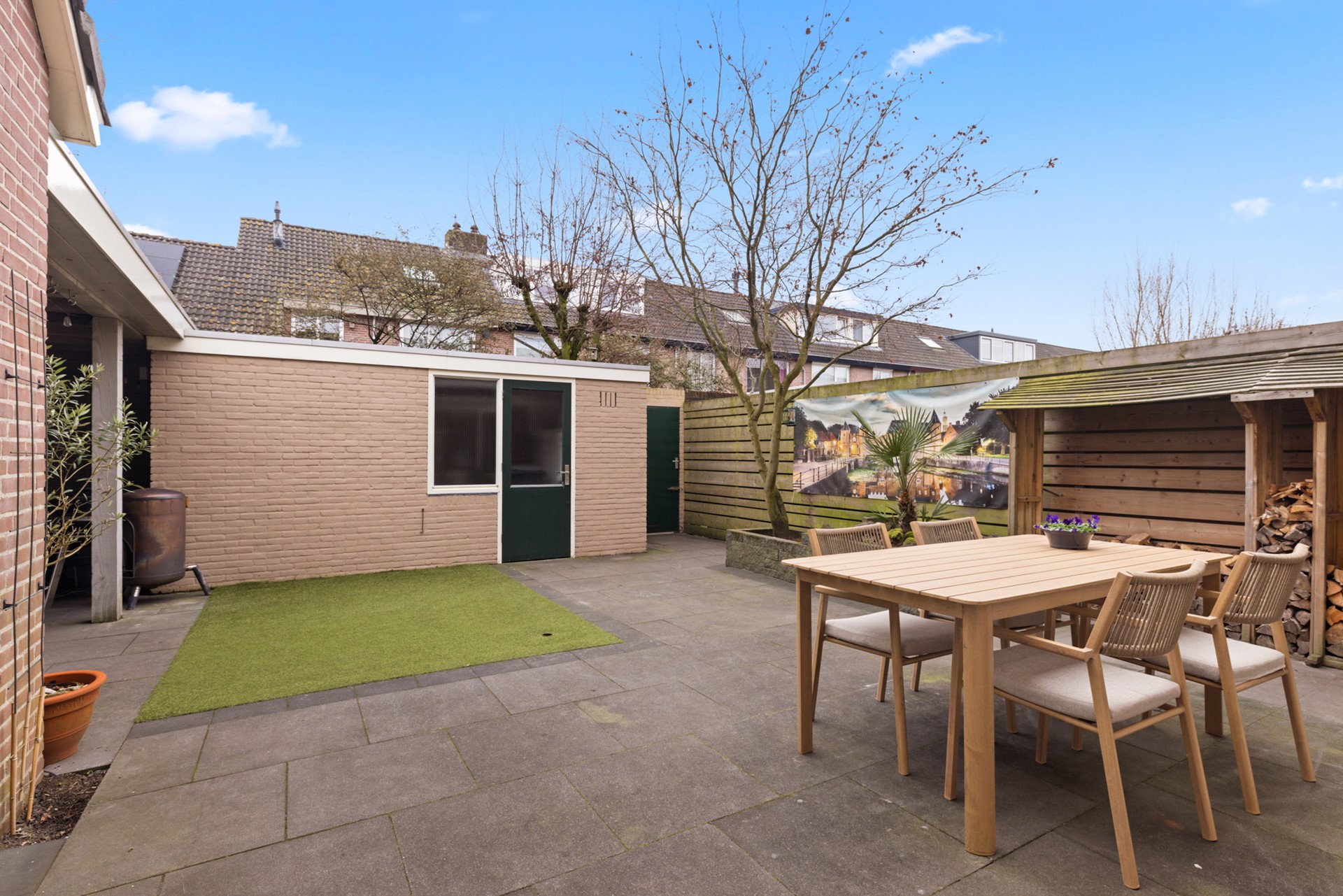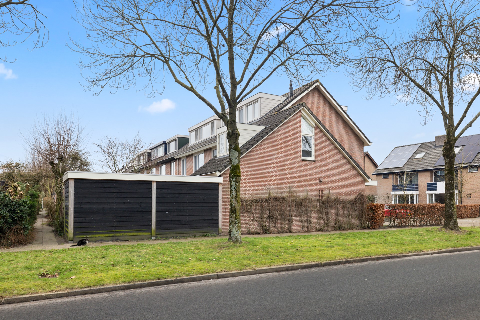 De achtertuin is onderhoudsvriendelijk ingericht en beschikt over een overkapping, berging en een achterom. Aan de voorzijde, bij de uitbouw, bestaat de mogelijkheid om te parkeren op eigen terrein.