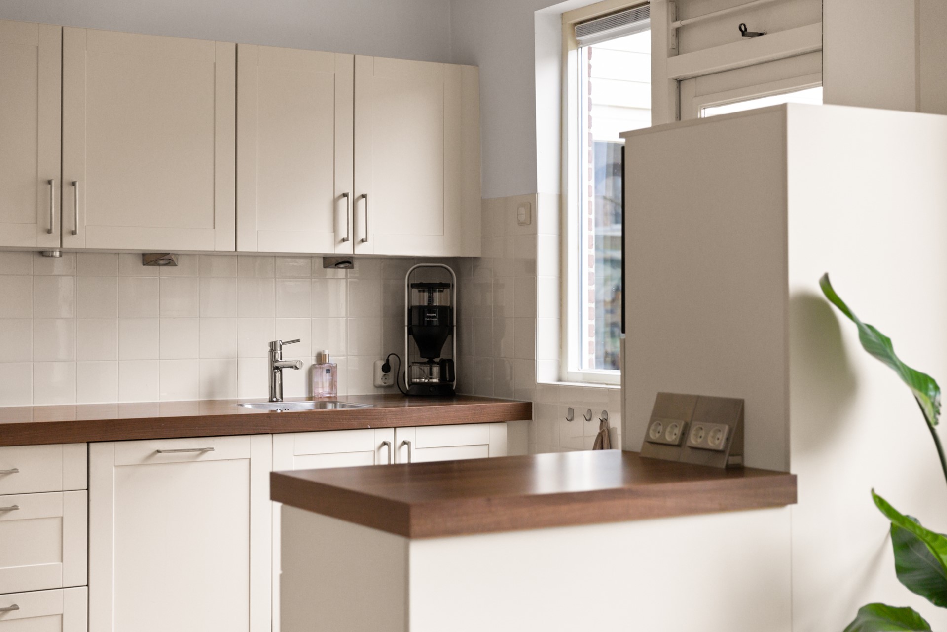 Entree met hal, trapopgang en toiletruimte. De ruime woonkamer is heerlijk licht dankzij de grote ramen en beschikt over een houtkachel en een schuifpui naar de tuin. De halfopen keuken is opgesteld in een dubbele opstelling en voorzien van een trapkast en een deur naar buiten.