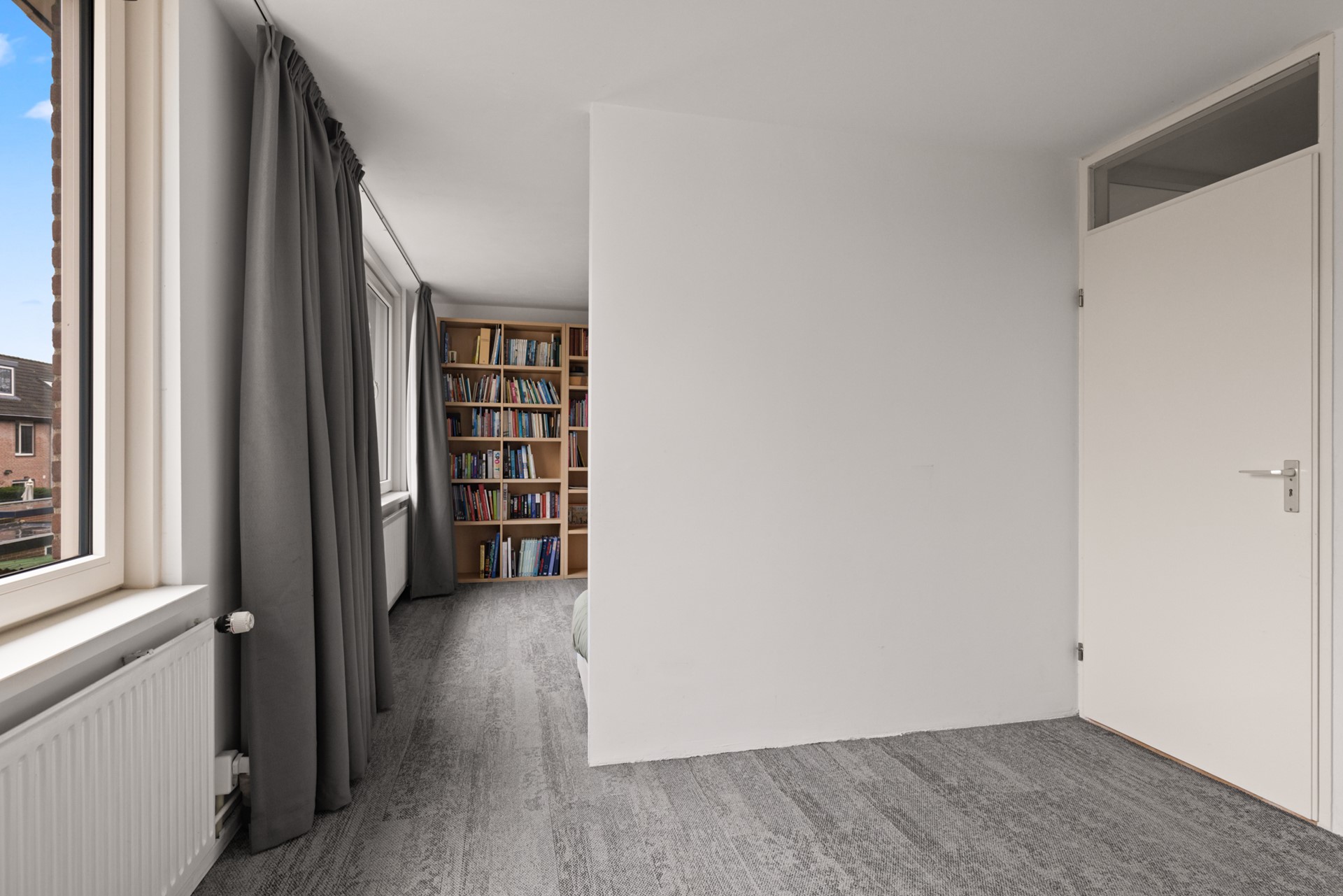 Overloop met toegang tot een slaapkamer aan de voorzijde, voorzien van een Frans balkon. De badkamer beschikt over een toilet, wastafelmeubel en douche. Aan de achterzijde bevindt zich een ruime slaapkamer die is verdeeld in drie delen, waarvan één deel boven de uitbouw ligt. Indien gewenst is het mogelijk om op deze verdieping drie slaapkamers te realiseren.