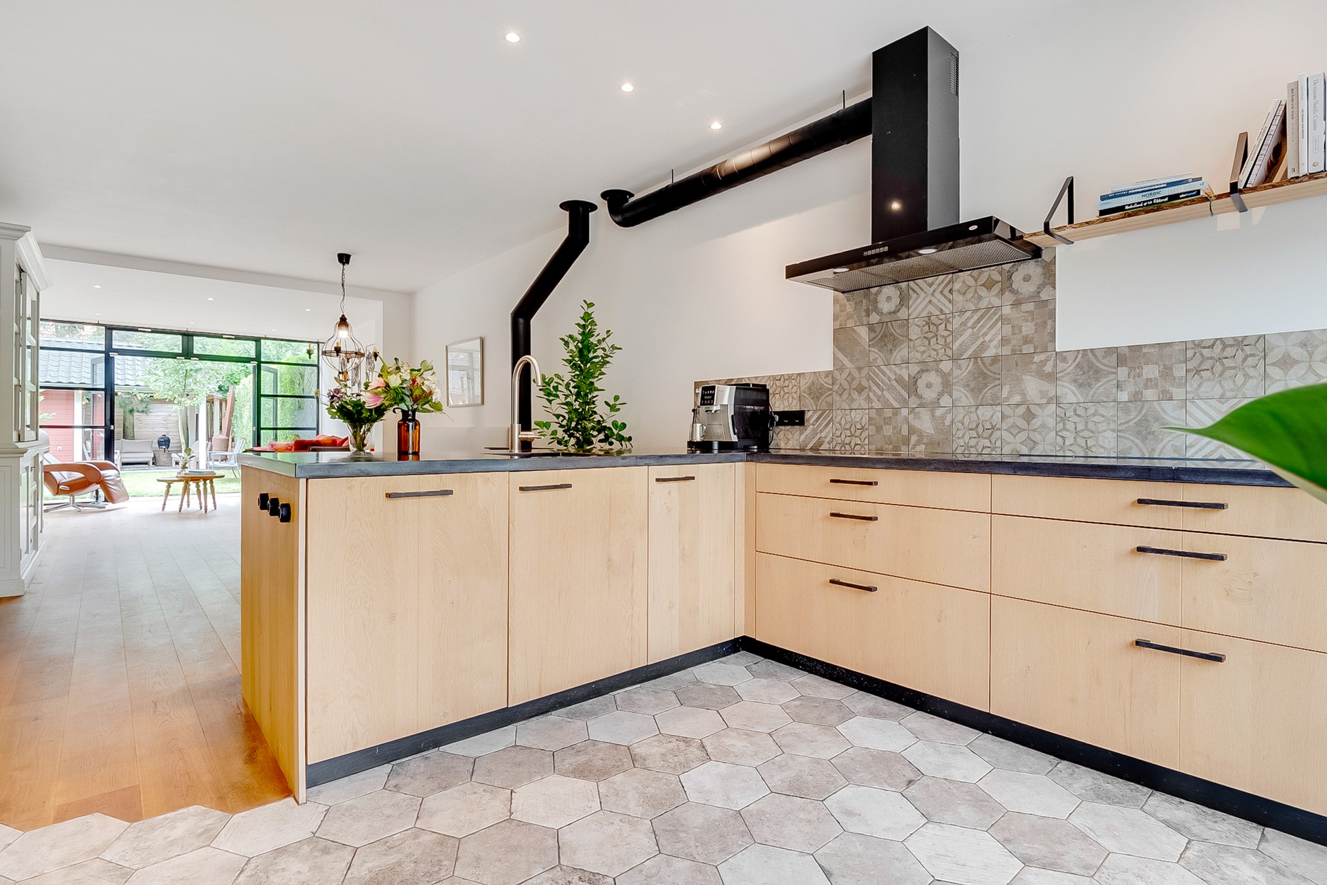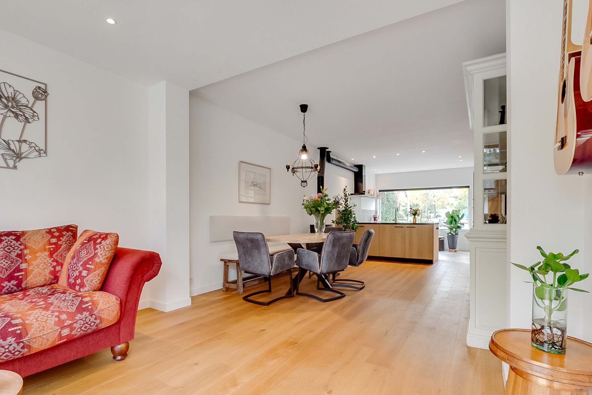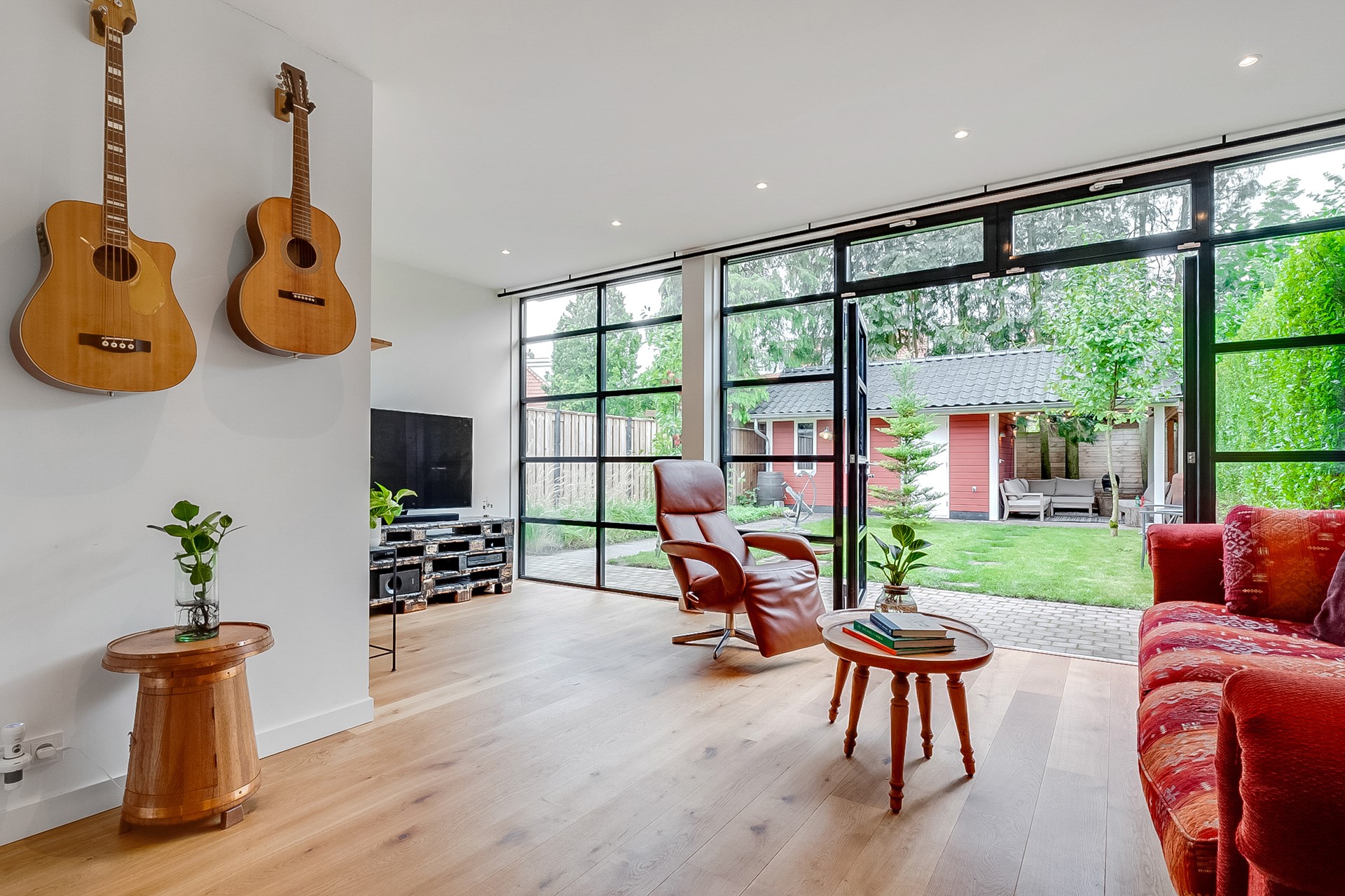Tussen de hal en de woonkamer bevindt zich een fraaie glazen pui met zwarte stalen kozijnen, die zorgt voor extra licht en een stijlvolle doorkijk. Aan de voorzijde ligt de moderne keuken in L-opstelling met wandmeubel en een betonnen werkblad. Aansluitend vindt u de eetkamer met sfeervolle houtkachel. De uitgebouwde woonkamer beschikt over een grote stalen pui met openslaande deuren naar de tuin, die zorgt voor een prachtig zicht op het groen.