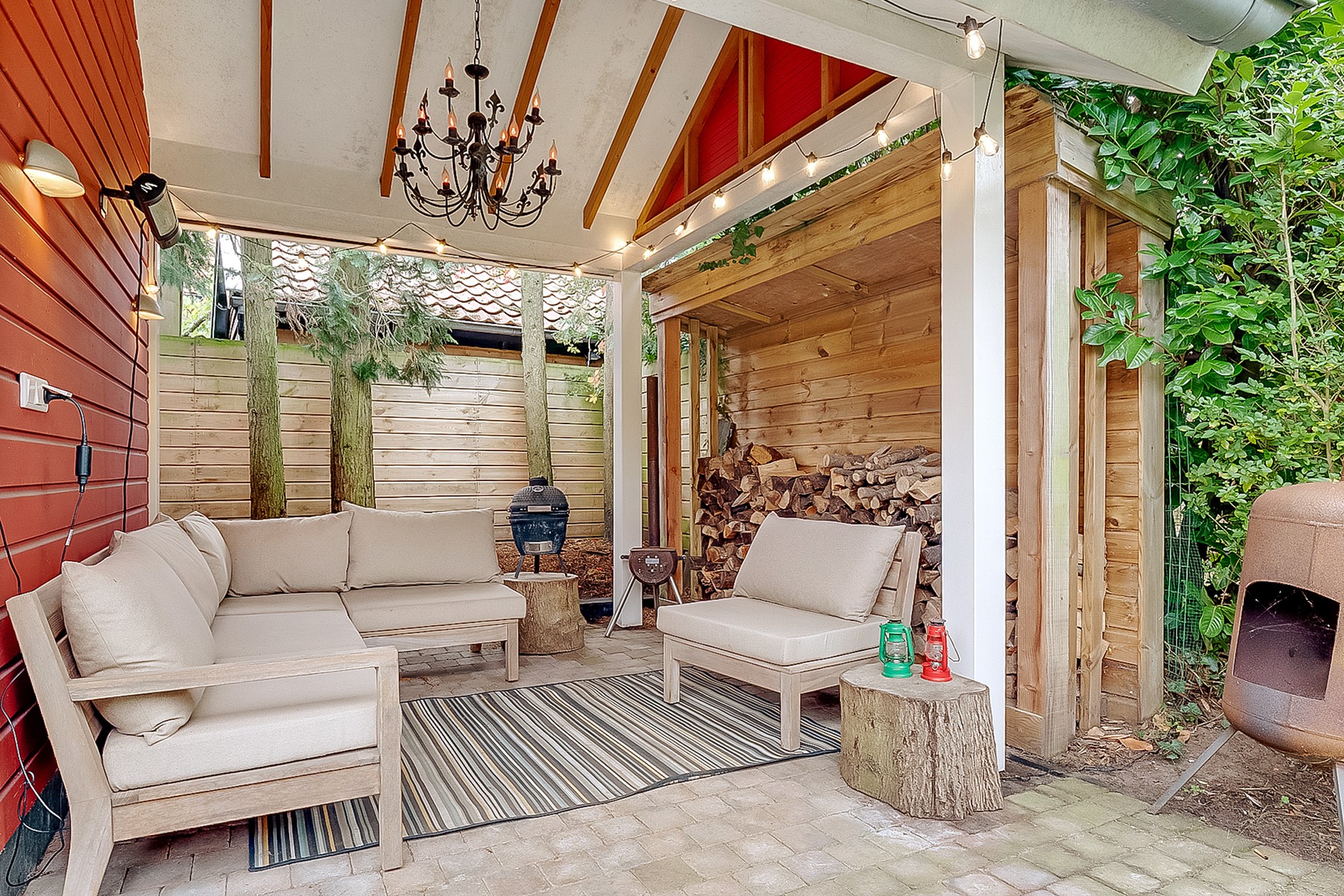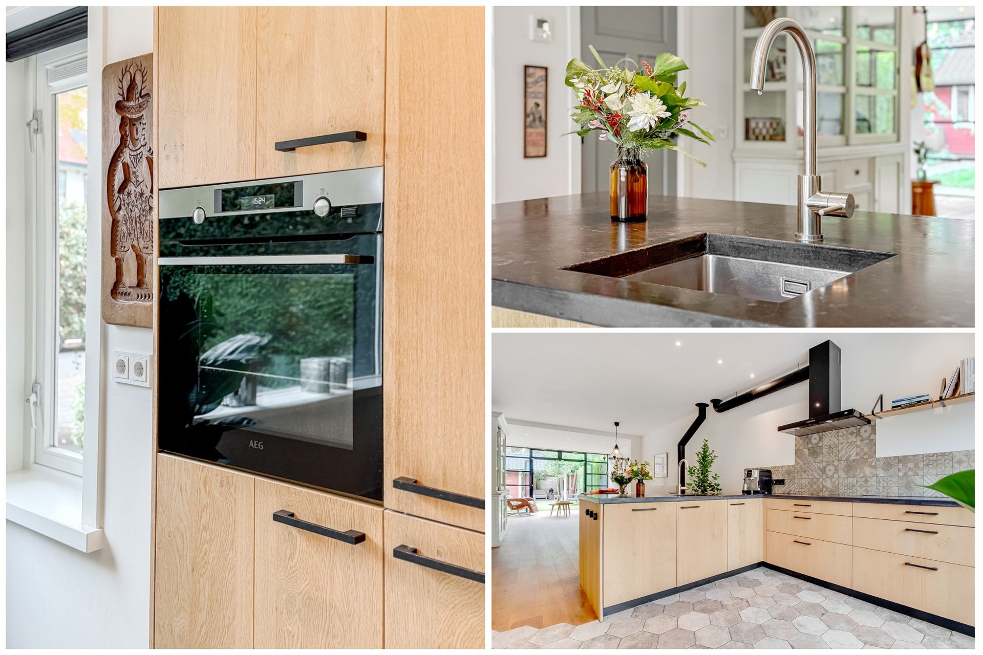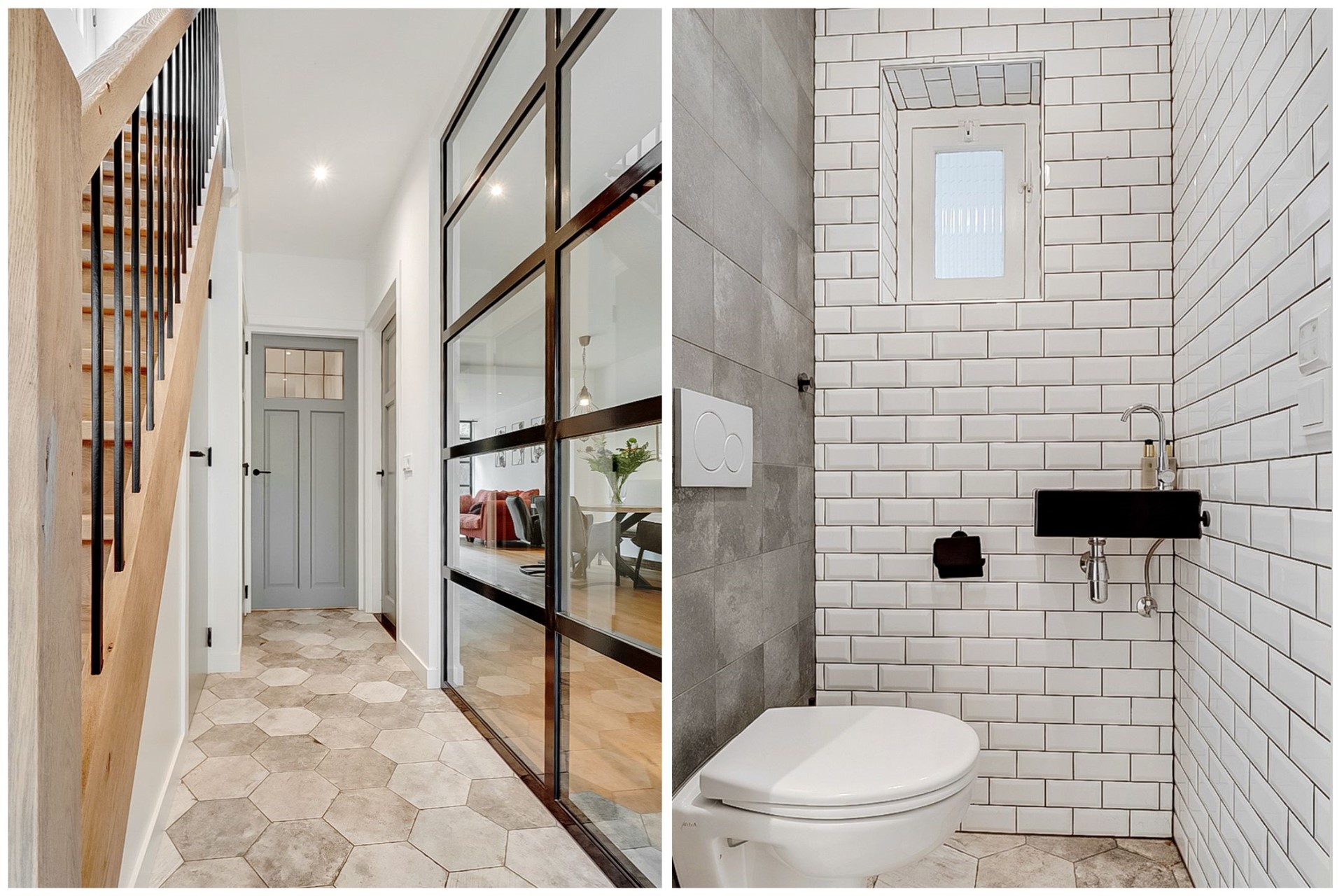 Tussen de hal en de woonkamer bevindt zich een fraaie glazen pui met zwarte stalen kozijnen, die zorgt voor extra licht en een stijlvolle doorkijk. Aan de voorzijde ligt de moderne keuken in L-opstelling met wandmeubel en een betonnen werkblad. Aansluitend vindt u de eetkamer met sfeervolle houtkachel. De uitgebouwde woonkamer beschikt over een grote stalen pui met openslaande deuren naar de tuin, die zorgt voor een prachtig zicht op het groen.