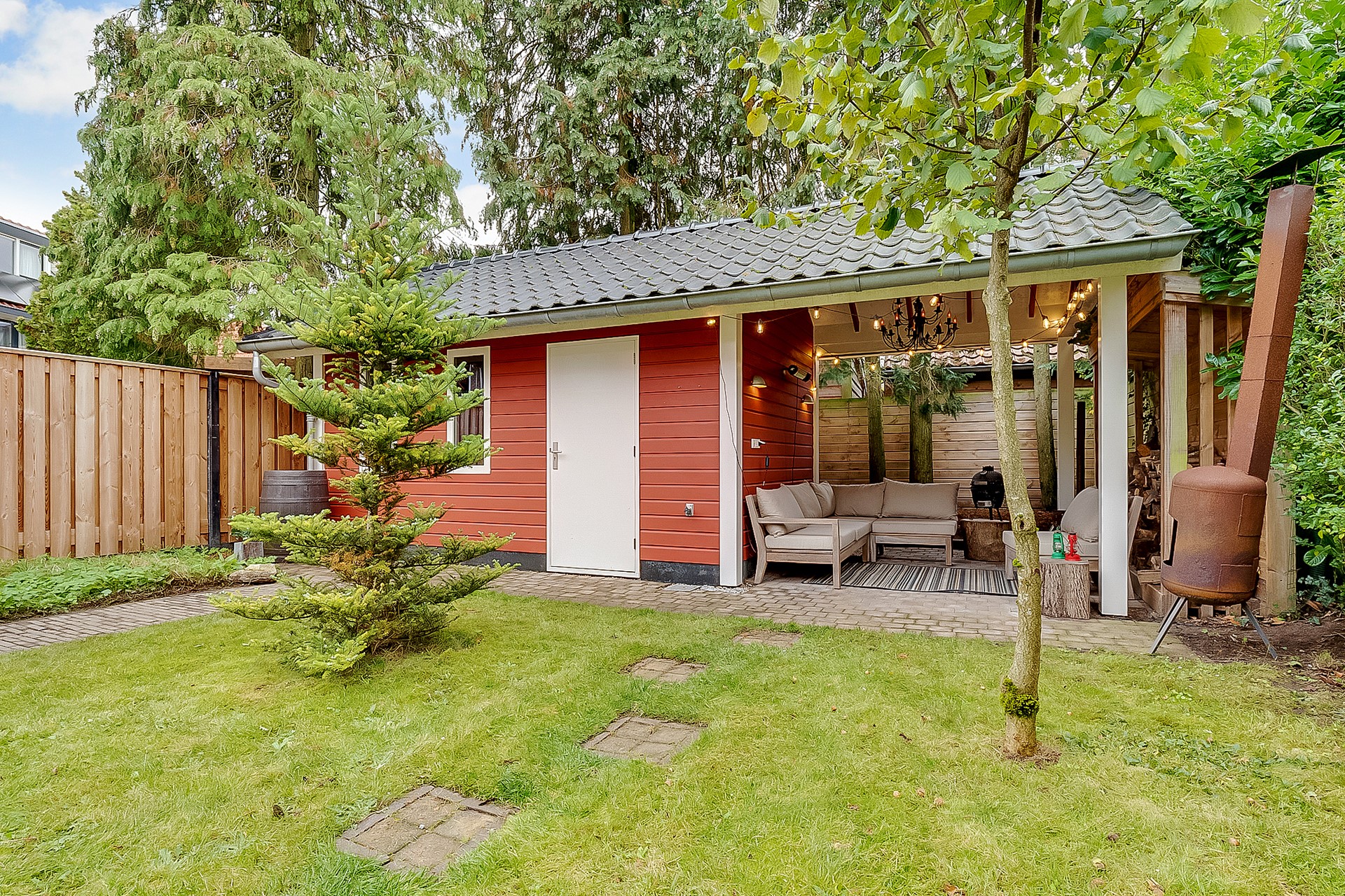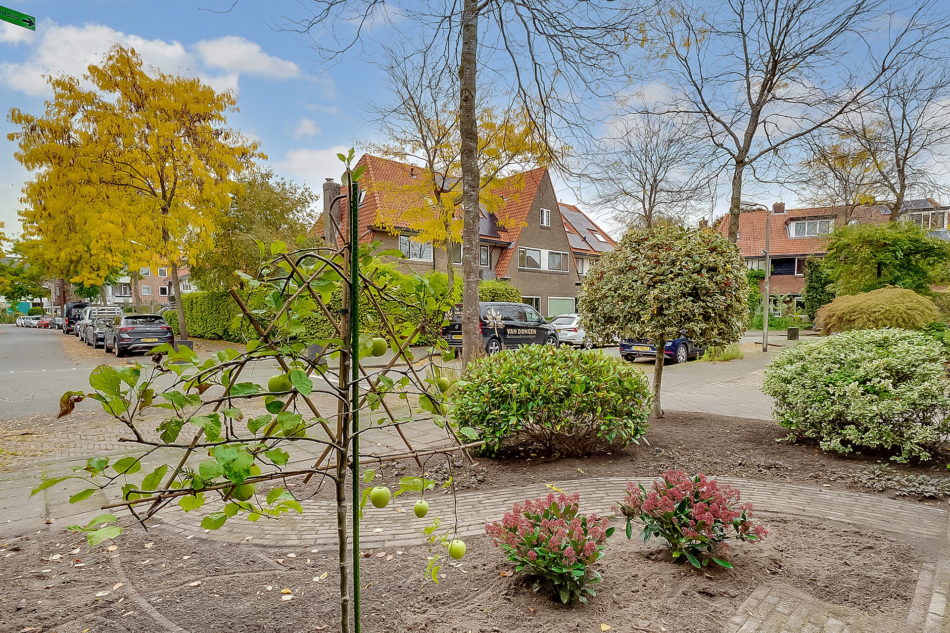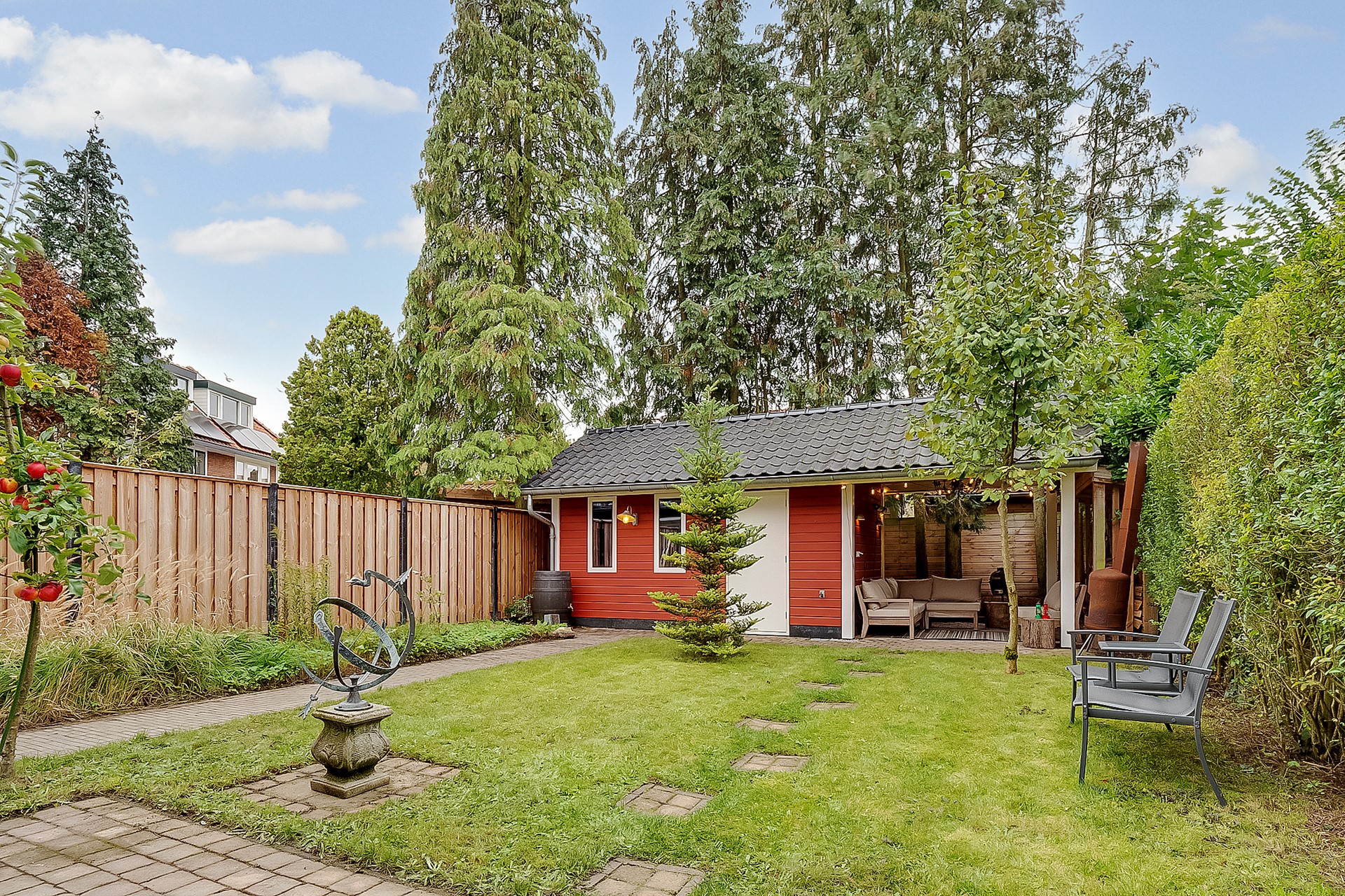 De diepe, zonnige achtertuin (zuidligging) is fraai aangelegd met gazon en borders. Achterin de tuin staat een geïsoleerde berging met naastgelegen overkapping: een heerlijke plek om in de zomer te genieten van het buitenleven. Aan de voorzijde beschikt de woning over een oprit met plaats voor twee auto’s.