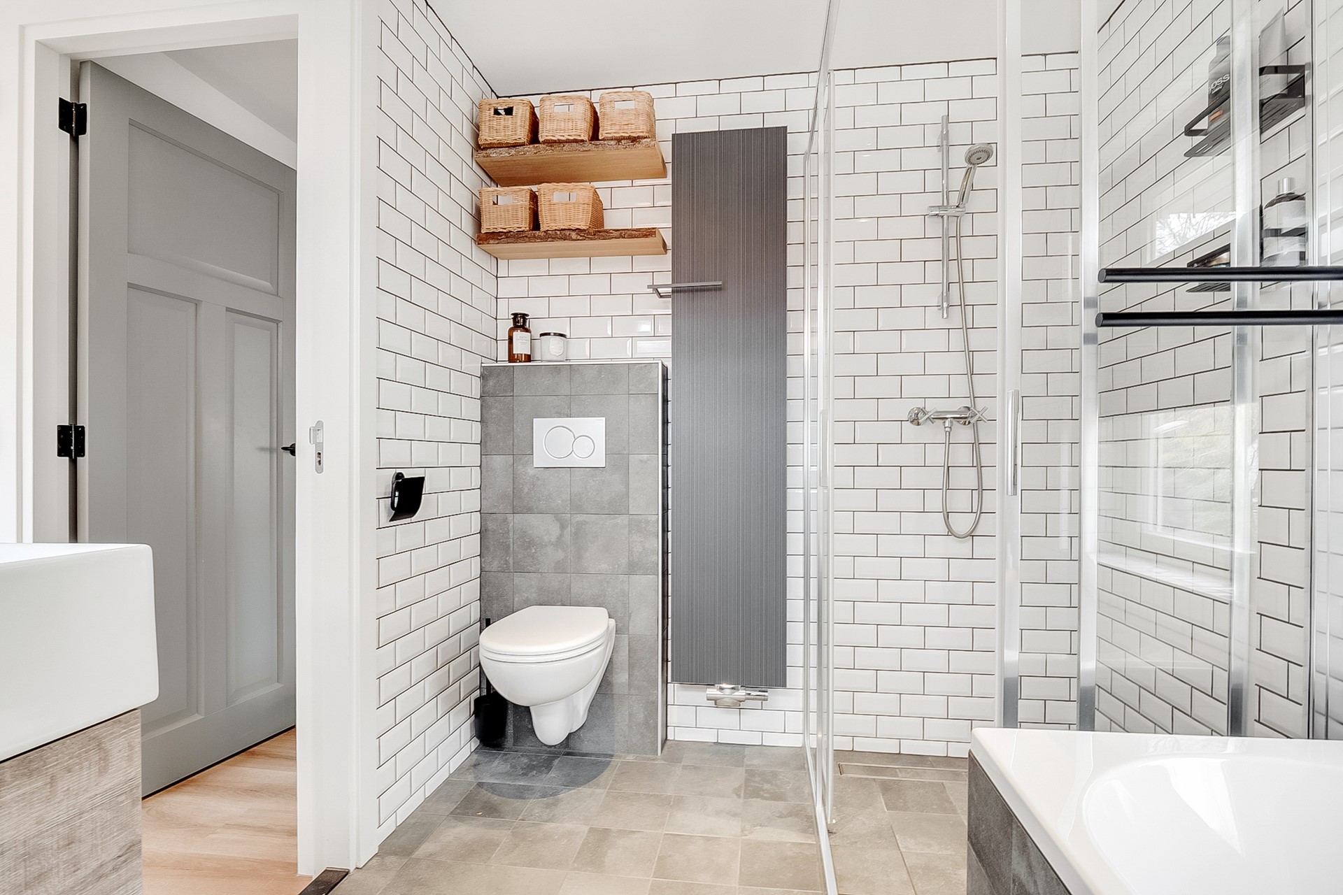 Entree met hal, trapopgang (met nieuwe eikenhouten trap), trapkast en toiletruimte. Vanuit de hal bereikt u de praktische bijkeuken met wasmachineaansluiting. Ook is er toegang tot de aangebouwde berging/garage, die volledig geïsoleerd is, beschikt over krachtstroom en dubbele deuren heeft aan zowel de voor- als achterzijde – ideaal als achterom of multifunctionele werk-/hobbyruimte.