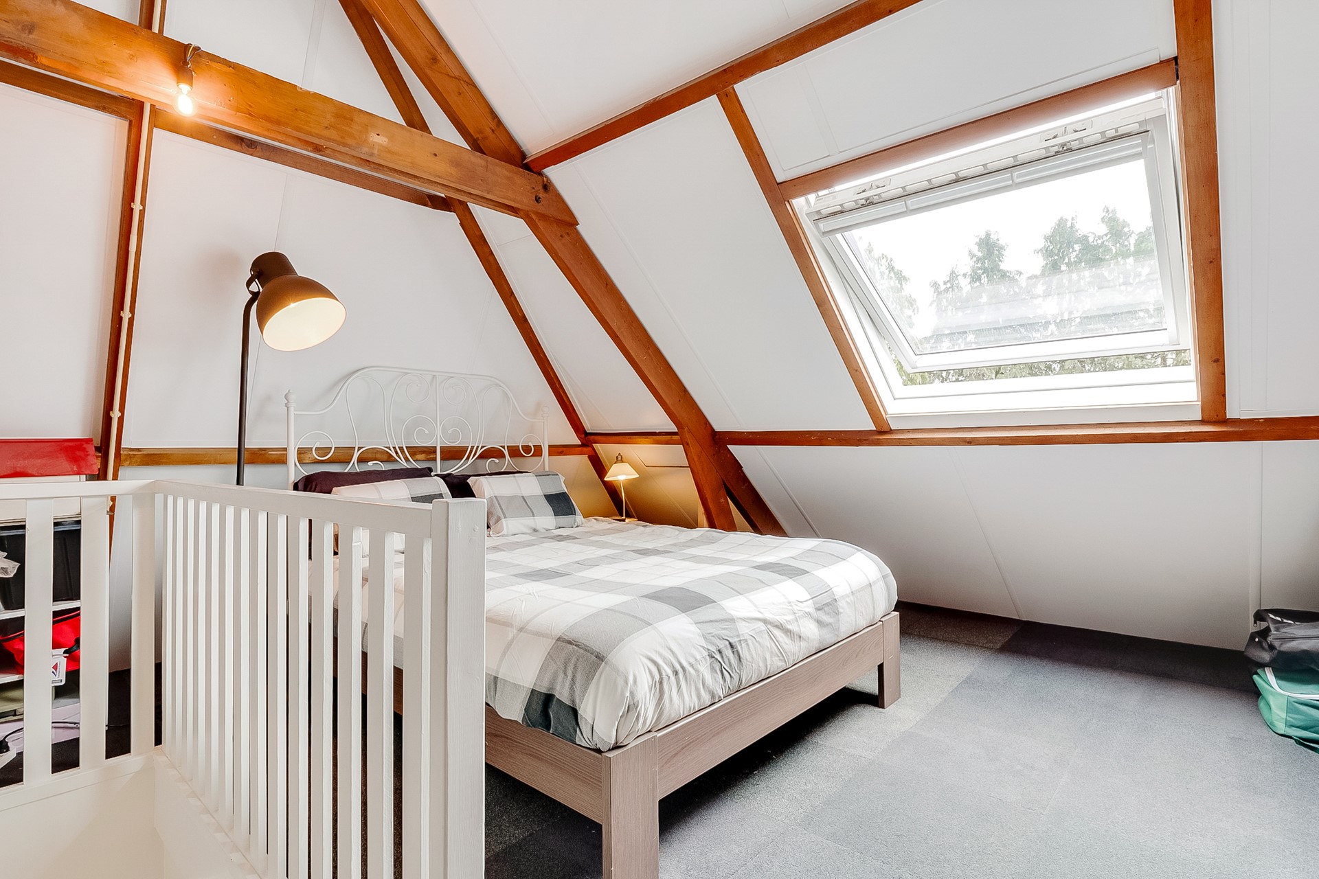 Ruime zolder met hoge nok, dakraam, warmtepomp en boiler. Deze open ruimte wordt nu gebruikt als logeerplek, maar biedt volop mogelijkheden om een extra slaapkamer te realiseren.