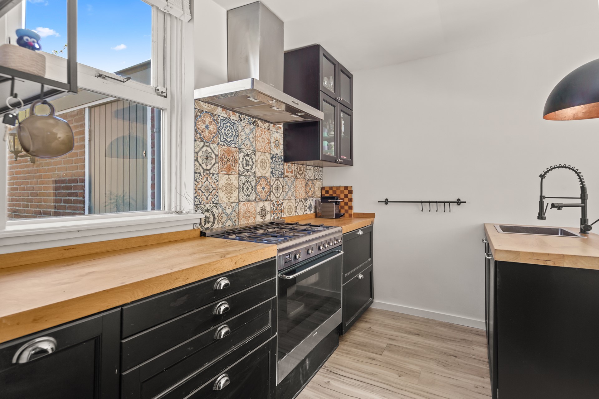 Aan de voorzijde bevindt zich de keuken in antracietkleur, opgesteld in een dubbele opstelling en voorzien van een 5-pits fornuis en vaatwasser.