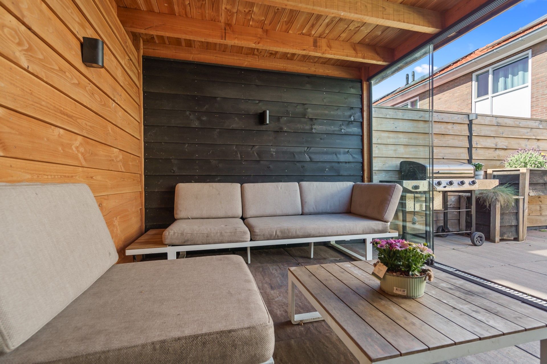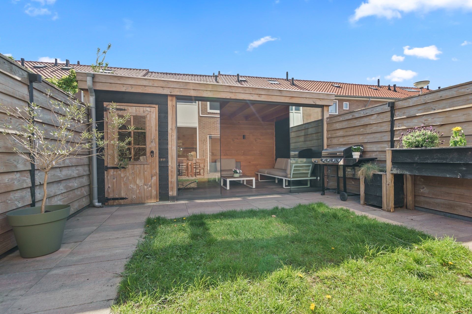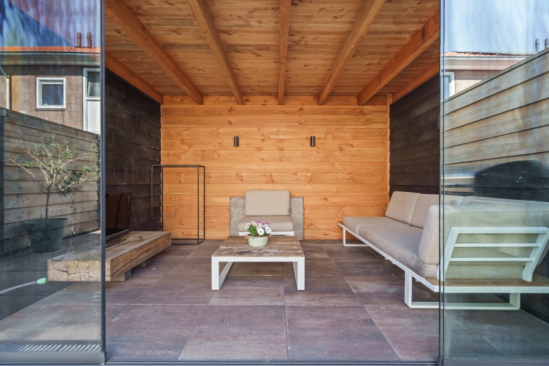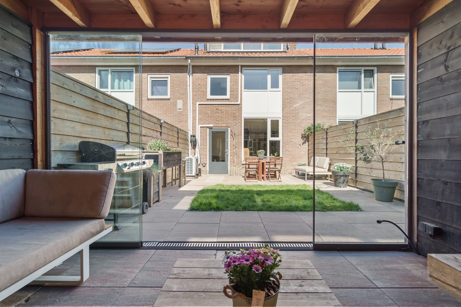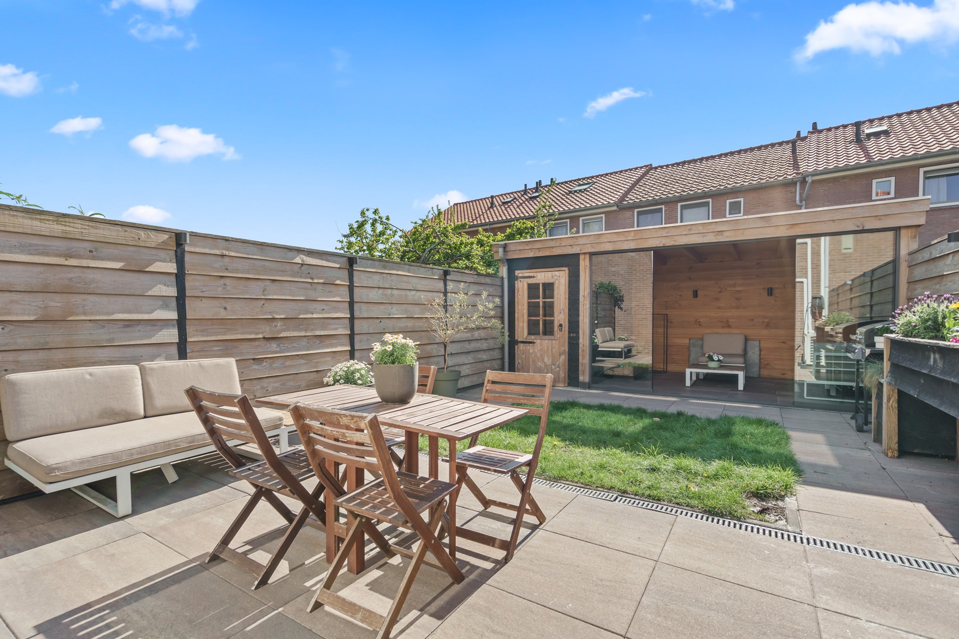De achtertuin op het zuidwesten biedt volop zon en is een fijne plek om te ontspannen. Met de aanwezige overkapping/berging kun je hier ook bij minder weer heerlijk buiten zitten.