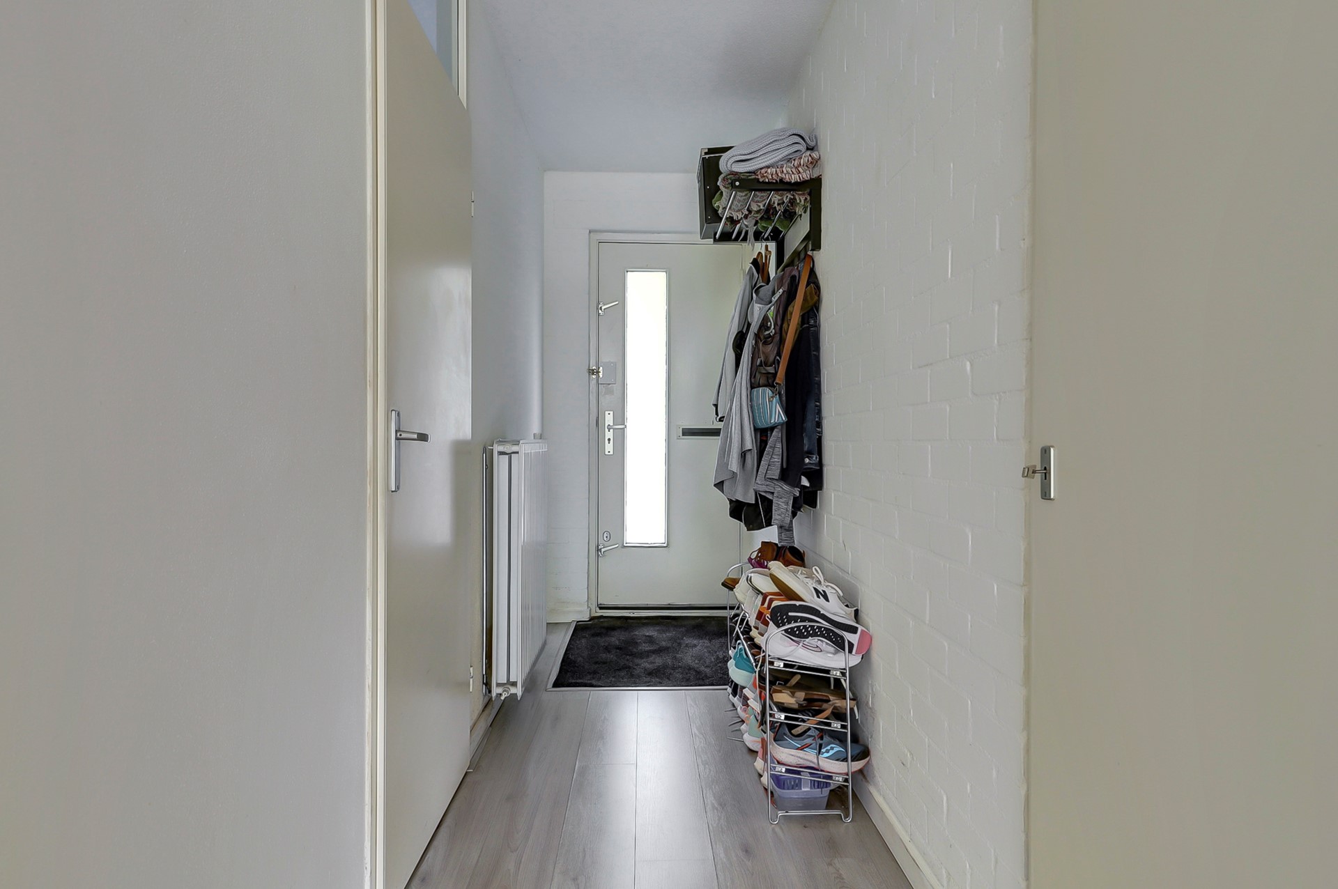Entree met hal en meterkast. Vanuit de hal bereikt u de badkamer, voorzien van douche, wastafelmeubel en toilet. Tegenover de badkamer bevindt zich een aparte wasruimte met aansluiting voor wasapparatuur en de opstelling van de cv-ketel.