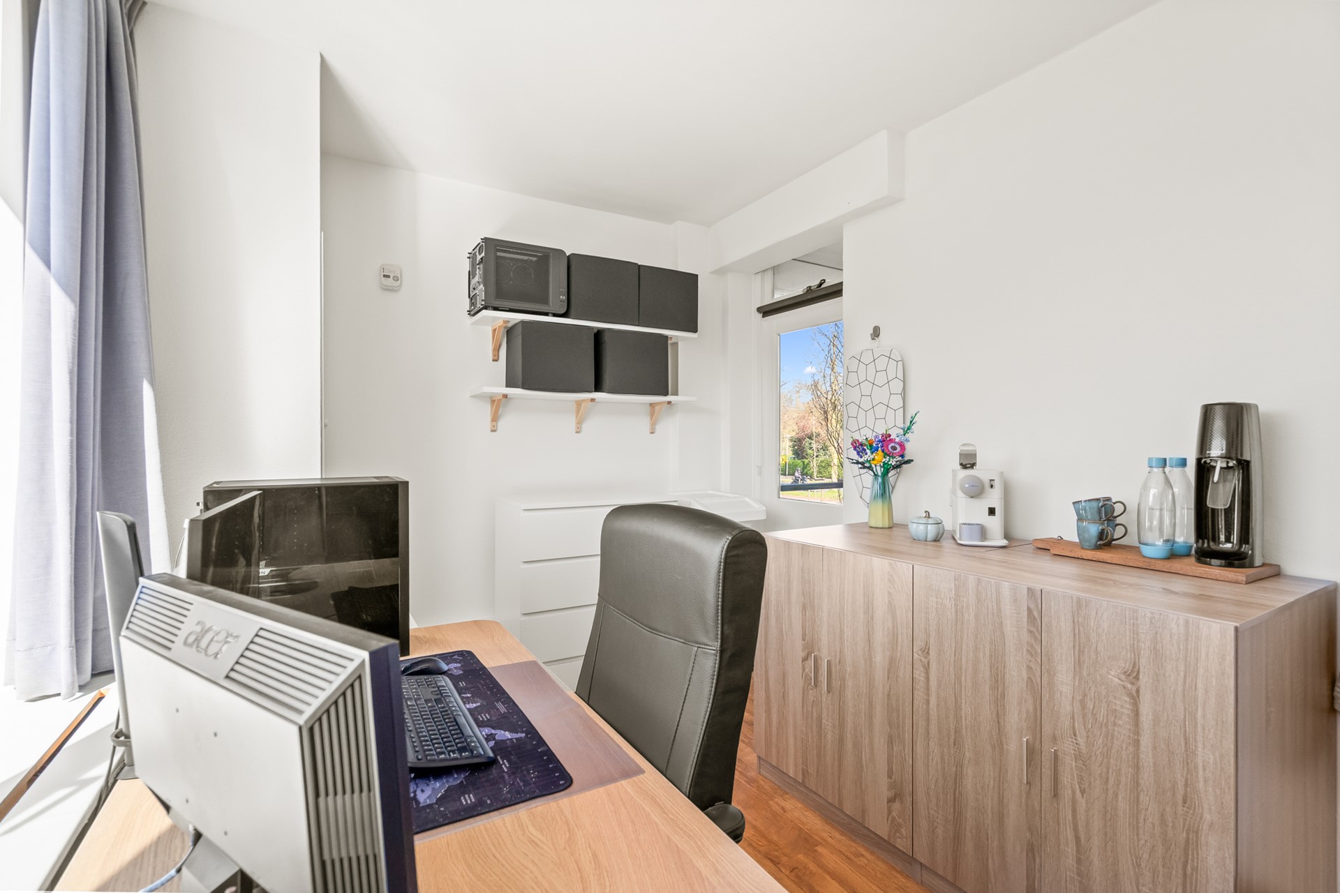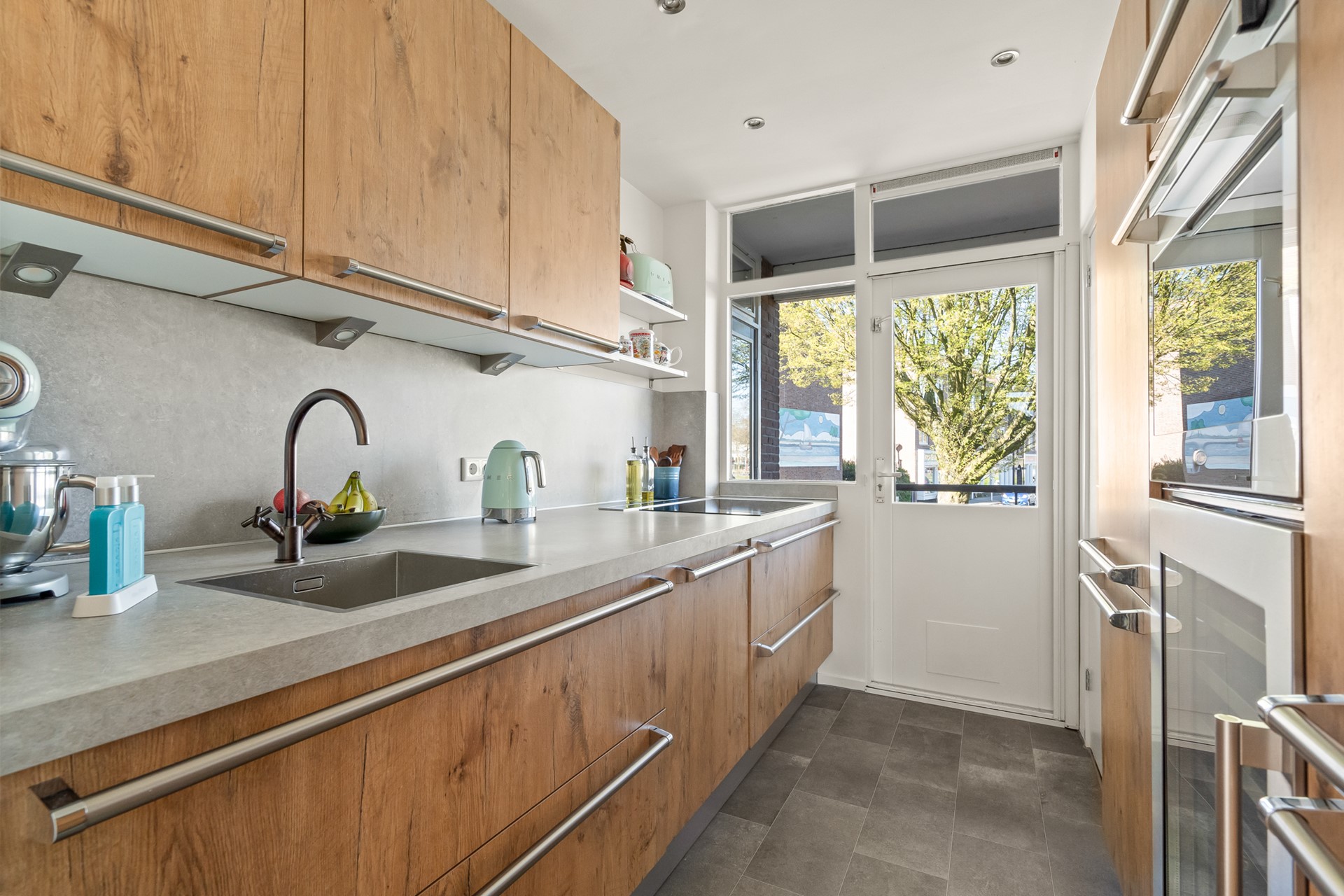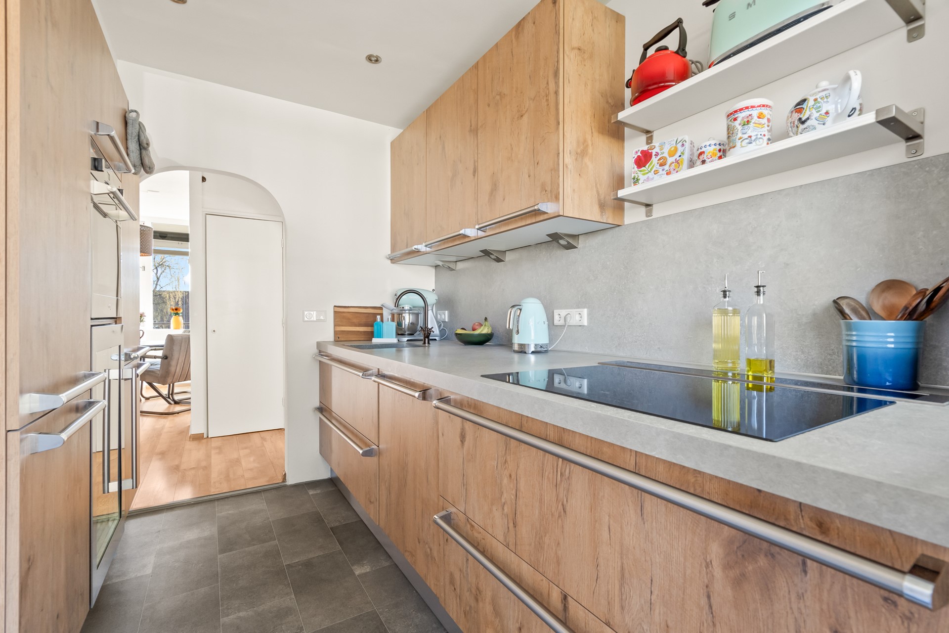 De moderne keuken uit (2019) is een echte eyecatcher. Met een strakke dubbele opstelling en hoogwaardige inbouwapparatuur waaronder een downdraft afzuigkap, inductiekookplaat, oven, vaatwasser, koel-/vriescombinatie en een wijnklimaatkast is dit een ideale plek voor kookliefhebbers. Vanuit de keuken is er eveneens toegang tot een van de balkons wat zorgt voor extra licht en een fijne verbinding met buiten.