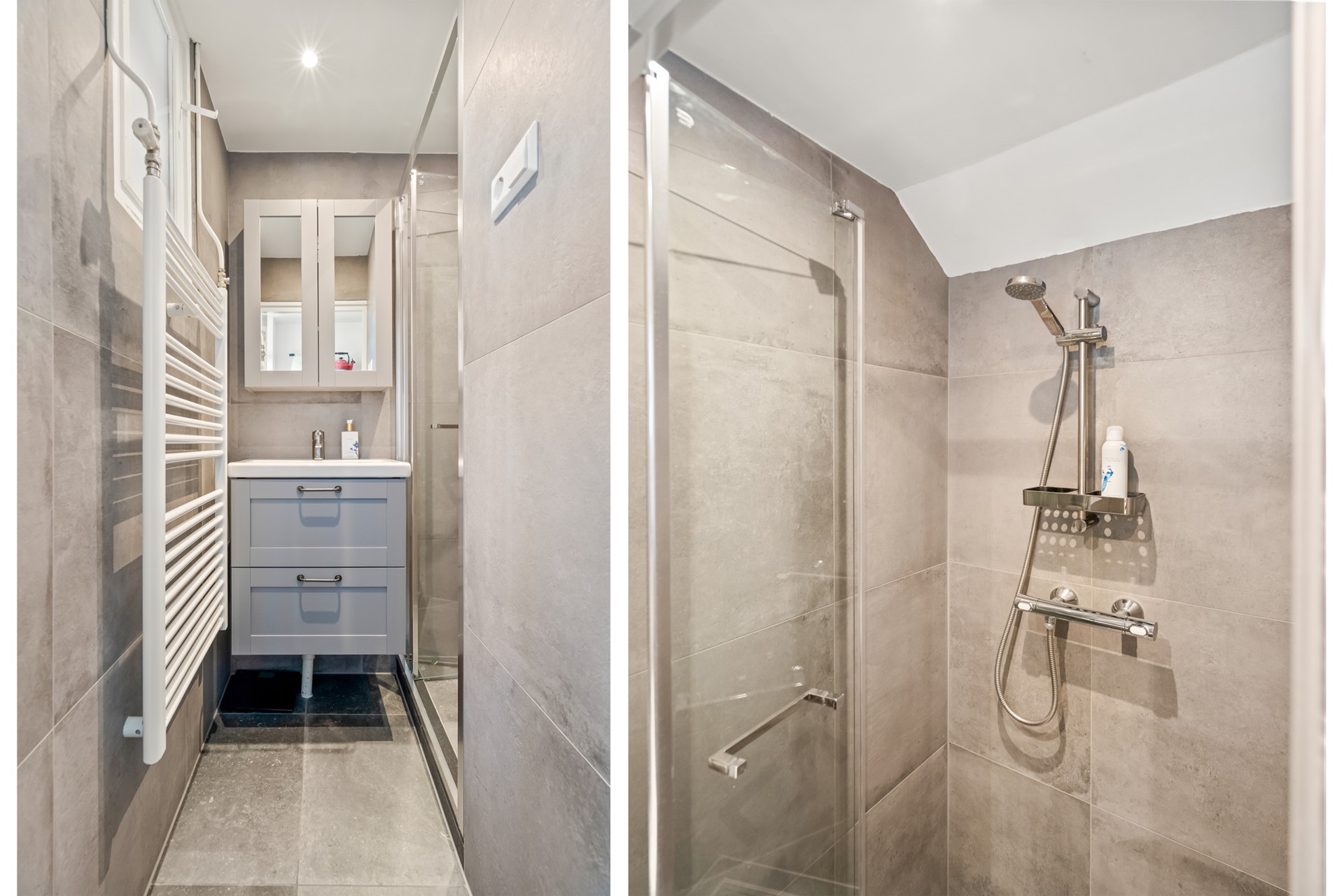 De moderne badkamer (2022) is stijlvol afgewerkt en voorzien van een comfortabele inloopdouche en een strakke wastafel.