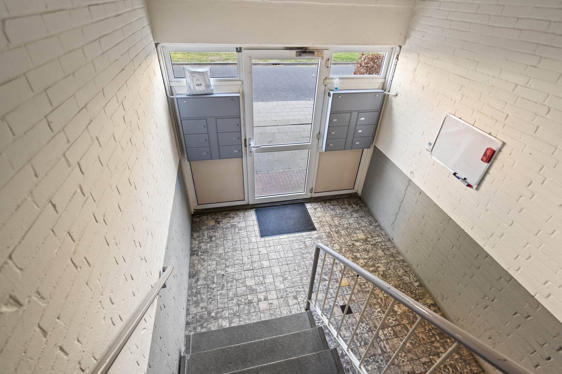 Je komt binnen via de centrale entree met bellentableau, postbussen en toegang tot de inpandige bergingen en de gezamenlijke fietsenstalling.