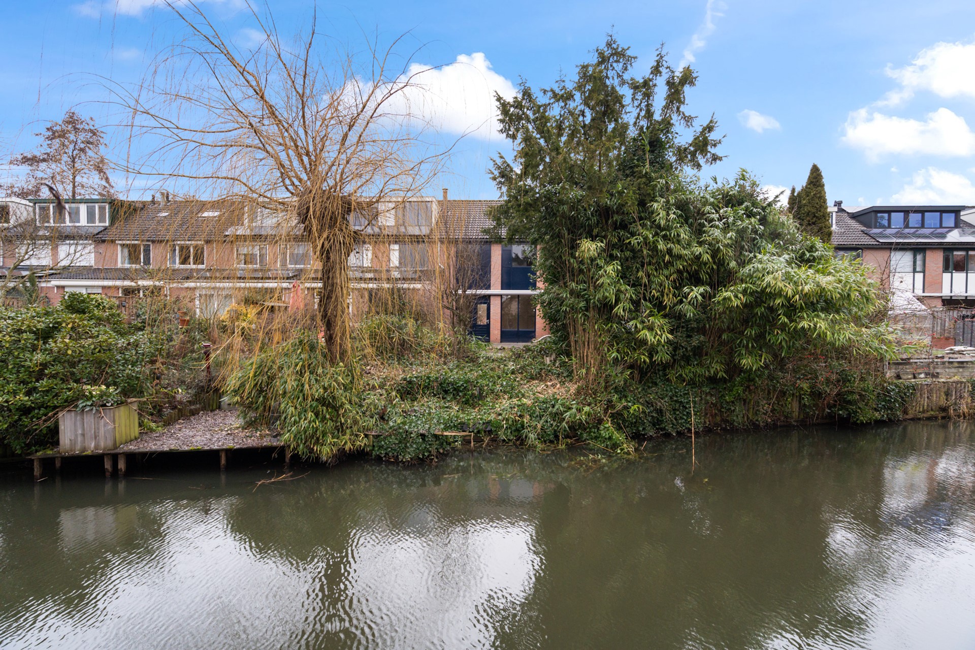 De diepe achtertuin ligt vrij aan het water en vormt een prachtig verlengstuk van de woning. Met wat aandacht is hier een heerlijke tuin aan het water te realiseren, met ruimte voor terrassen, groen en ontspanning.