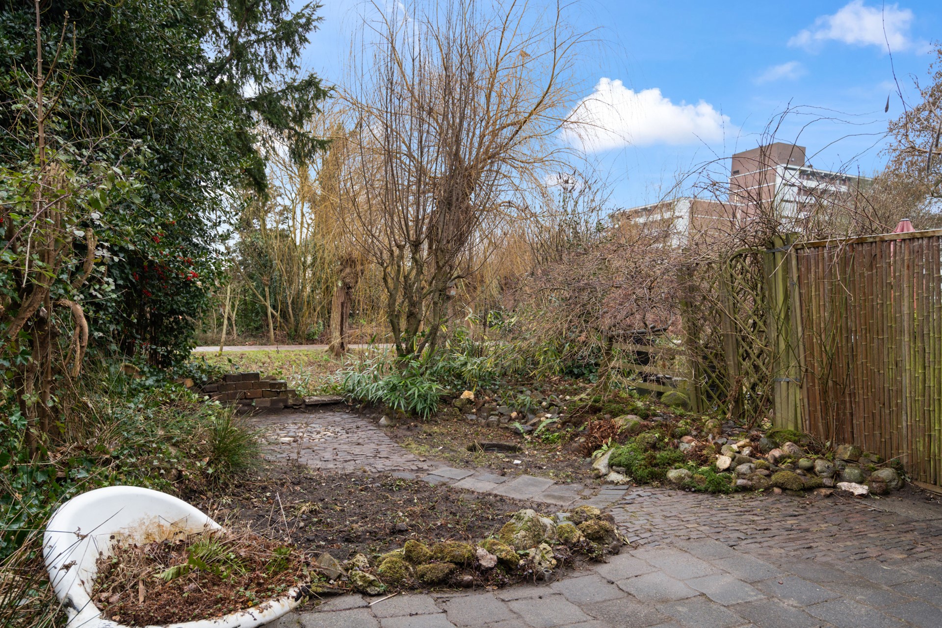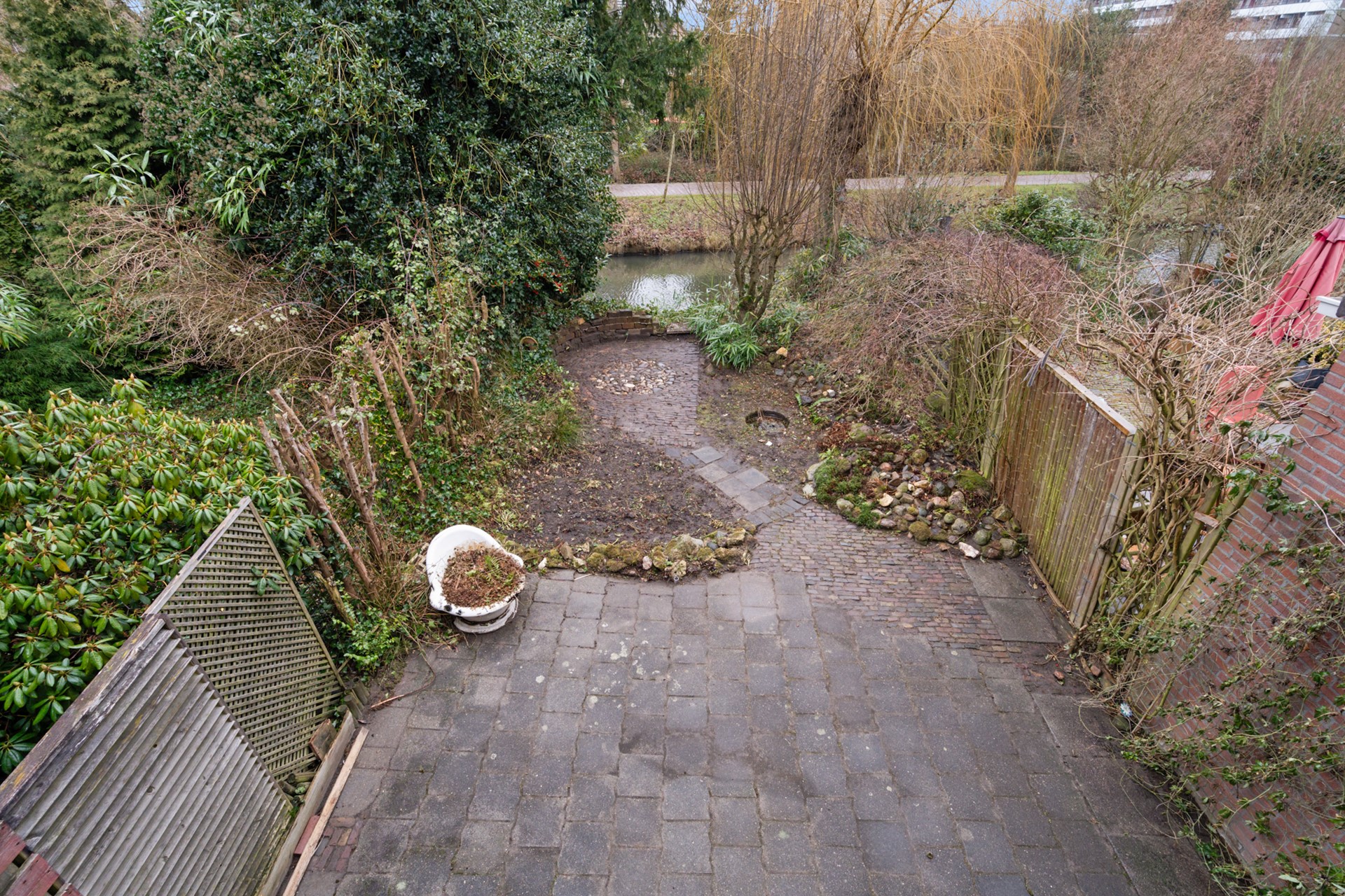 De diepe achtertuin ligt vrij aan het water en vormt een prachtig verlengstuk van de woning. Met wat aandacht is hier een heerlijke tuin aan het water te realiseren, met ruimte voor terrassen, groen en ontspanning.