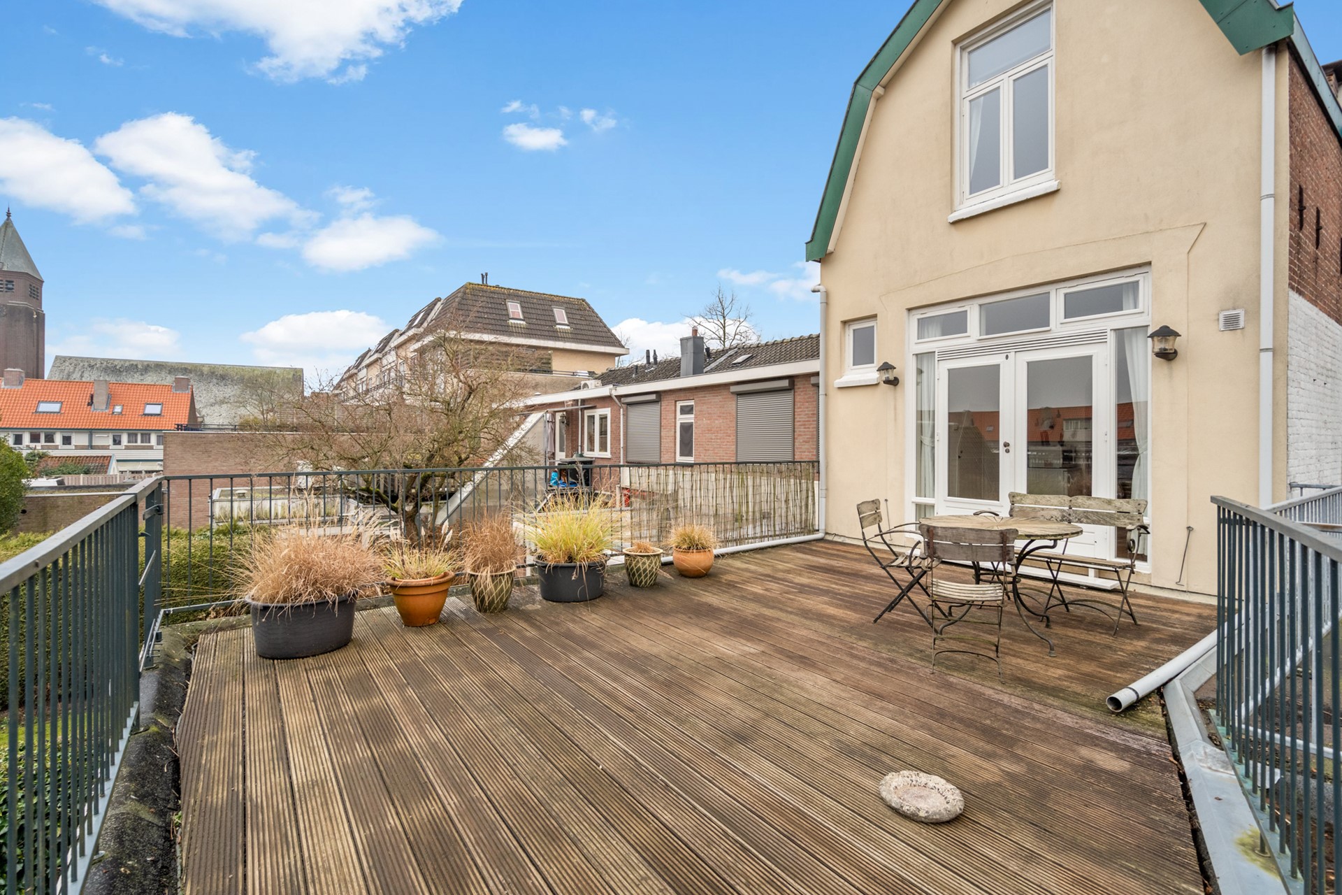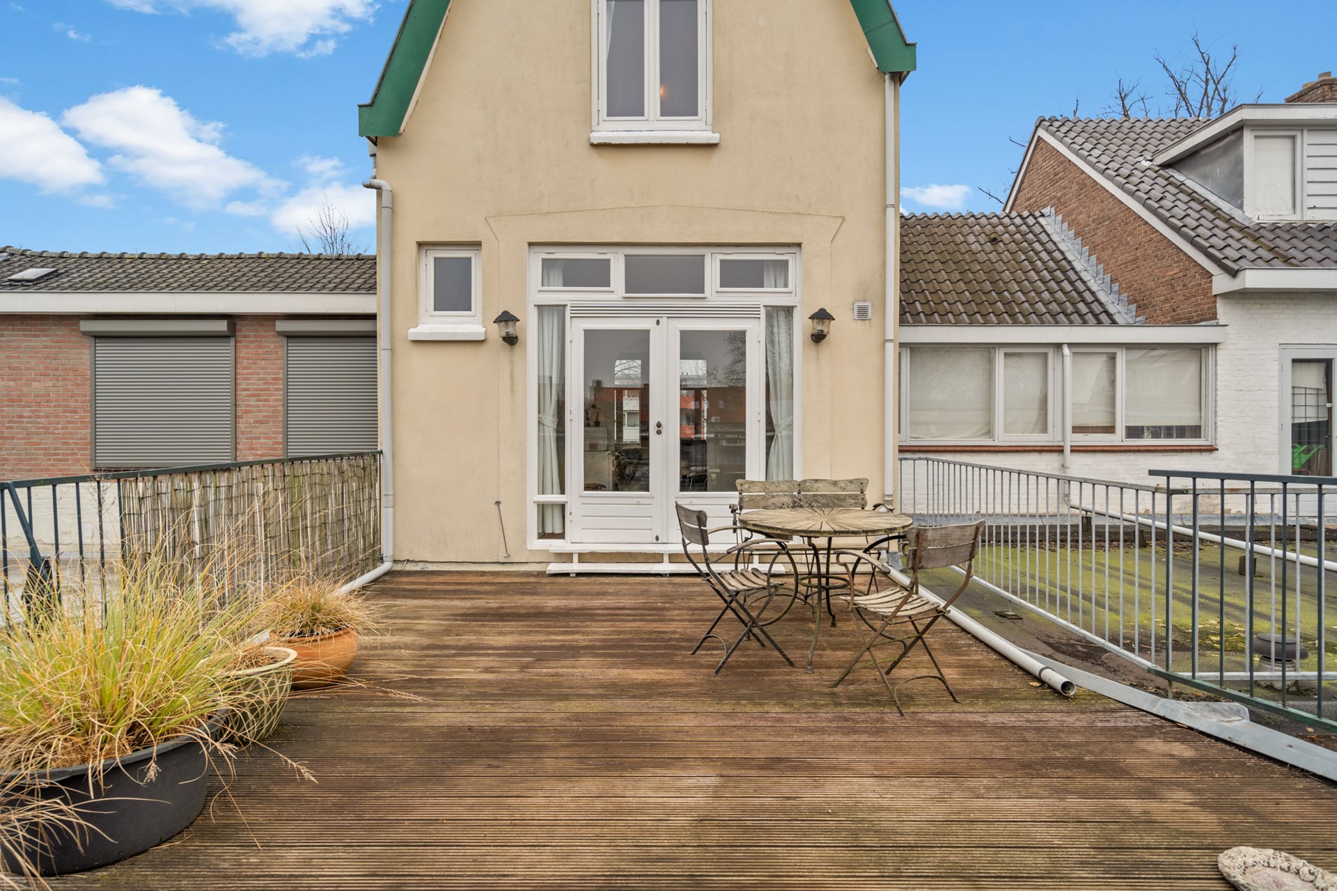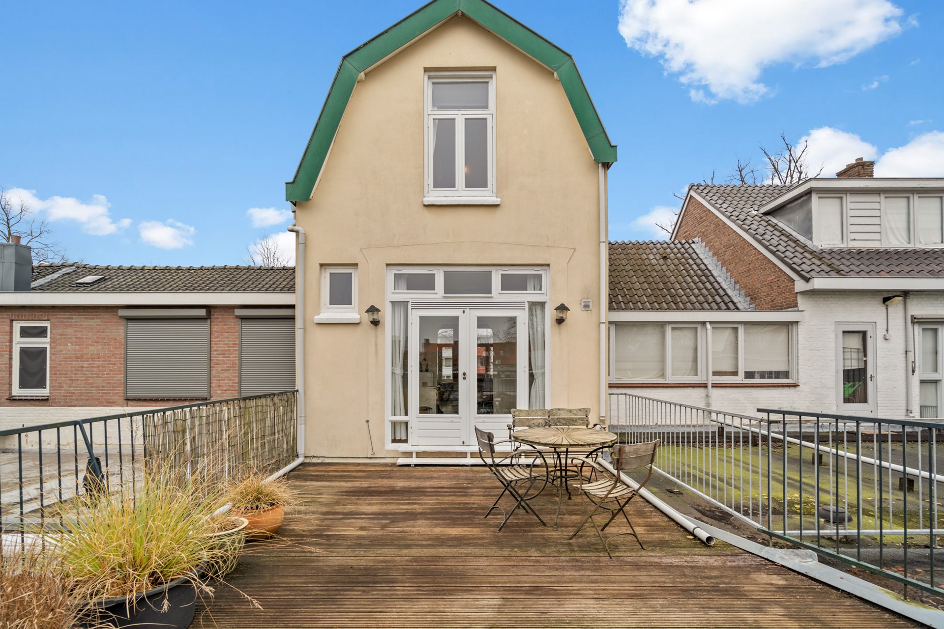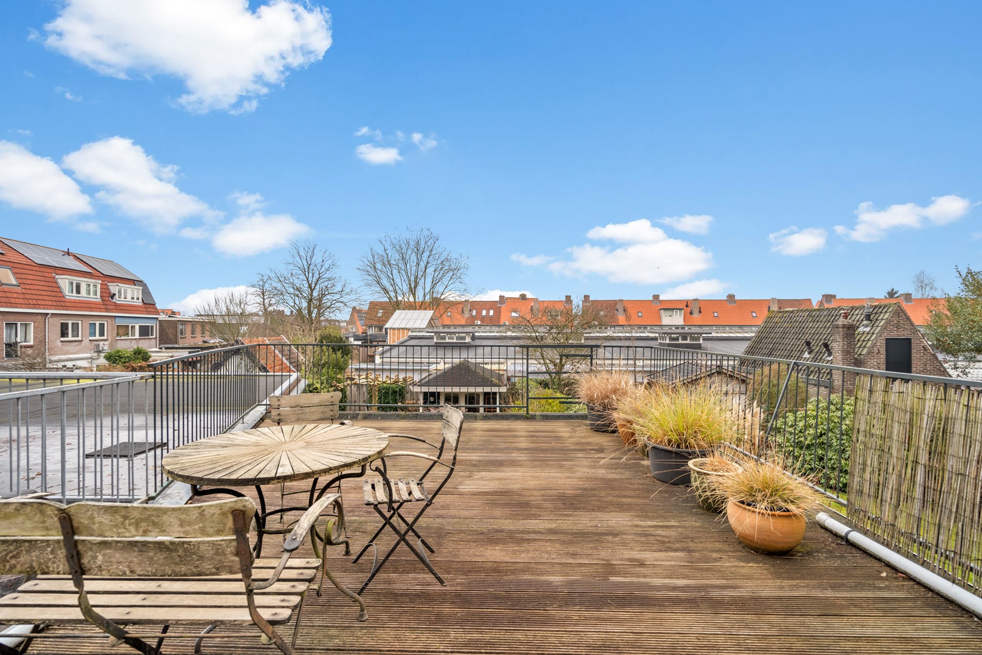 Aan de achterzijde bevindt zich de keuken met voorraadkast en trapopgang naar de tweede verdieping. Vanuit hier stap je zo het royale dakterras op: een verrassend grote en beschutte buitenruimte met veel privacy – perfect om lange avonden buiten te zitten, te eten of te ontspannen.
