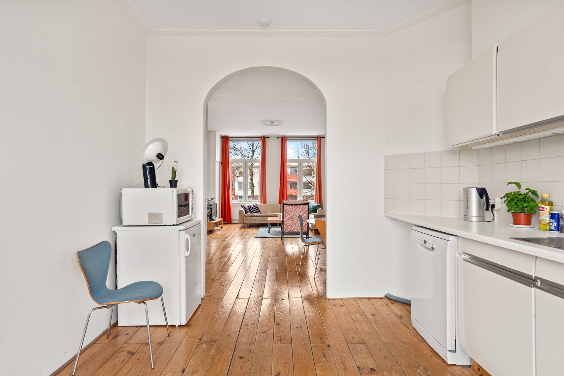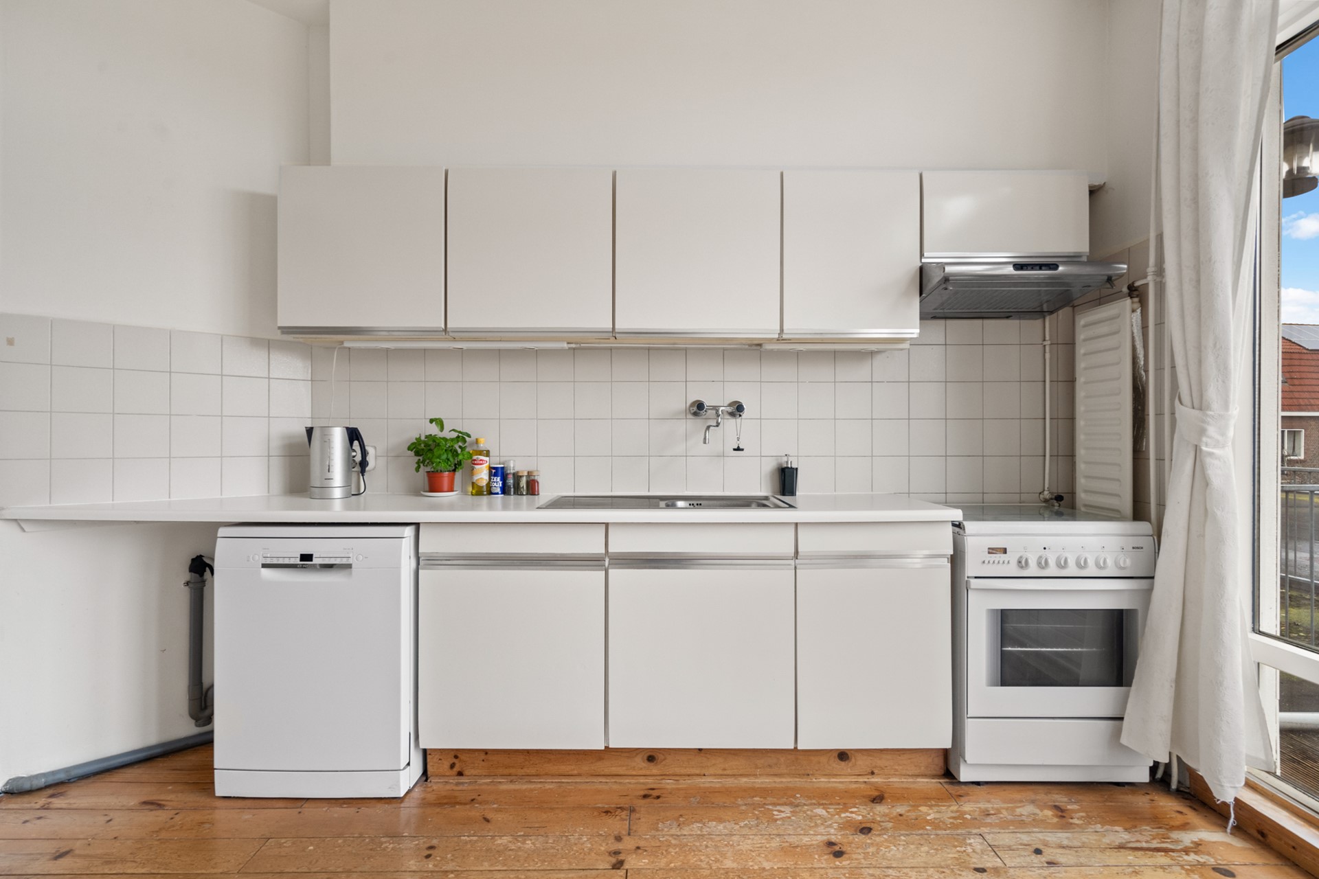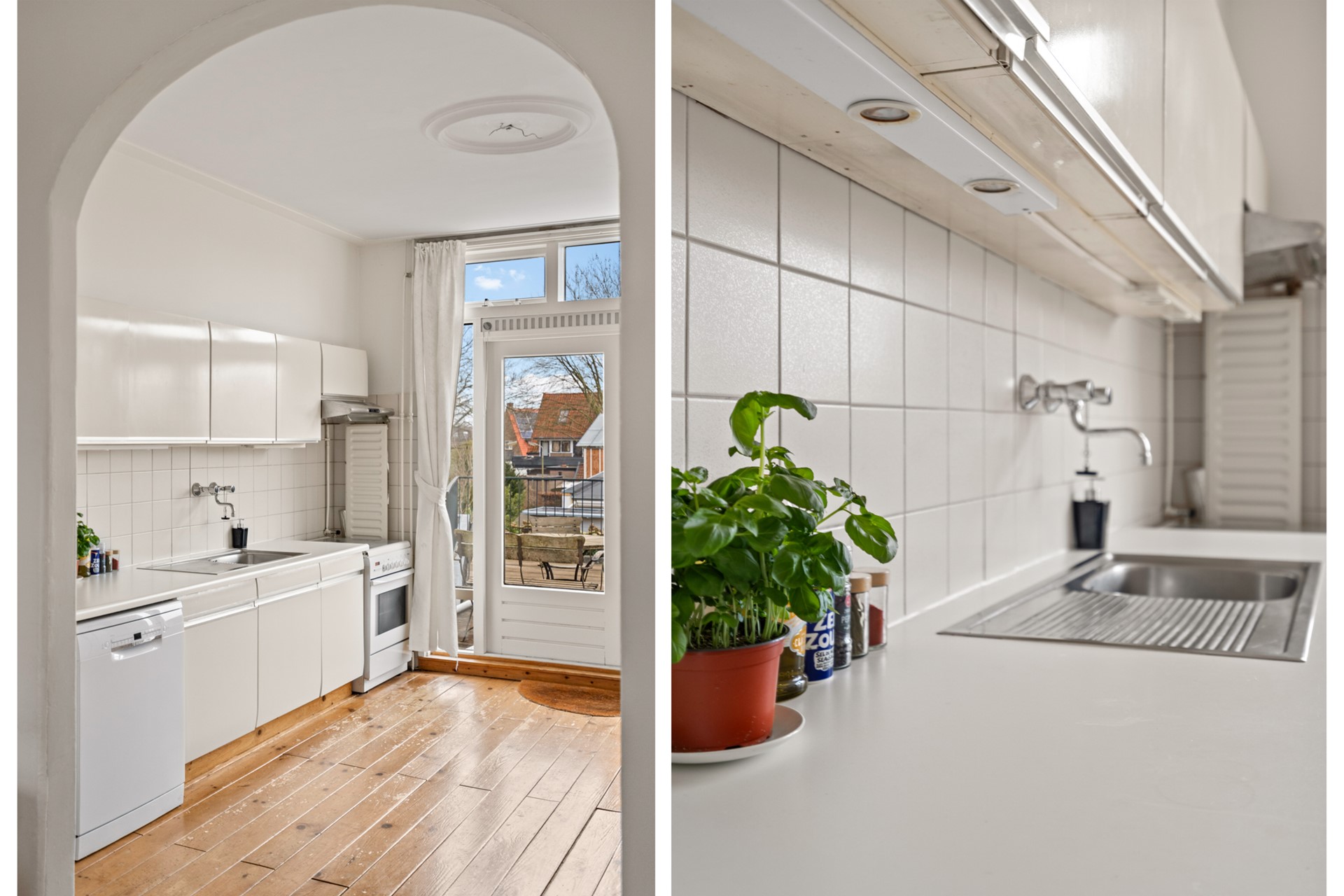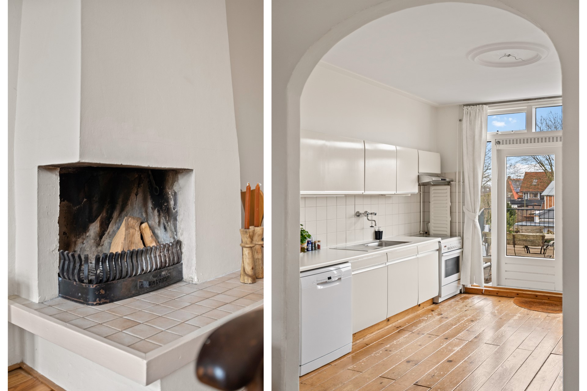 Aan de achterzijde bevindt zich de keuken met voorraadkast en trapopgang naar de tweede verdieping. Vanuit hier stap je zo het royale dakterras op: een verrassend grote en beschutte buitenruimte met veel privacy – perfect om lange avonden buiten te zitten, te eten of te ontspannen.