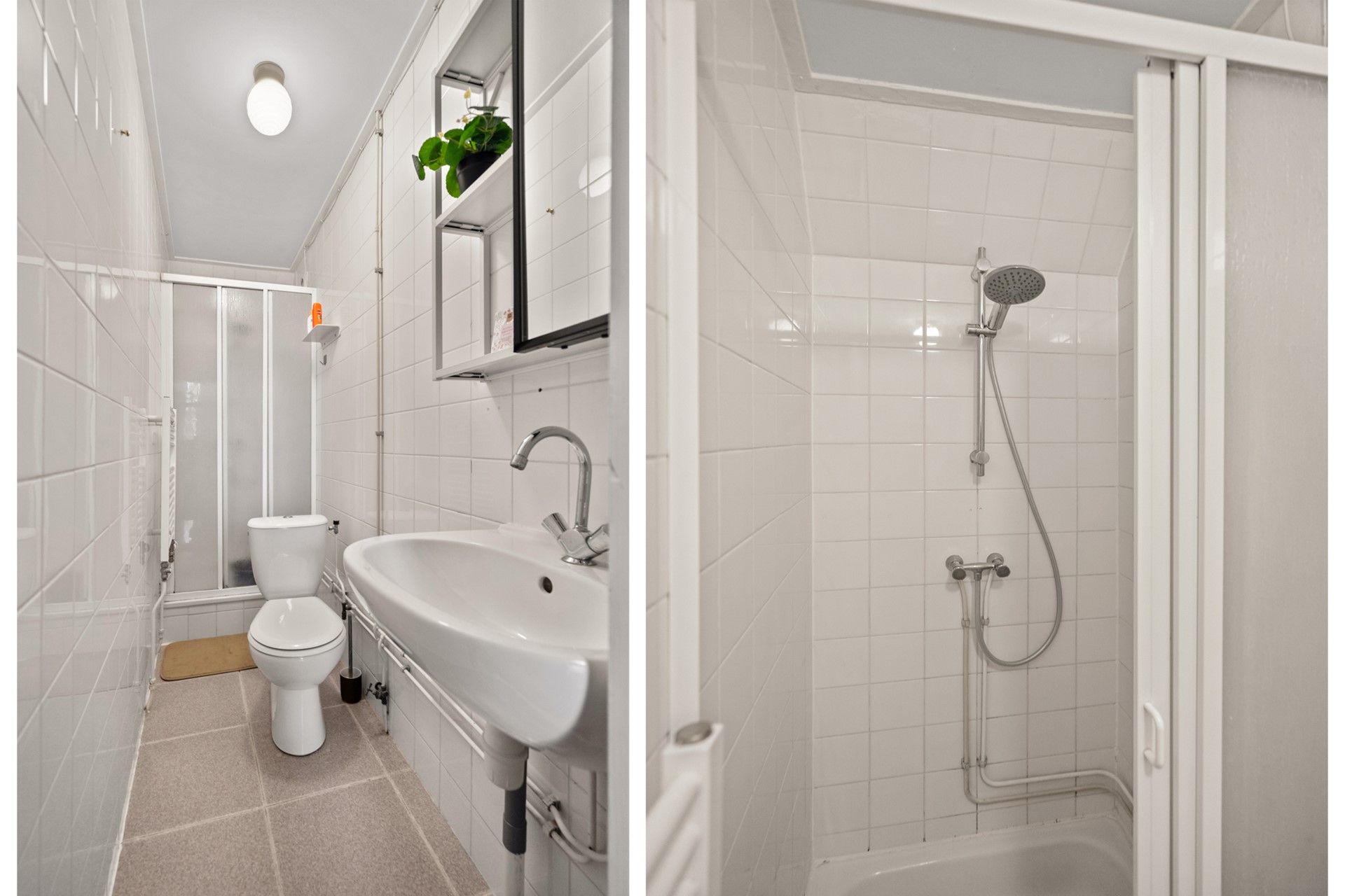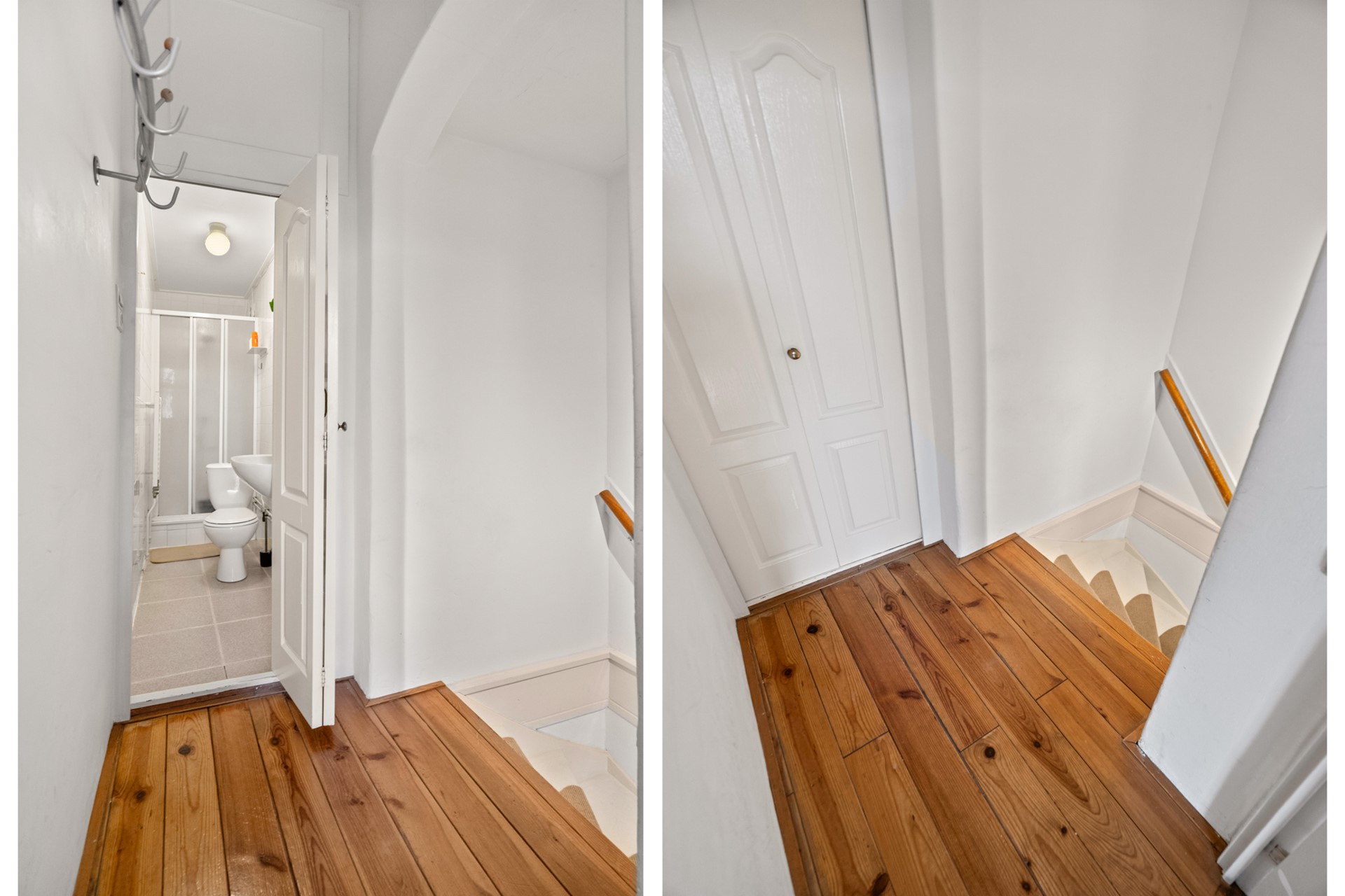 Overloop met toegang tot de badkamer, voorzien van toilet, douche en wastafel.