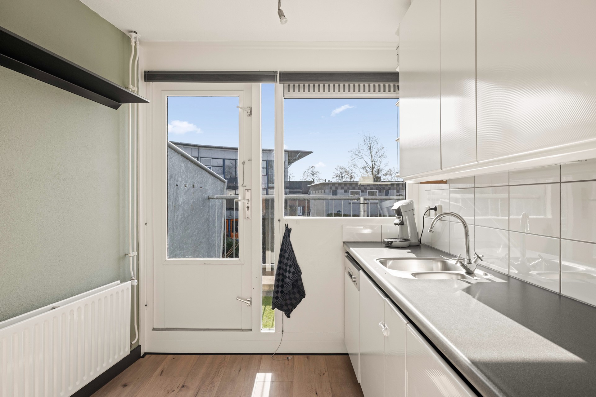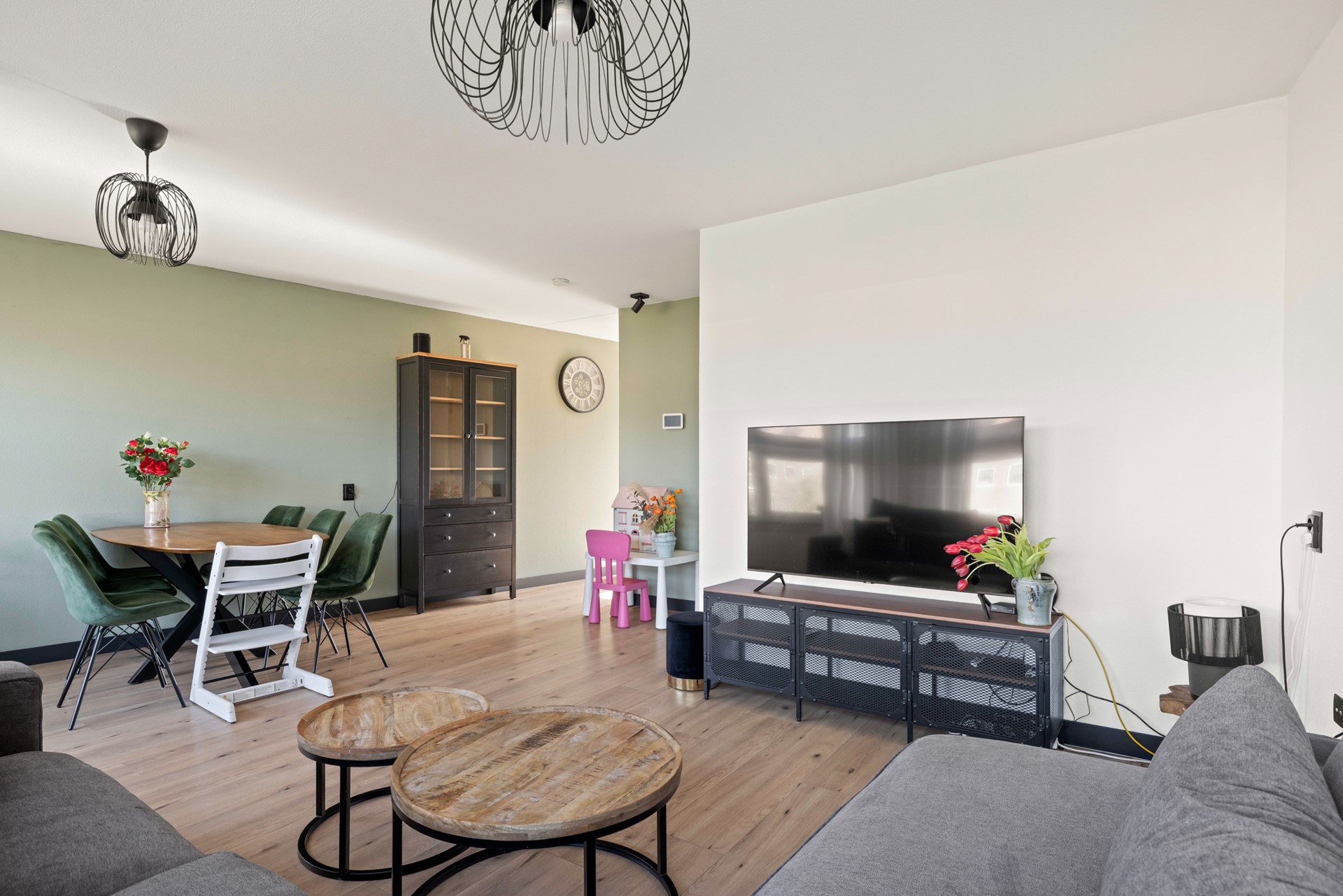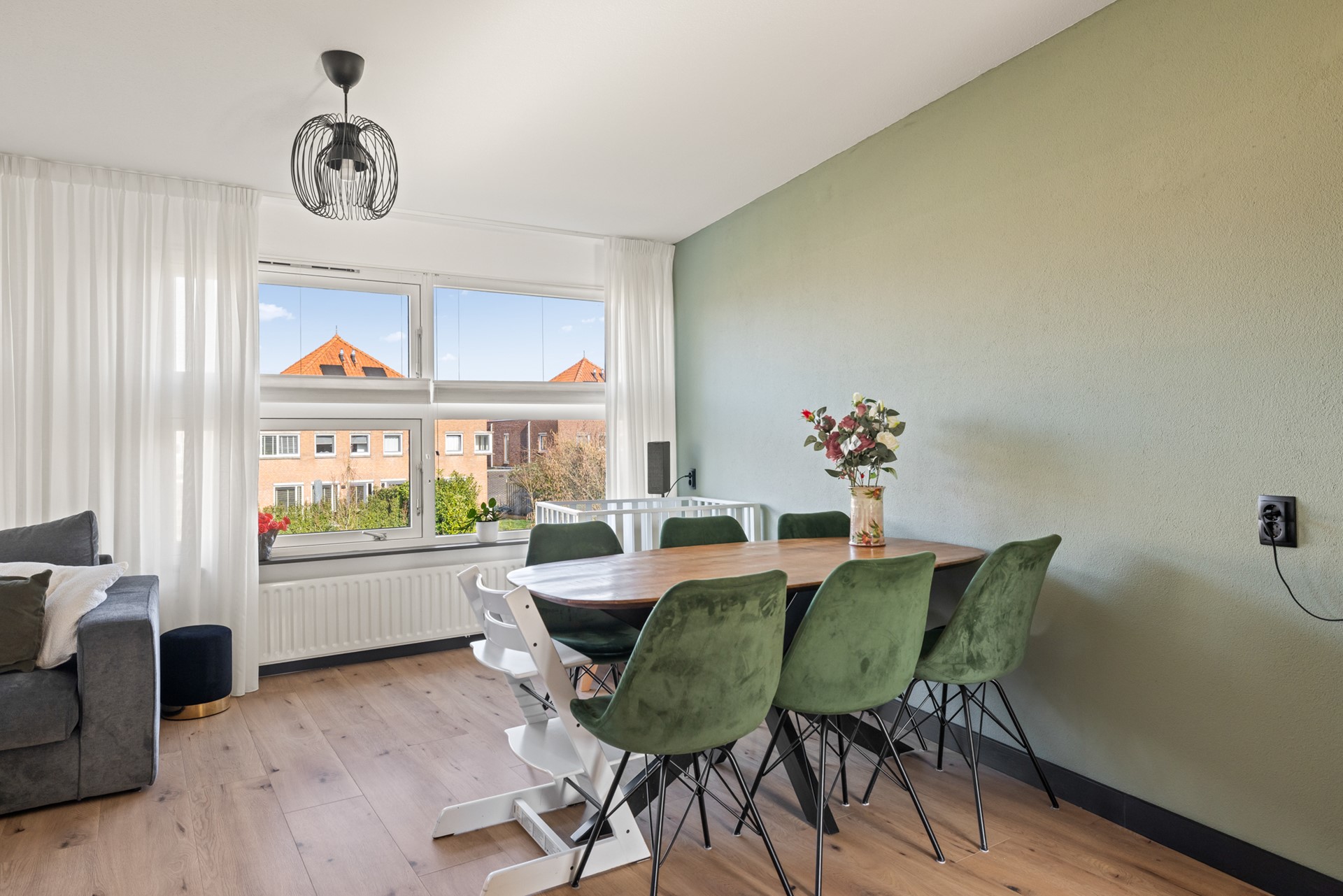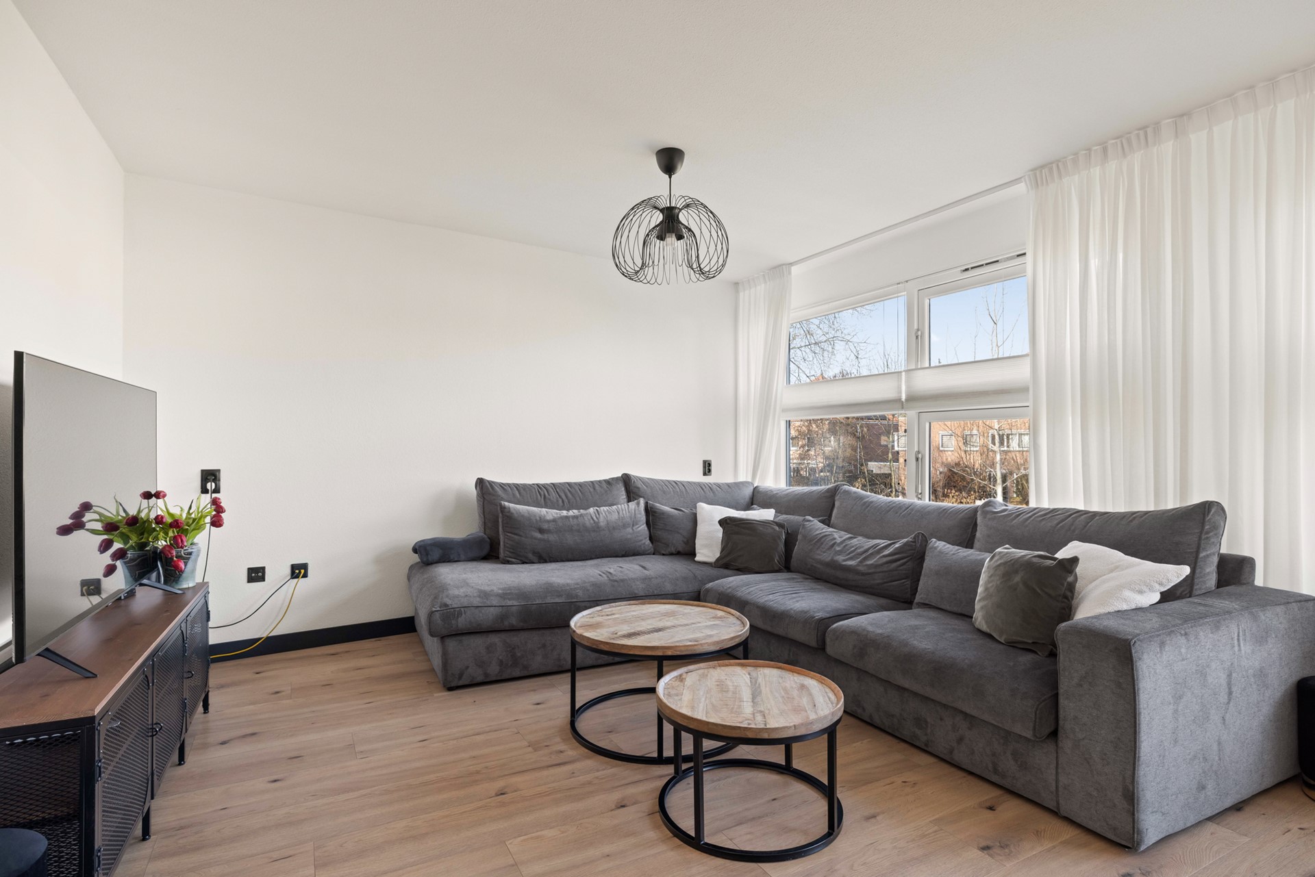 Op de eerste verdieping bevindt zich het hart van de woning: een royale, lichte woonkamer met grote raampartijen en vrij uitzicht. De breedte van de woonkamer zorgt voor een bijzonder ruimtelijk gevoel. De half-open keuken is voorzien van inbouwapparatuur en geeft toegang tot het zonnige balkon op het zuiden – met uitzicht over de veilige binnentuin.