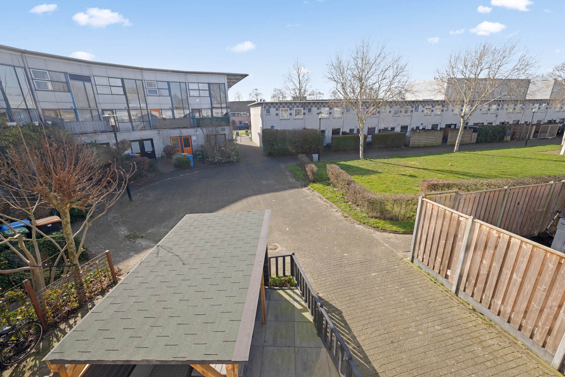 De woning beschikt over een voortuin met overkapping én meerdere terrassen/balkons, waardoor je altijd kunt kiezen voor zon of schaduw en volop privacy ervaart.