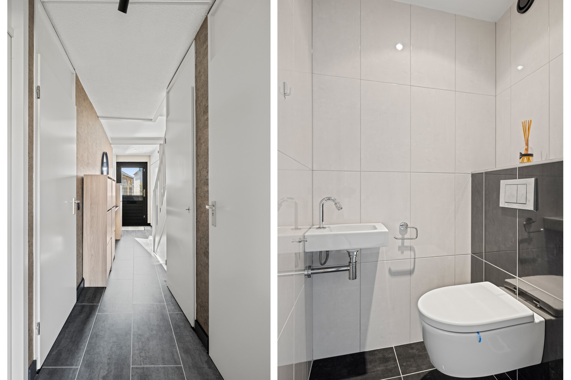 De inpandige berging met wasmachineaansluiting en pantry biedt extra gemak, evenals de praktische trapkast en separate toiletruimte in de entree.