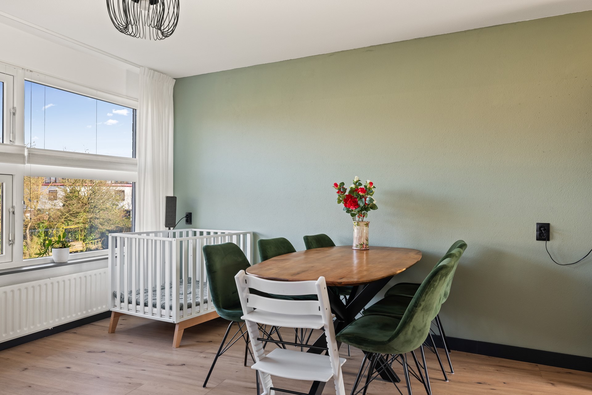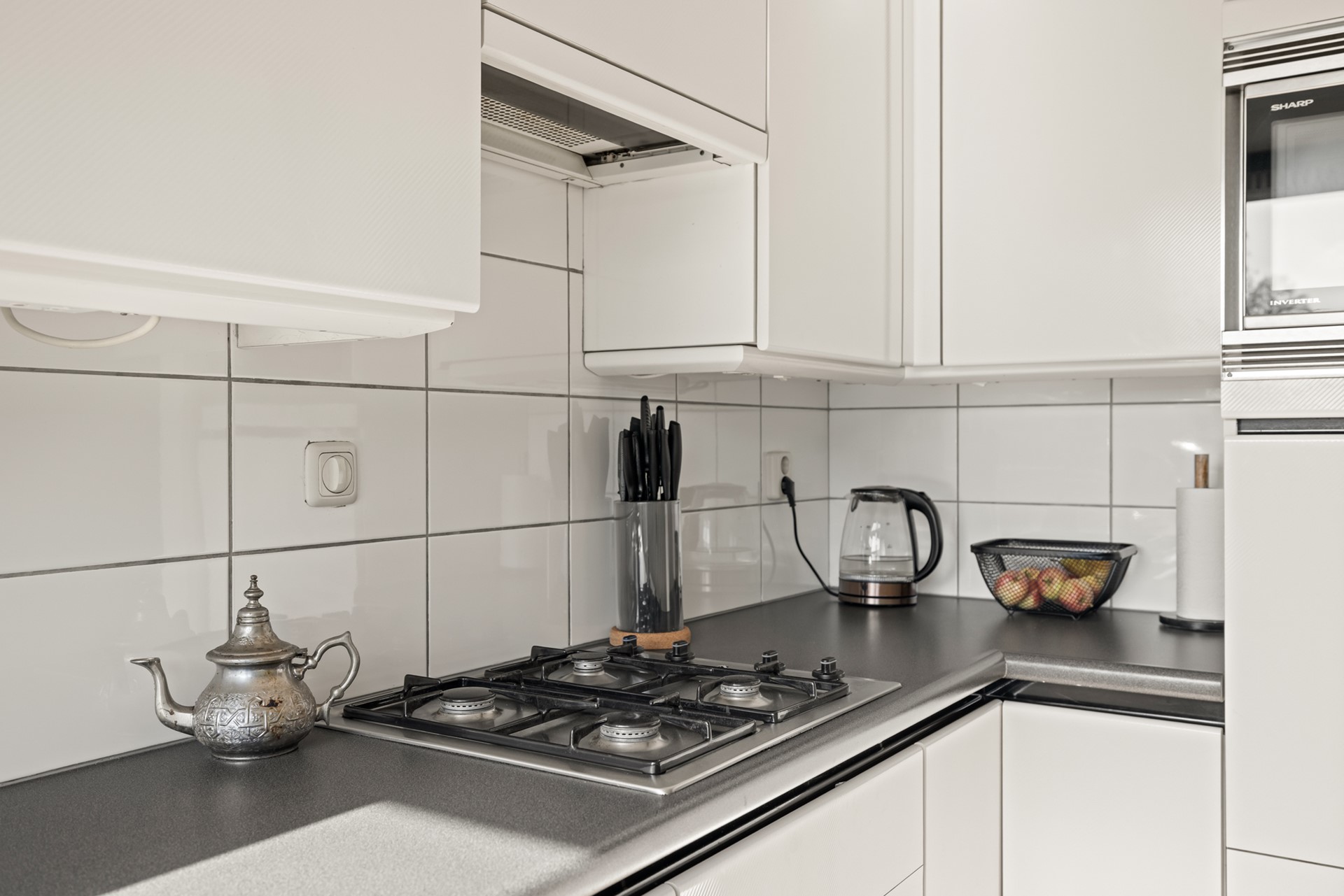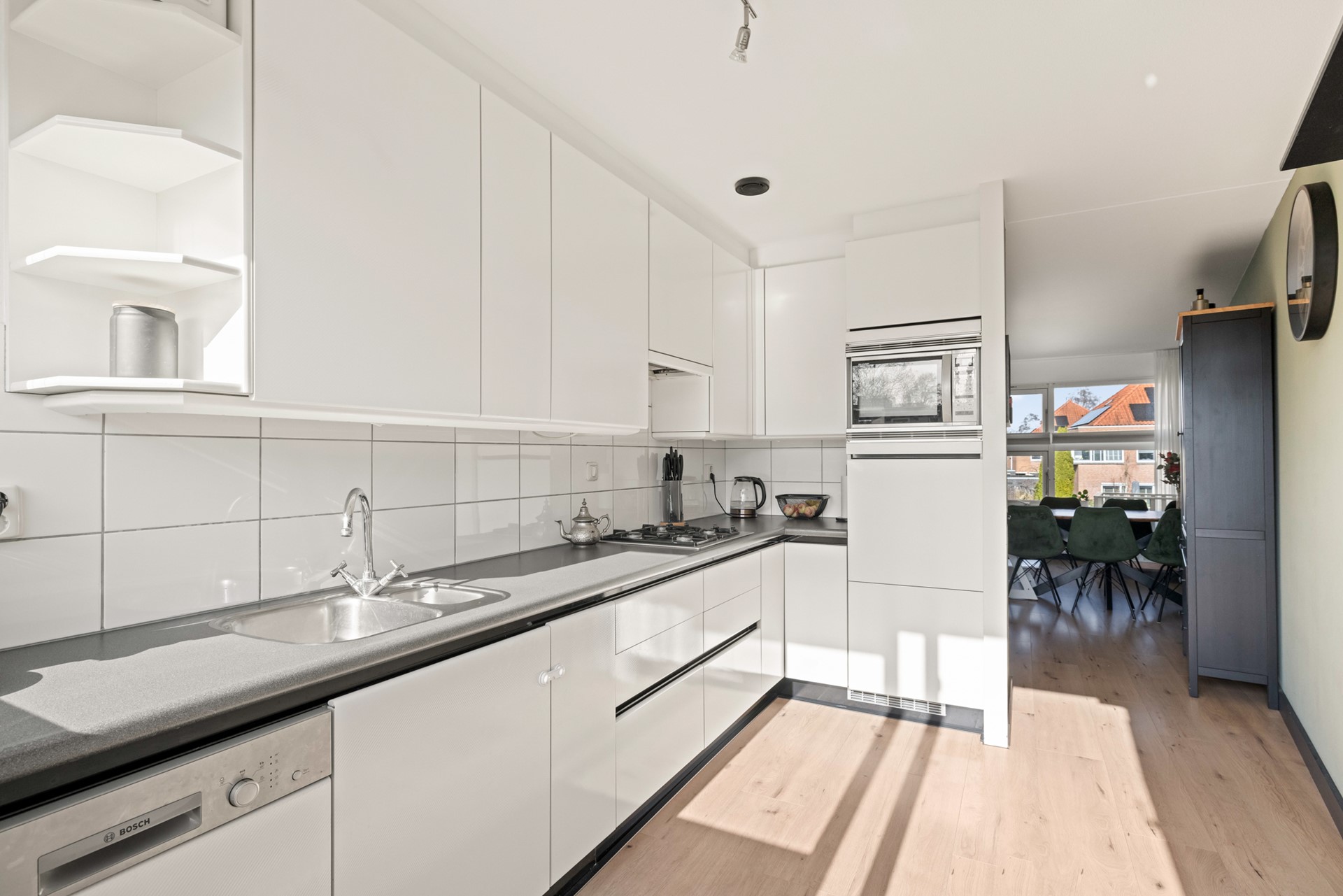 Op de eerste verdieping bevindt zich het hart van de woning: een royale, lichte woonkamer met grote raampartijen en vrij uitzicht. De breedte van de woonkamer zorgt voor een bijzonder ruimtelijk gevoel. De half-open keuken is voorzien van inbouwapparatuur en geeft toegang tot het zonnige balkon op het zuiden – met uitzicht over de veilige binnentuin.