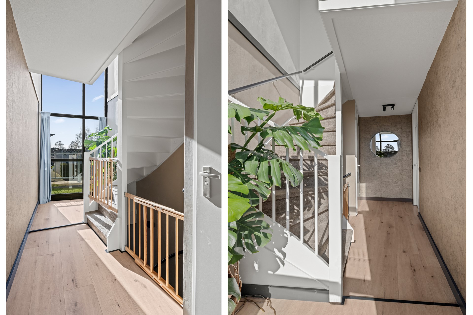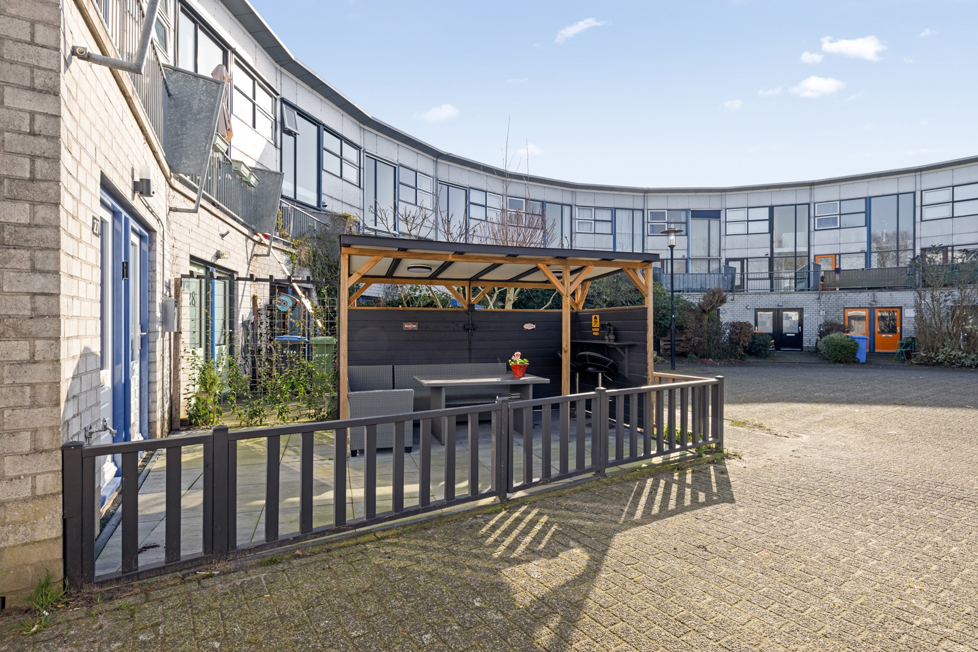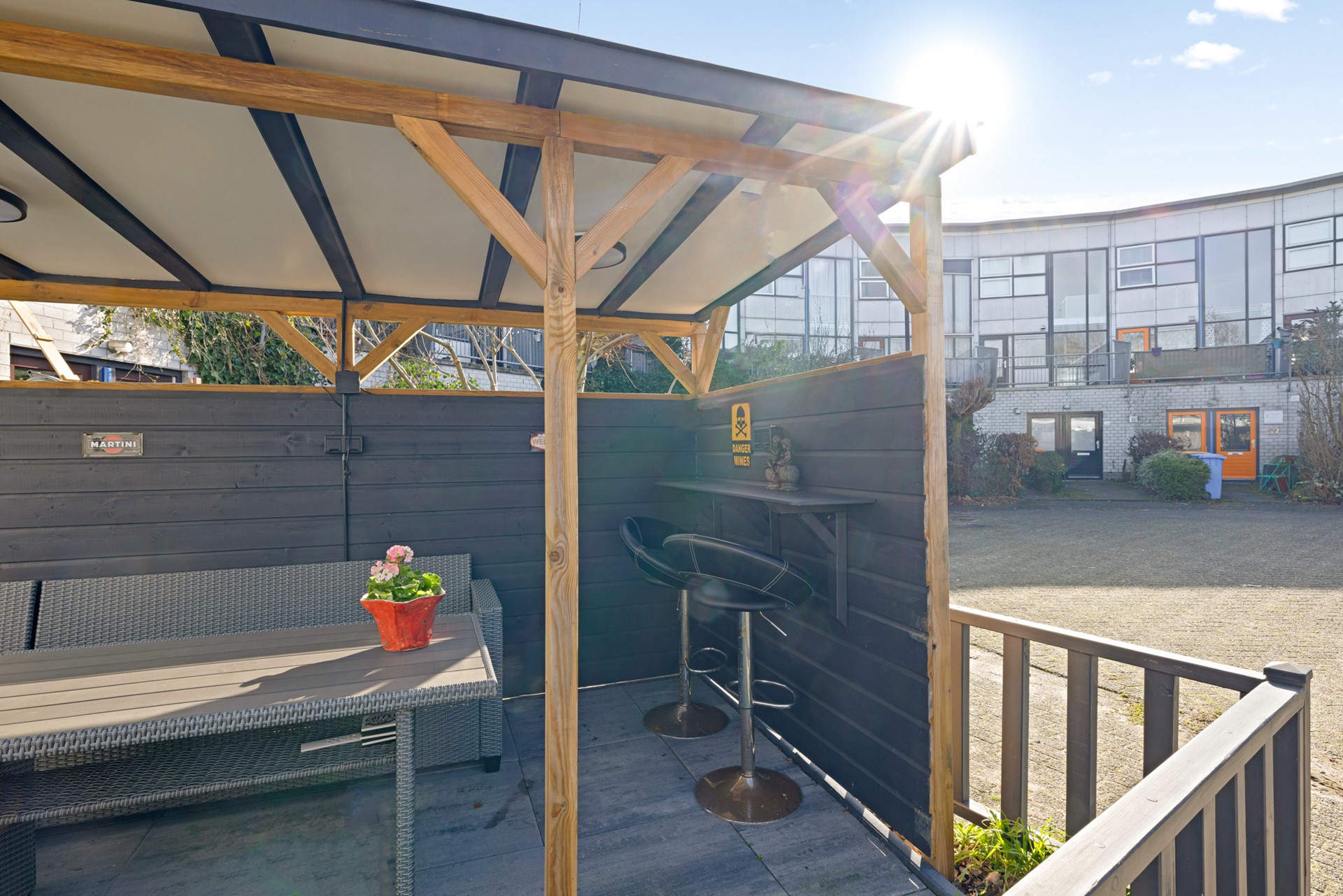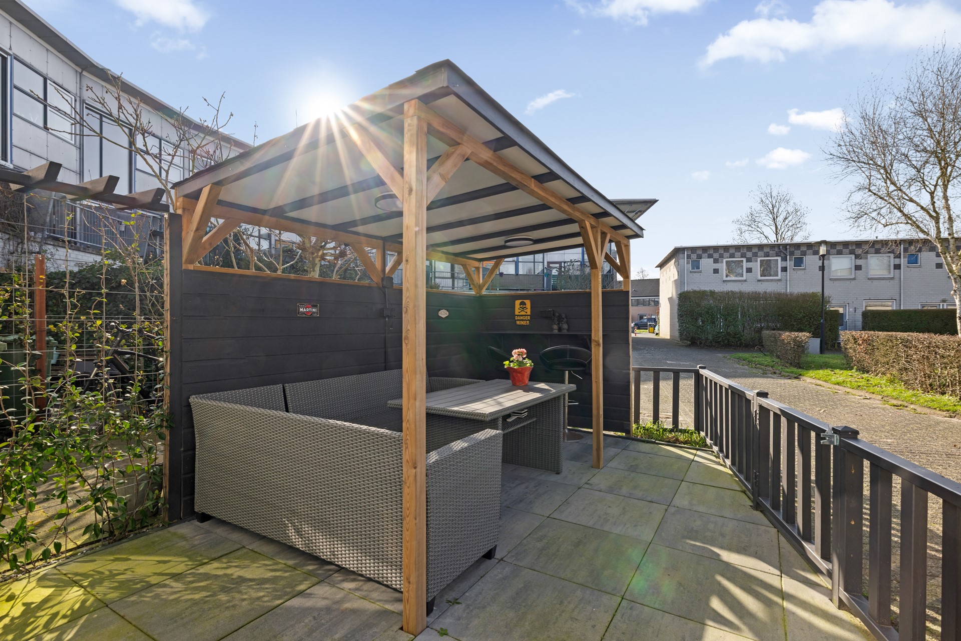De woning beschikt over een voortuin met overkapping én meerdere terrassen/balkons, waardoor je altijd kunt kiezen voor zon of schaduw en volop privacy ervaart.