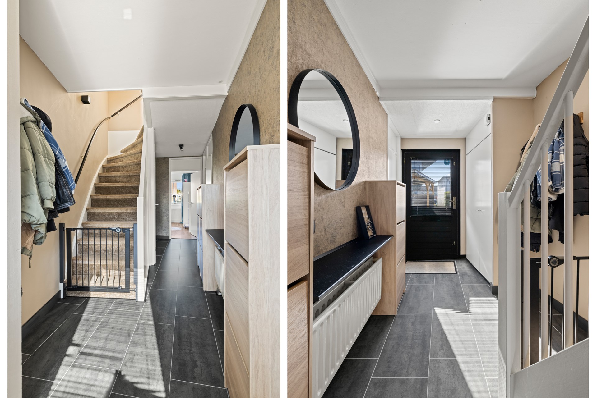 De inpandige berging met wasmachineaansluiting en pantry biedt extra gemak, evenals de praktische trapkast en separate toiletruimte in de entree.
