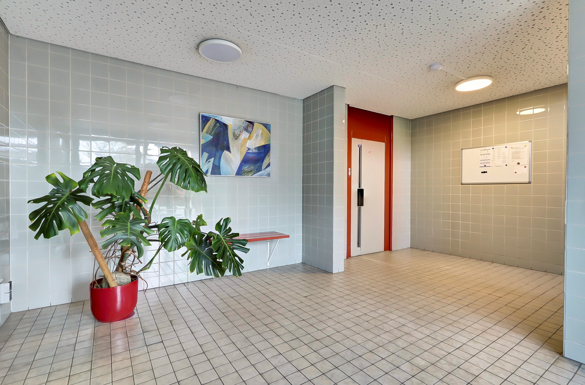 Portiek voor twee appartementen met lift en trappenhuis.
