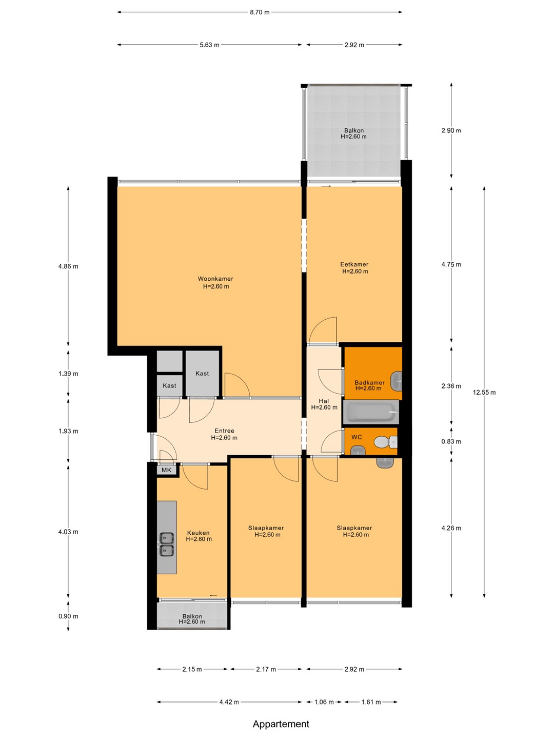Deze kamer geeft toegang tot het ruime balkon op het zuidwesten. Aan de centrale hal grenzen ook de beide slaapkamers (aan de koele kant van het gebouw) en de badkamer. Die is netjes ingericht met een ligbad, wasmachineaansluiting en wastafel. Het toilet is separaat. De keuken tenslotte ligt aan de voorkant van het gebouw. Het is fijn om tijdens het koken de schuifpui in de keuken naar het kleine balkon aan de voorkant open te kunnen zetten.