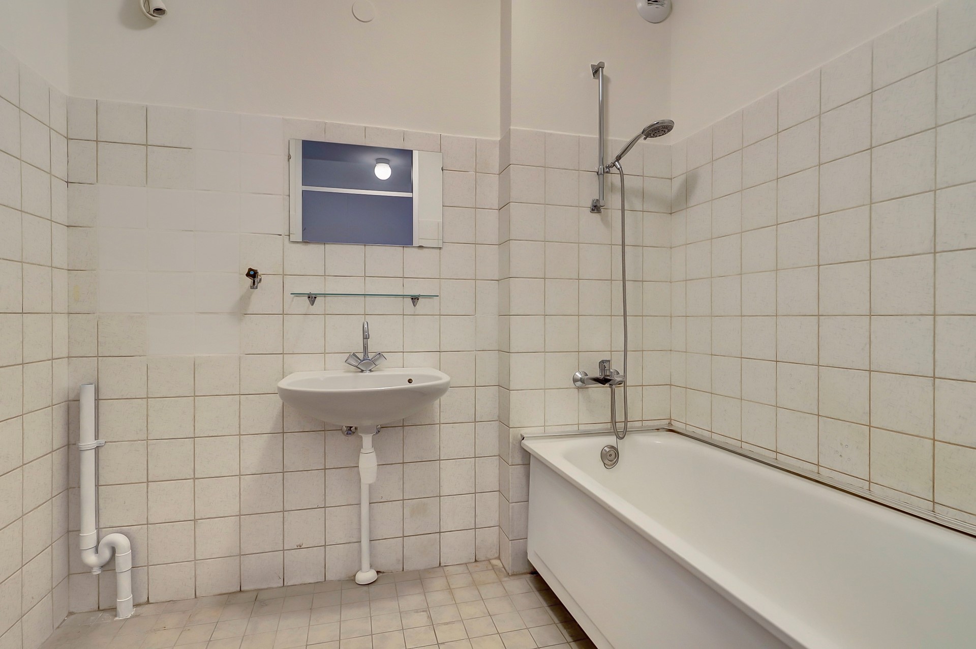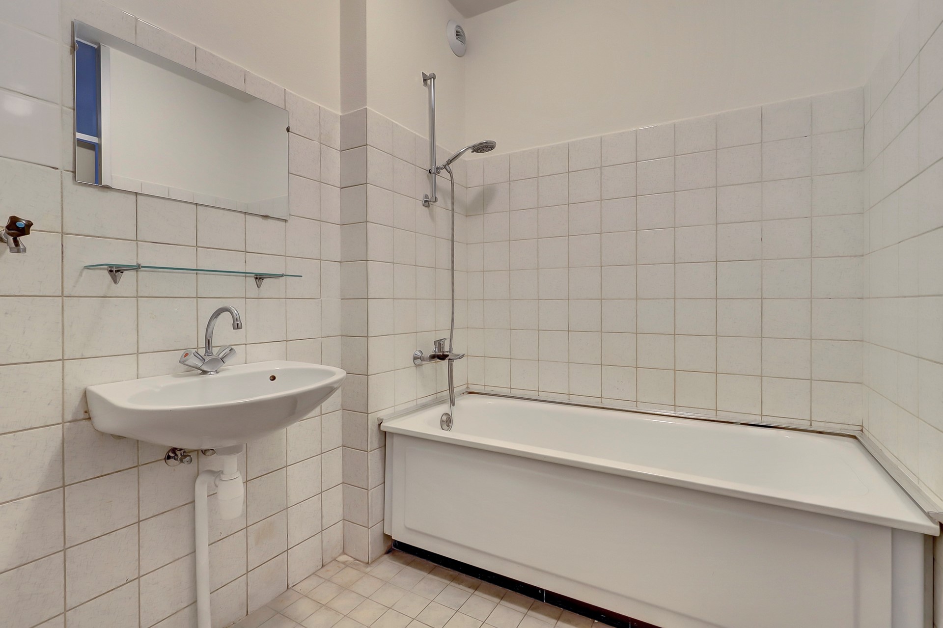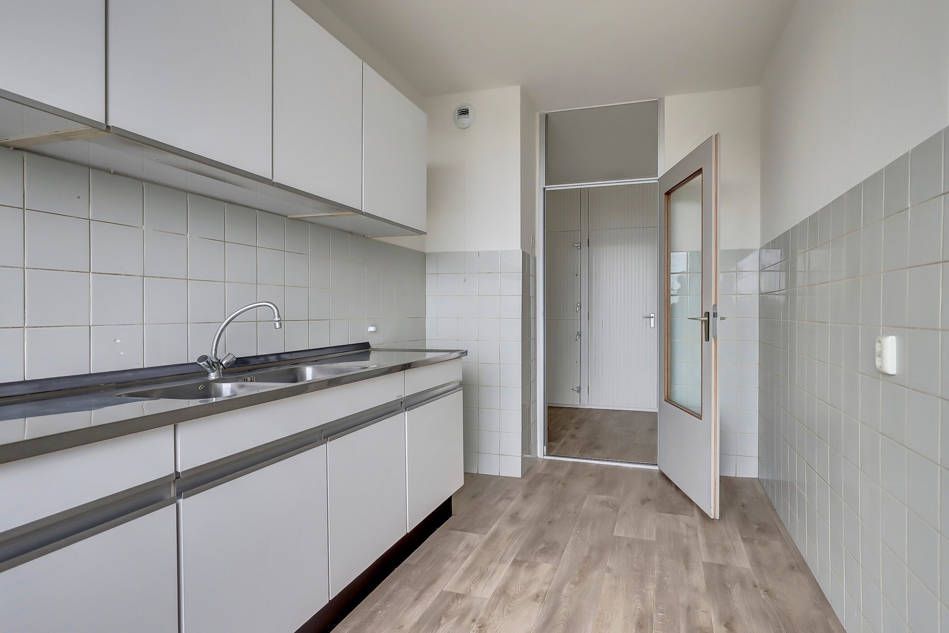 Deze kamer geeft toegang tot het ruime balkon op het zuidwesten. Aan de centrale hal grenzen ook de beide slaapkamers (aan de koele kant van het gebouw) en de badkamer. Die is netjes ingericht met een ligbad, wasmachineaansluiting en wastafel. Het toilet is separaat. De keuken tenslotte ligt aan de voorkant van het gebouw. Het is fijn om tijdens het koken de schuifpui in de keuken naar het kleine balkon aan de voorkant open te kunnen zetten.
