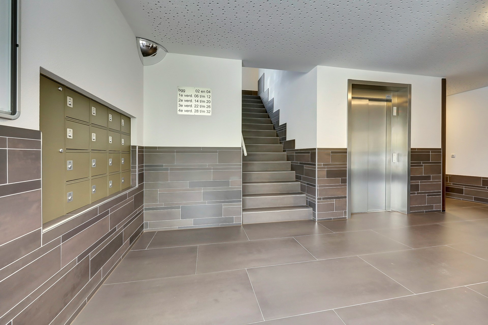 Centrale entree met lift en trappenhuis. Hier vind je ook de bergingen en de gezamenlijke fietsenstalling met eigen oplaadpunt voor elektrische fietsen.