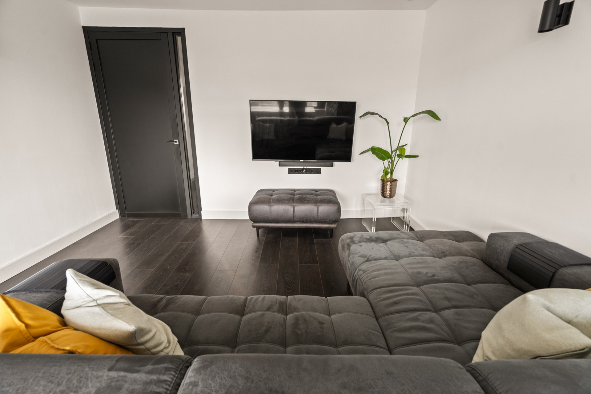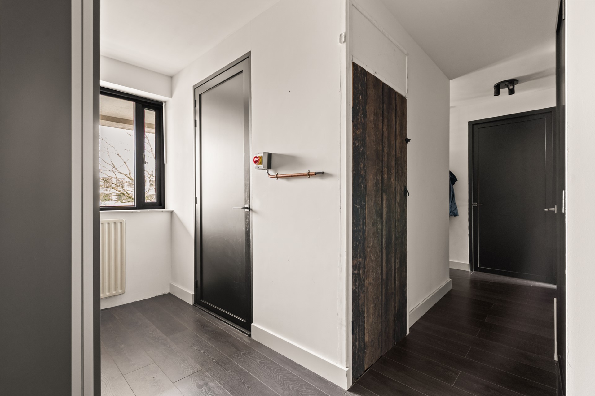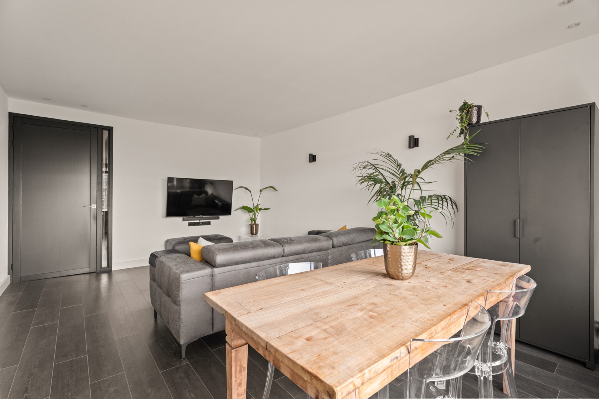 Tussen de woonkamer en de keuken is een stijlvolle schuifdeur geplaatst, waardoor de ruimtes zowel open als afgesloten gebruikt kunnen worden.