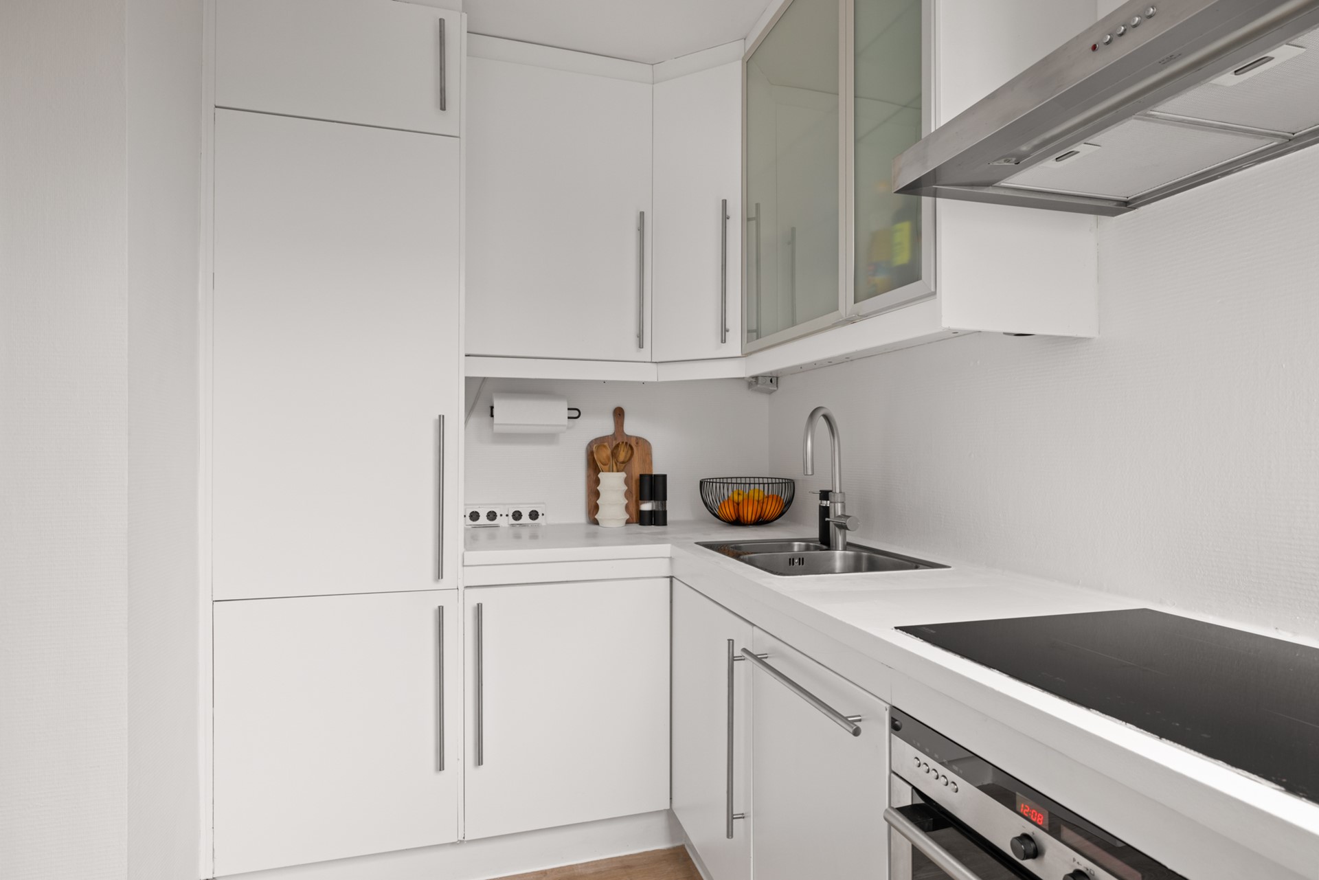 De keuken bevindt zich aan de achterzijde en is uitgevoerd in een praktische hoekopstelling met houten werkblad en diverse inbouwapparatuur. Via de extra achterdeur loop je zo de tuin in — ideaal tijdens zomerse diners.