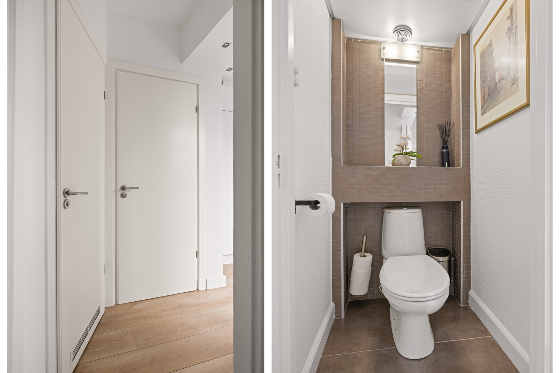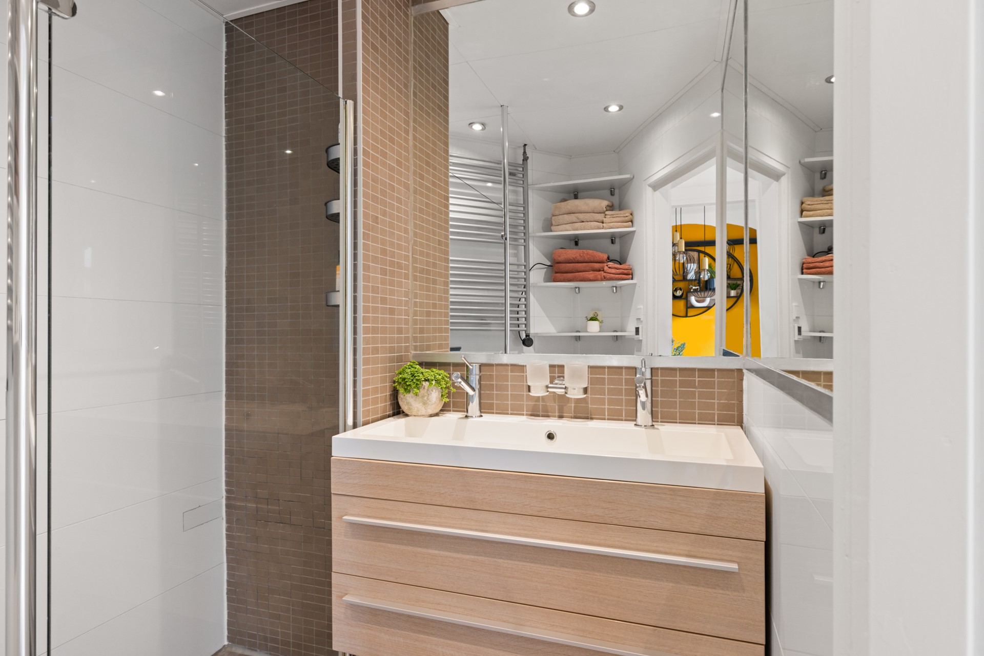 De badkamer (2015) bevindt zich op de begane grond en is van alle gemakken voorzien: elektrische vloerverwarming, een ruime inloop-regendouche, wastafelmeubel en designradiator. Het separate toilet bevindt zich direct naast de badkamer — prettig en praktisch.