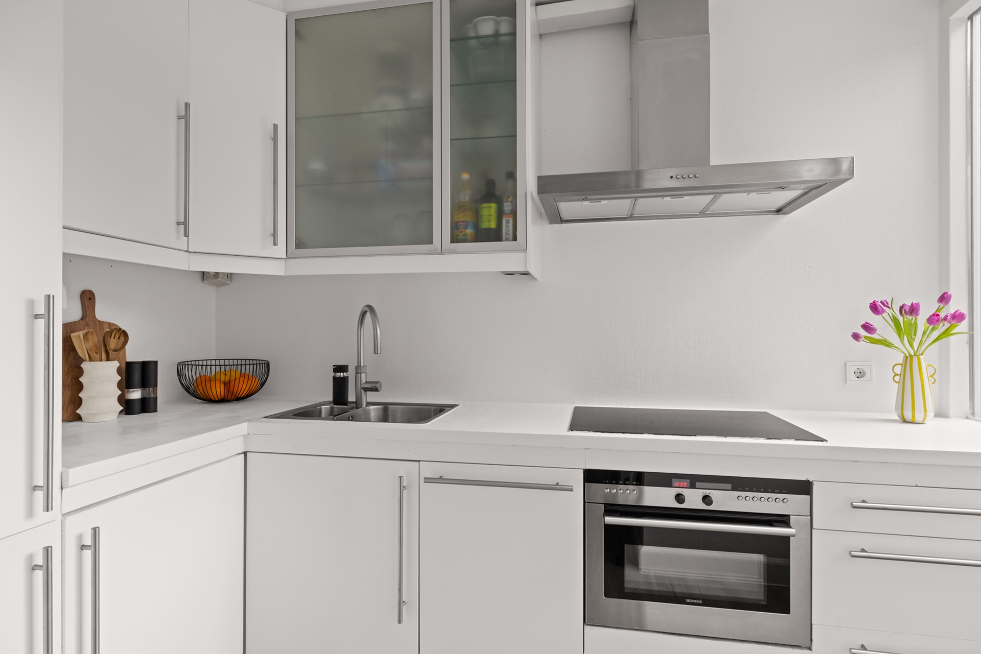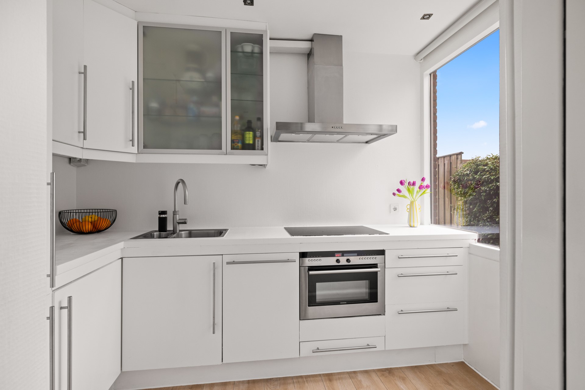 De keuken bevindt zich aan de achterzijde en is uitgevoerd in een praktische hoekopstelling met houten werkblad en diverse inbouwapparatuur. Via de extra achterdeur loop je zo de tuin in — ideaal tijdens zomerse diners.