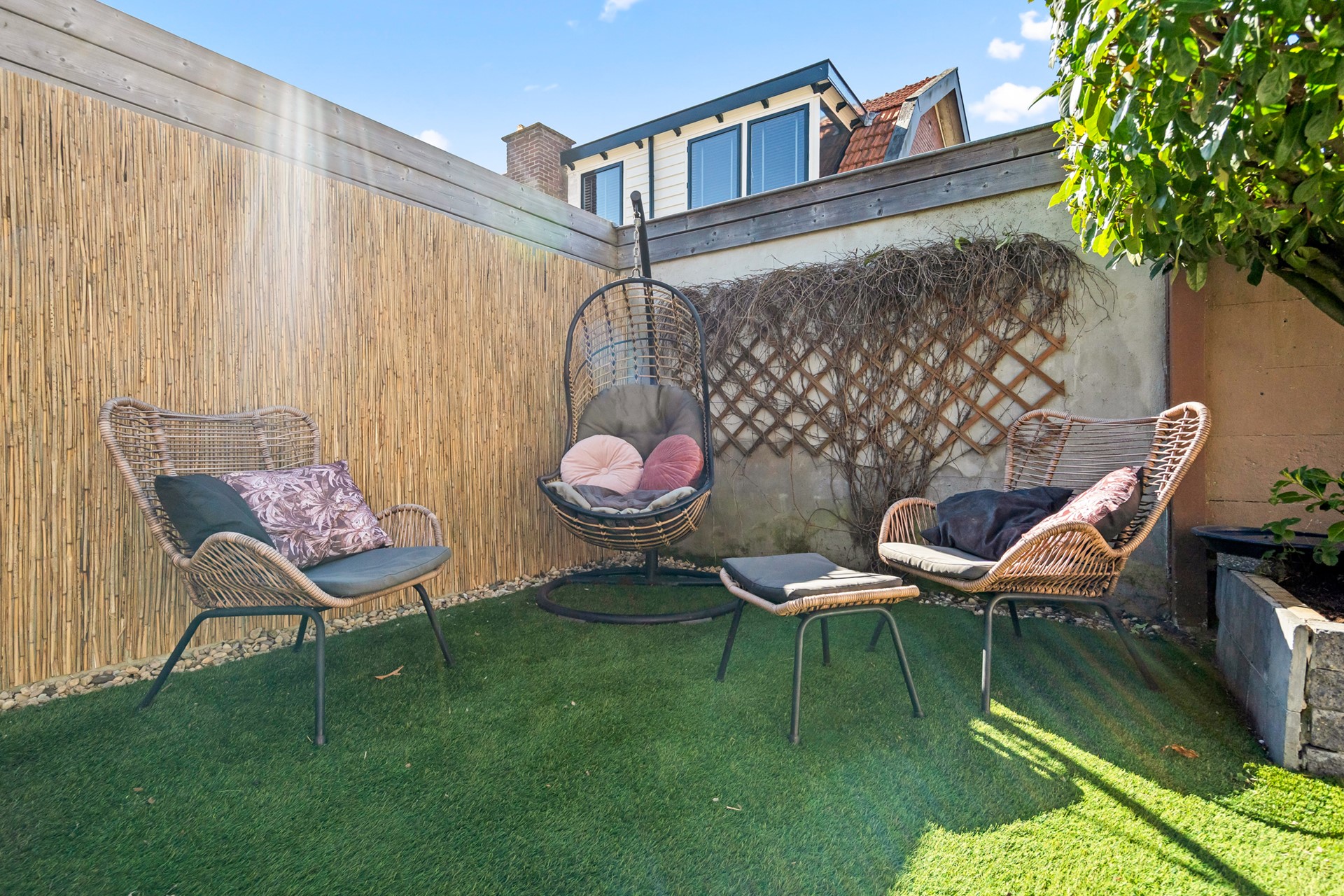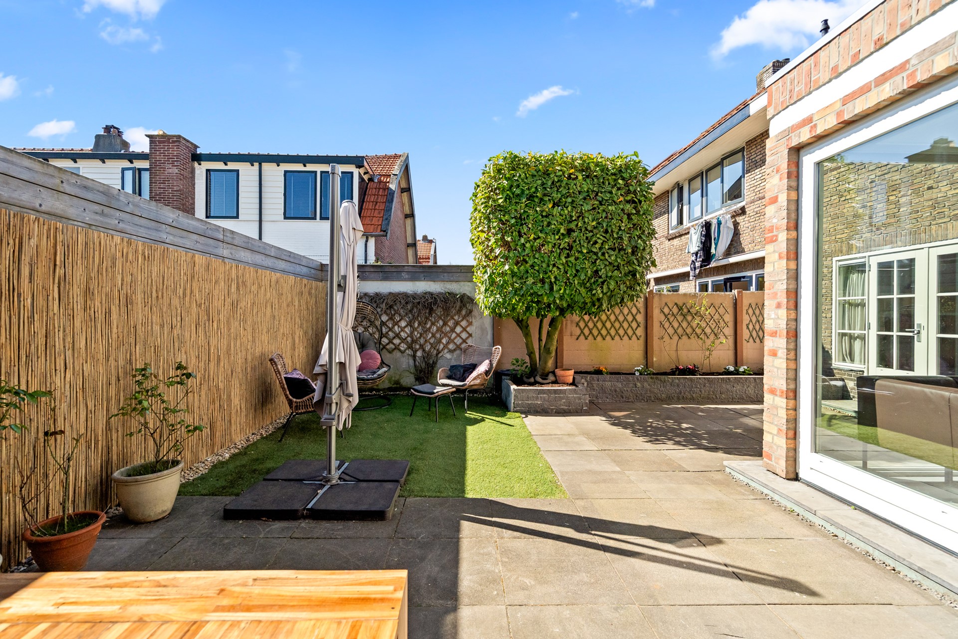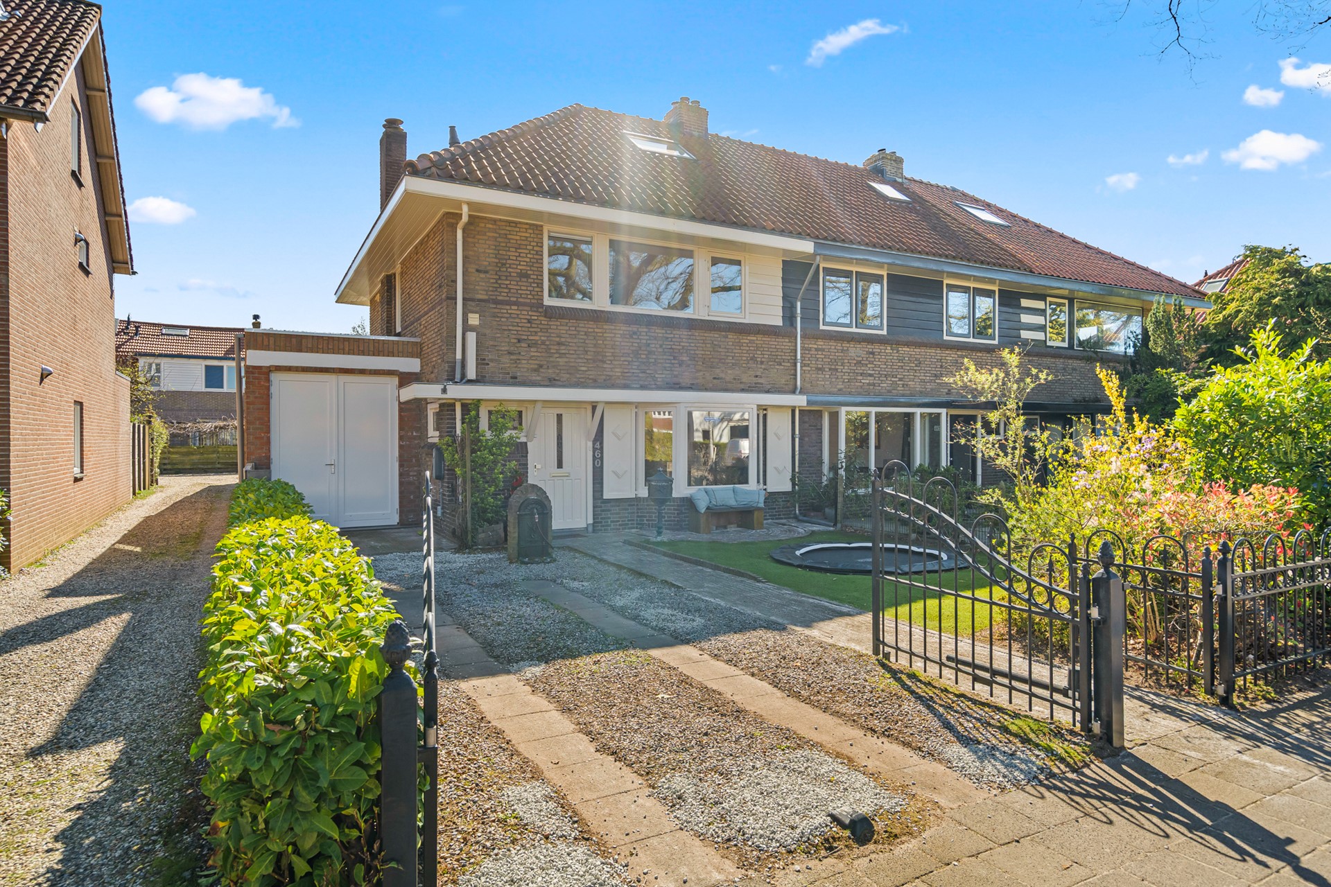 De woning beschikt over een ruime voortuin met eigen oprit, geschikt voor één grote of twee kleinere auto’s. De achtertuin is compact maar sfeervol en voorzien van een overkapping, waardoor je hier ook bij minder weer comfortabel buiten kunt zitten. In combinatie met de uitbouw ontstaat hier een prettig verlengstuk van de leefruimte binnen.