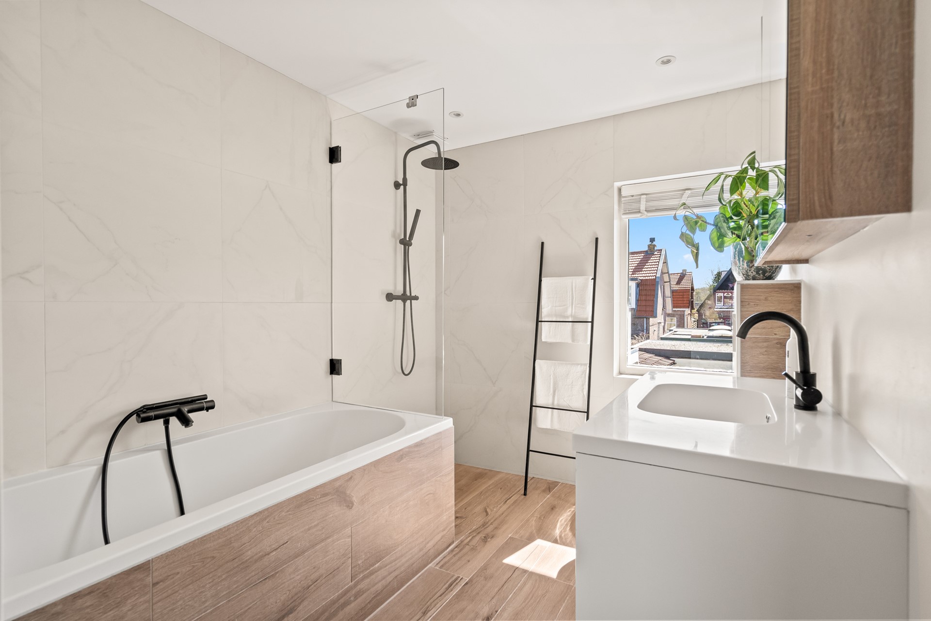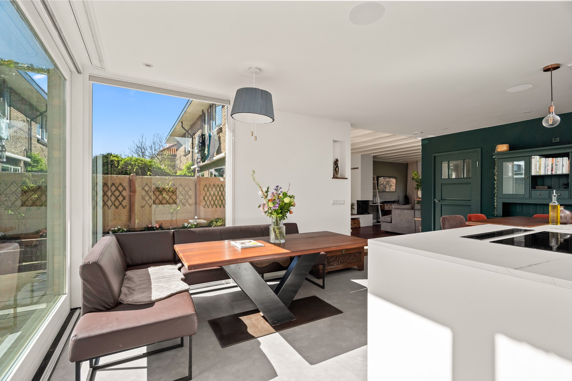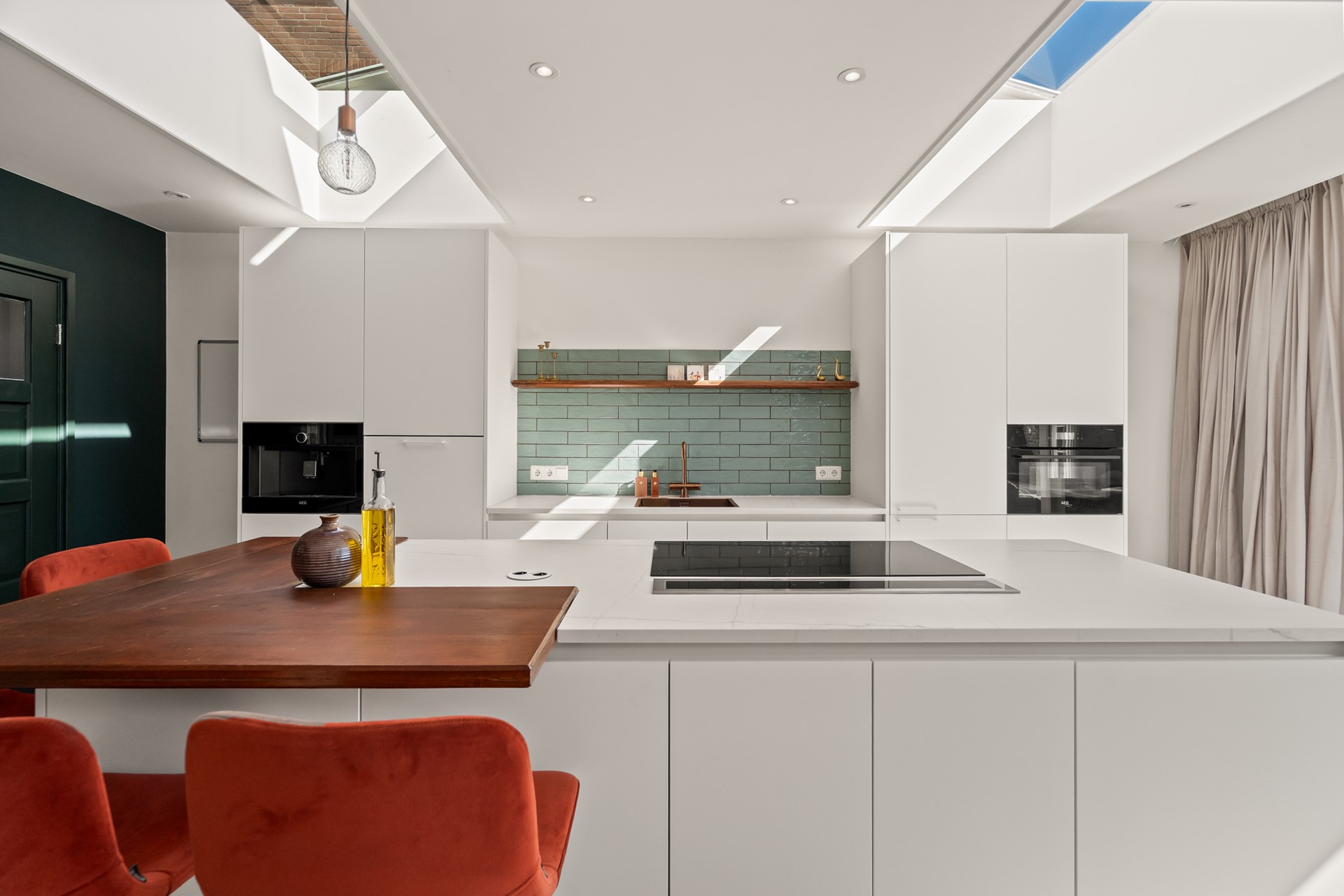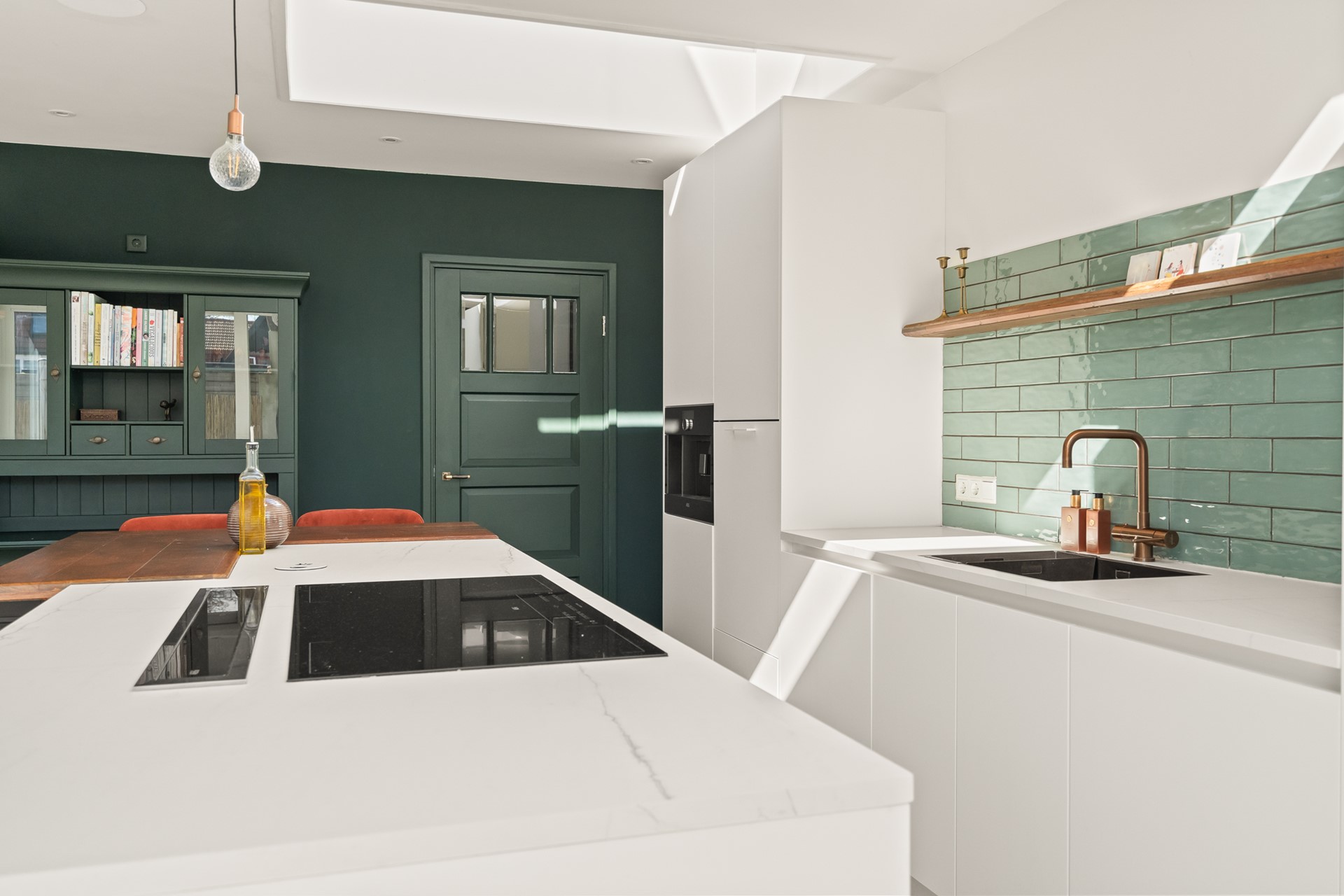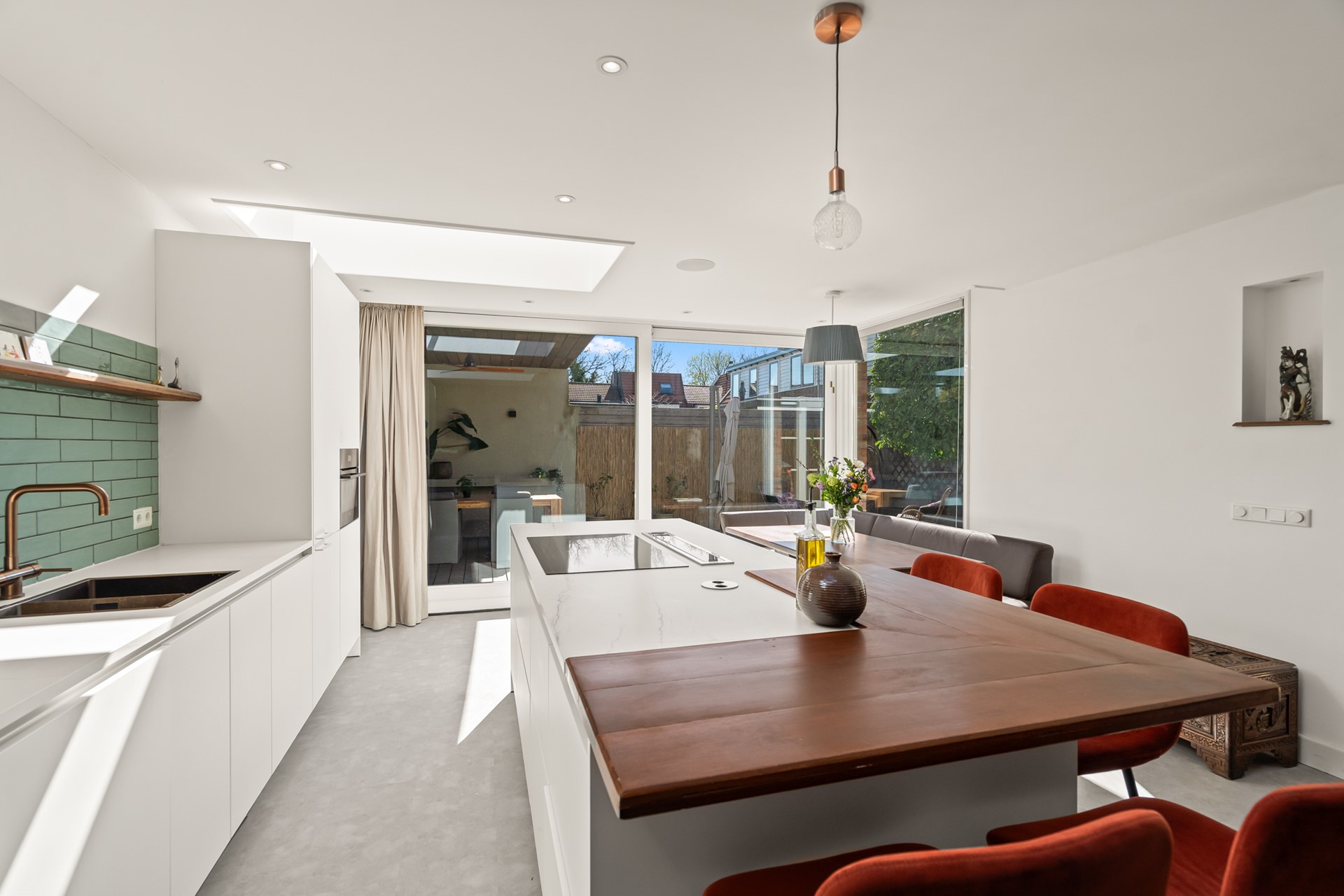 Het echte hart van de woning is de royale woonkeuken. Hier komt alles samen: koken, leven en samenzijn. Dankzij de grote schuifpui en lichtkoepel stroomt het daglicht rijkelijk naar binnen en voelt de ruimte het hele jaar door licht en open. Het kookeiland met zitgelegenheid maakt dit een plek waar je niet alleen kookt, maar waar je blijft hangen van ontbijt tot borrel. De keuken is compleet uitgevoerd en voorzien van vloerverwarming.