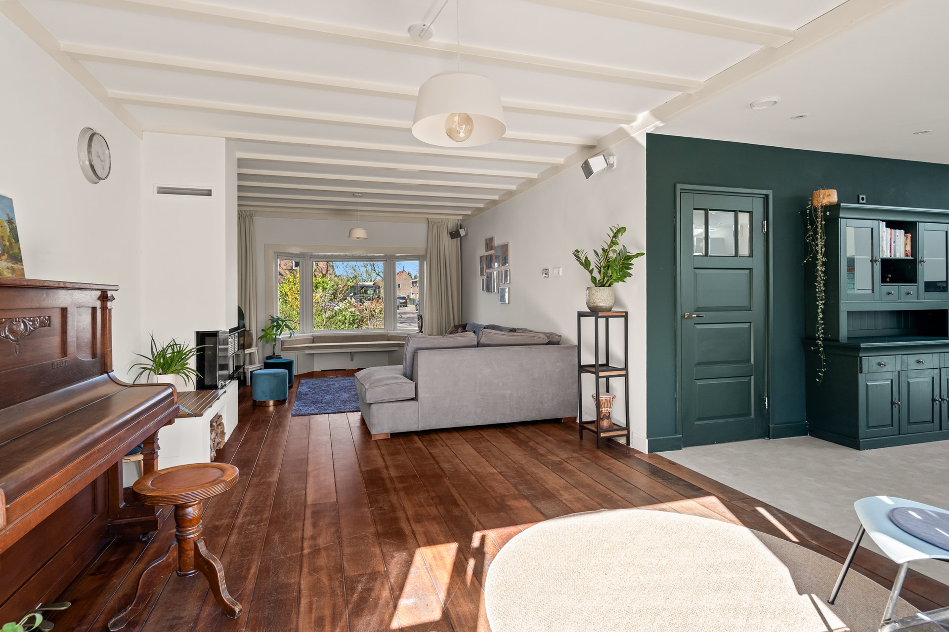 Aan de voorzijde bevindt zich de sfeervolle woonkamer met erker, houtkachel en openslaande tuindeuren. Een fijne plek om je even terug te trekken, met tegelijk een mooie verbinding naar buiten.