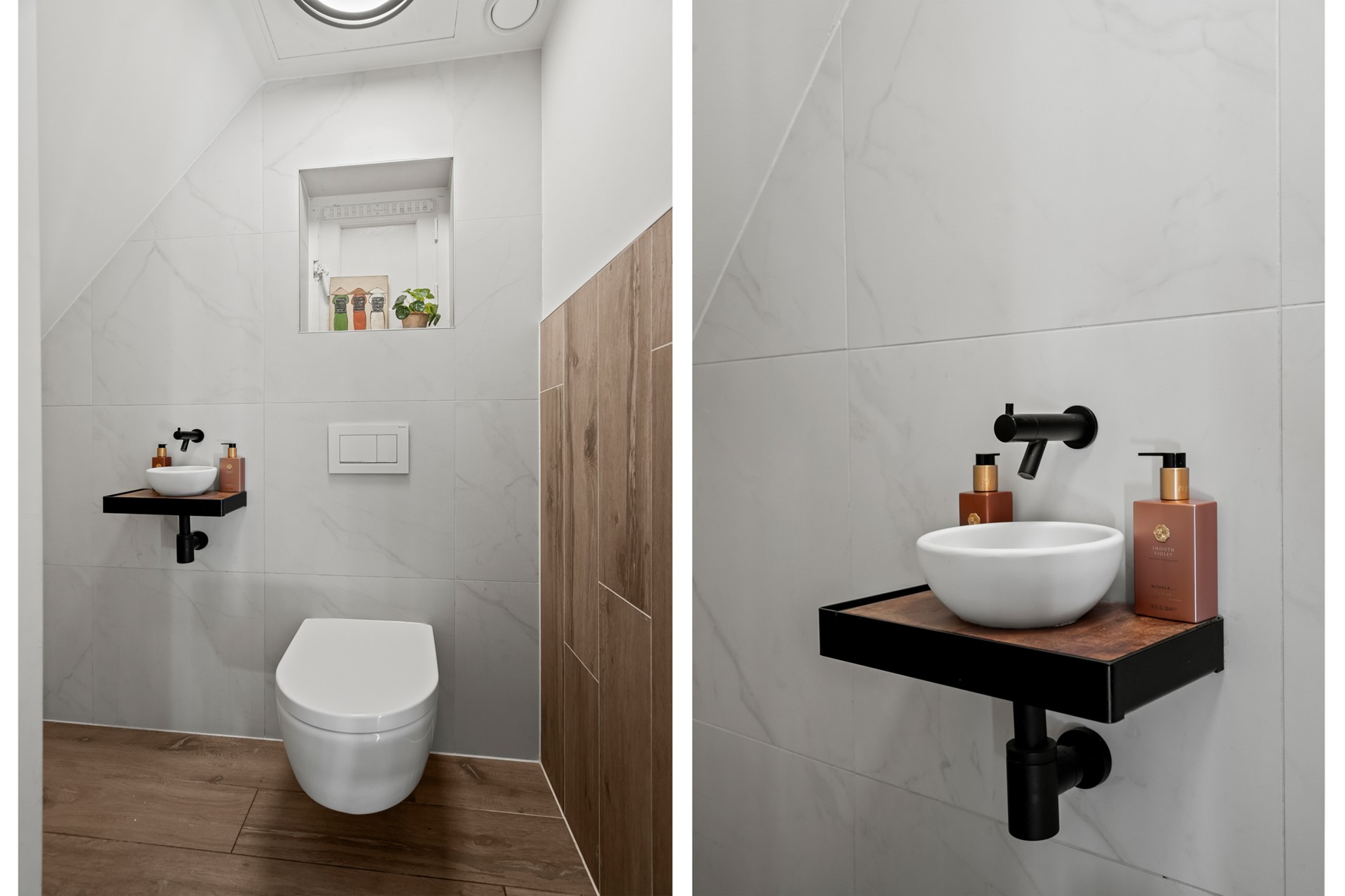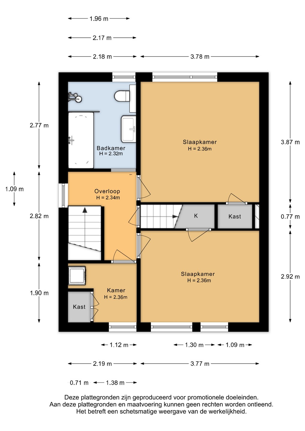 Overloop met toegang tot twee goed bemeten slaapkamers aan de voor- en achterzijde. Beide kamers zijn licht en flexibel in te richten. Daarnaast een aparte wasruimte met cv-opstelling en aansluitingen voor wasmachine en droger. De moderne badkamer is compleet uitgevoerd met ligbad, douche, toilet en wastafelmeubel.