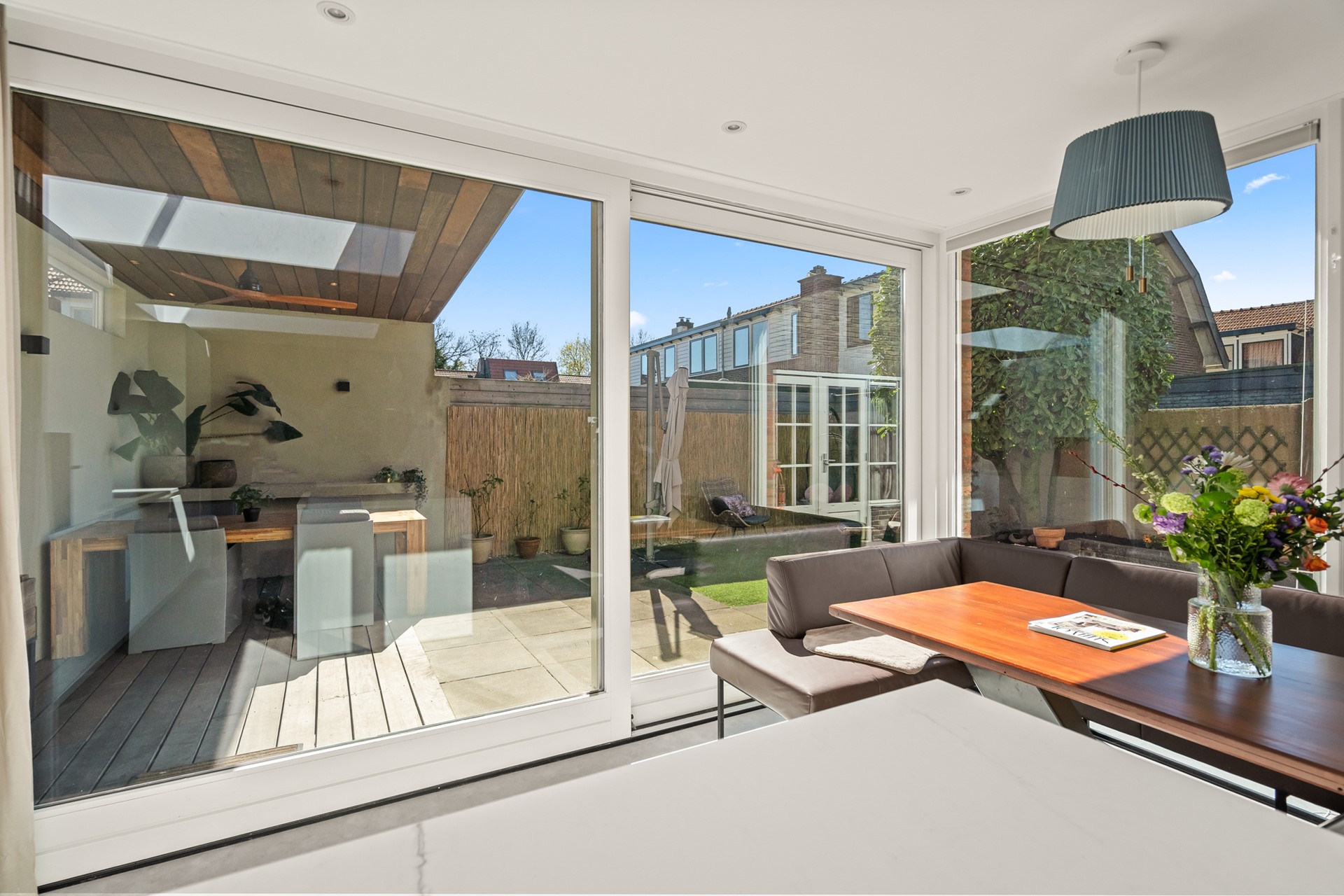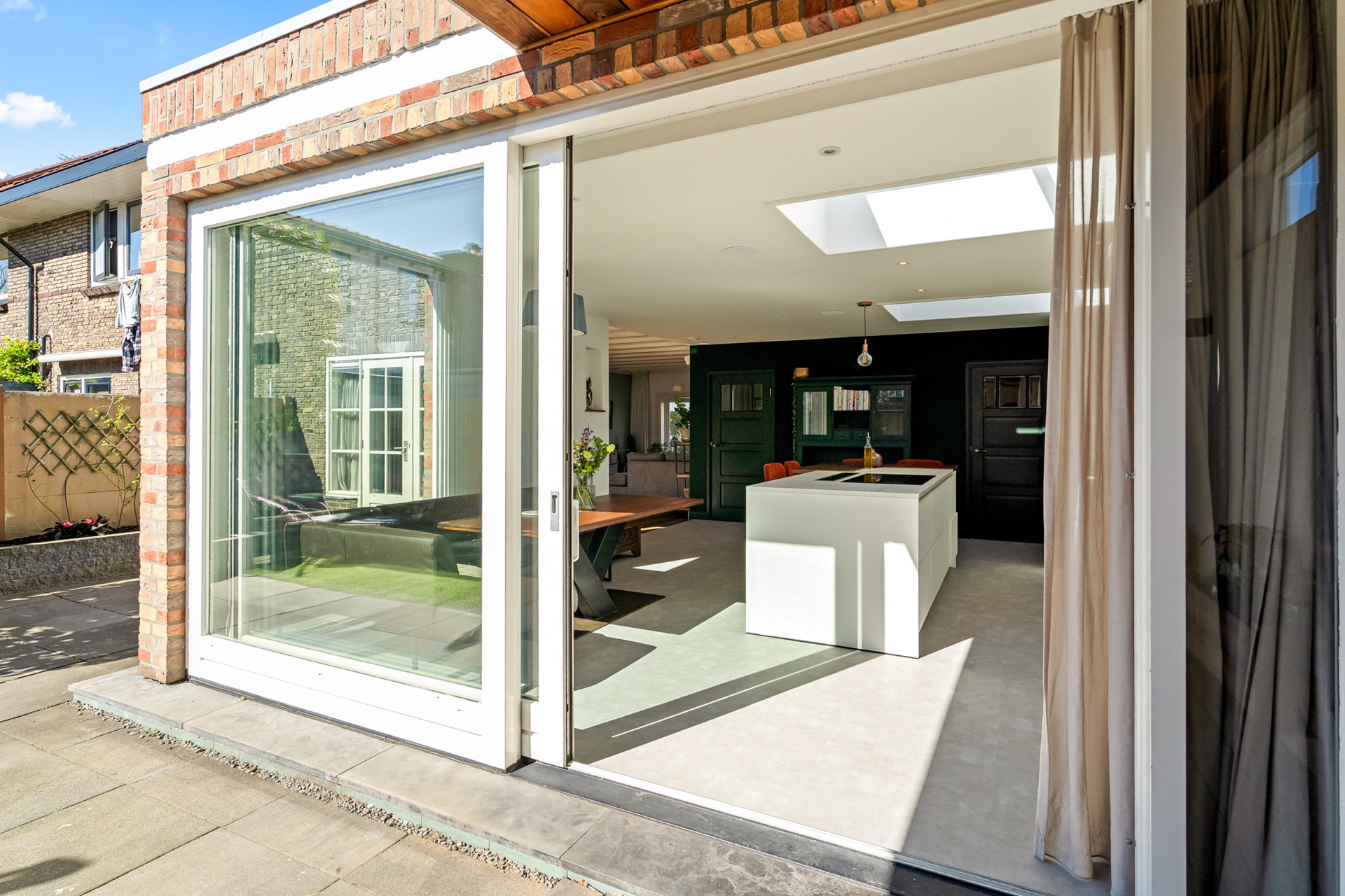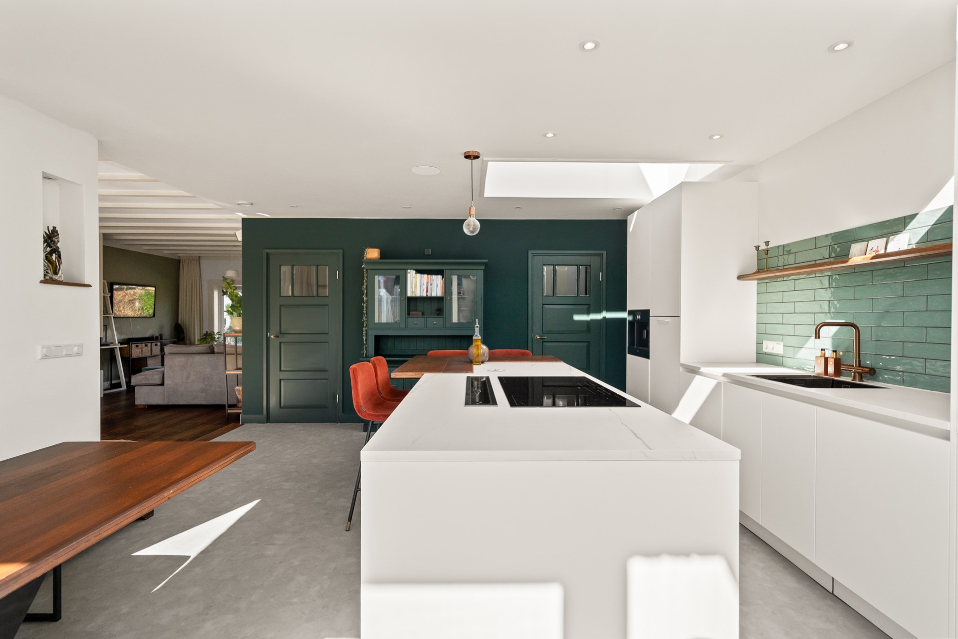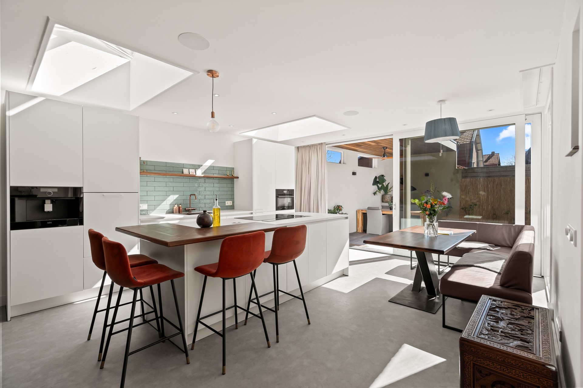 Het echte hart van de woning is de royale woonkeuken. Hier komt alles samen: koken, leven en samenzijn. Dankzij de grote schuifpui en lichtkoepel stroomt het daglicht rijkelijk naar binnen en voelt de ruimte het hele jaar door licht en open. Het kookeiland met zitgelegenheid maakt dit een plek waar je niet alleen kookt, maar waar je blijft hangen van ontbijt tot borrel. De keuken is compleet uitgevoerd en voorzien van vloerverwarming.