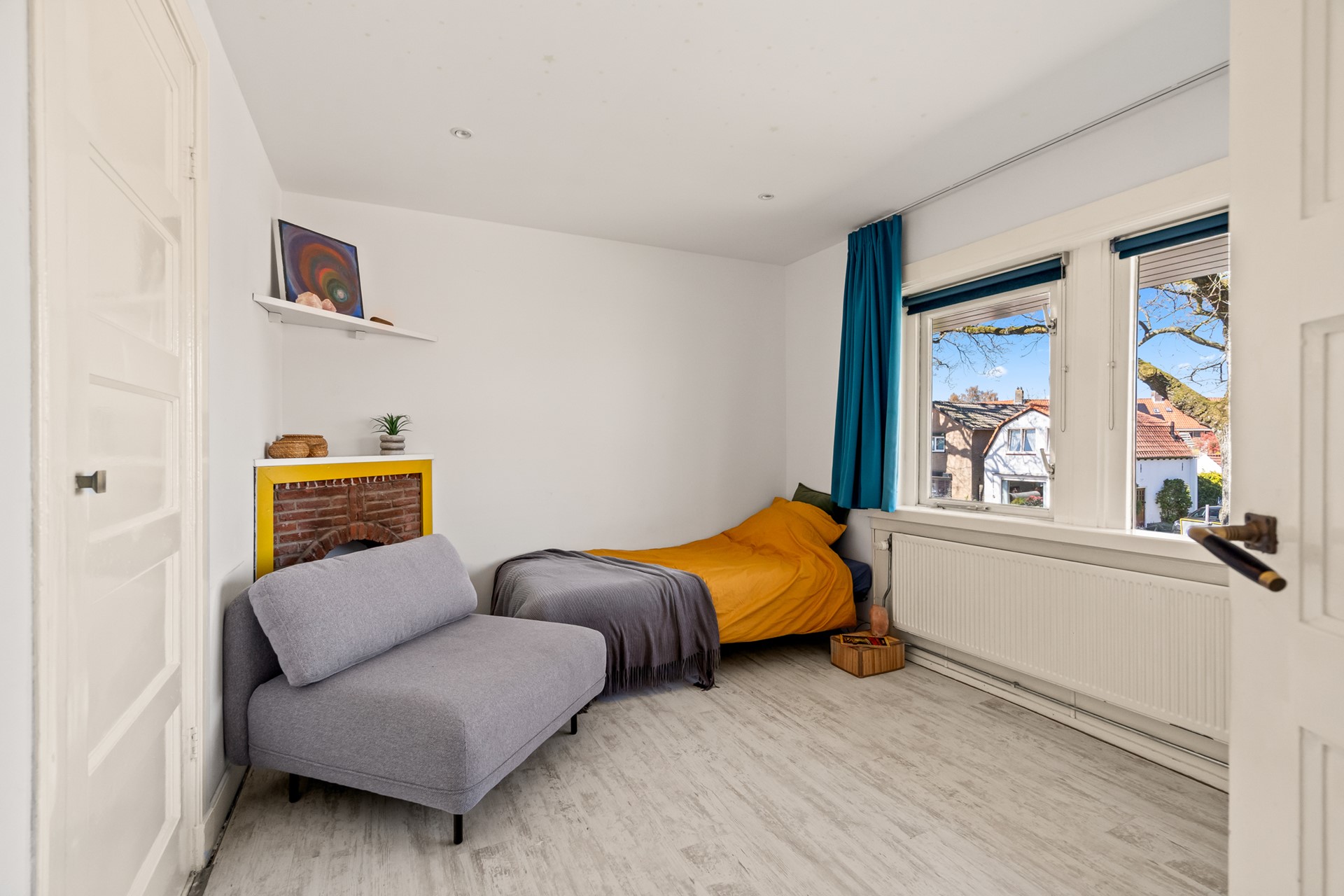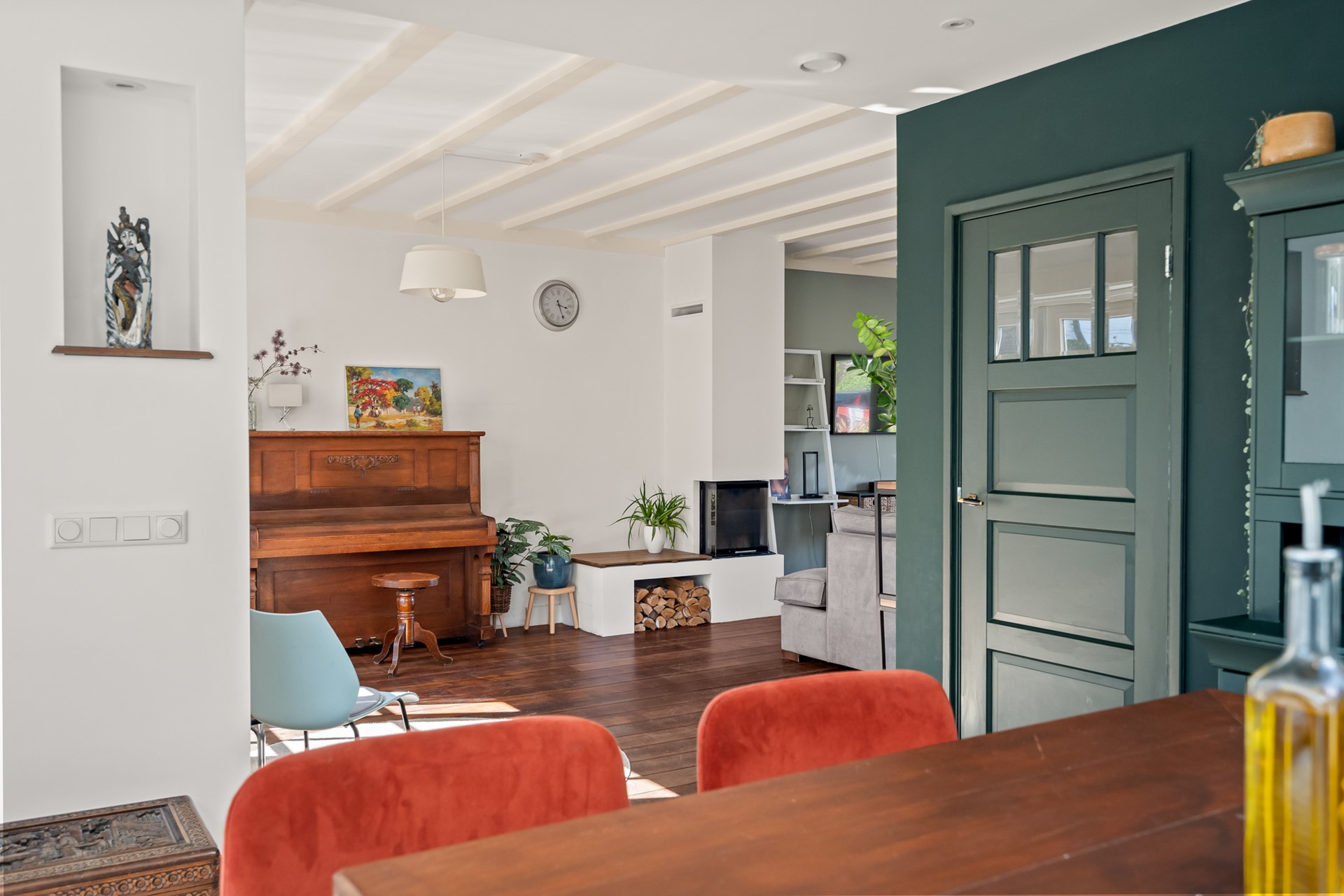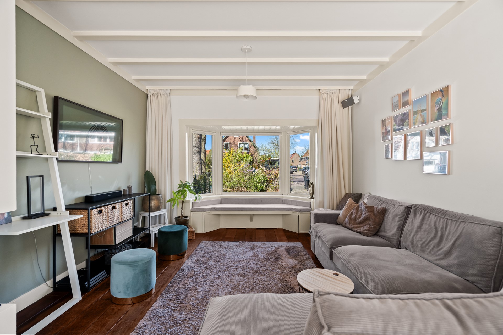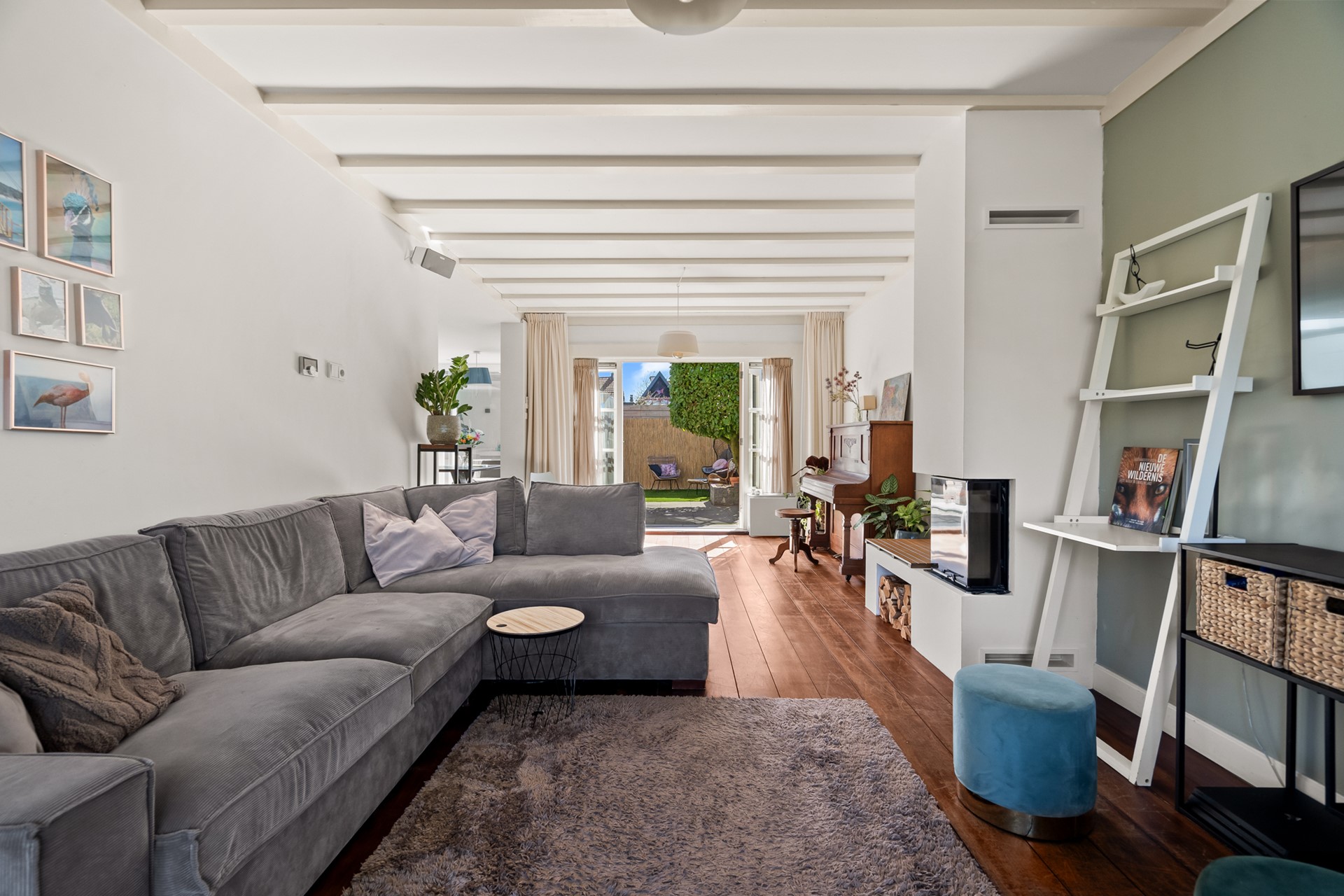 Aan de voorzijde bevindt zich de sfeervolle woonkamer met erker, houtkachel en openslaande tuindeuren. Een fijne plek om je even terug te trekken, met tegelijk een mooie verbinding naar buiten.