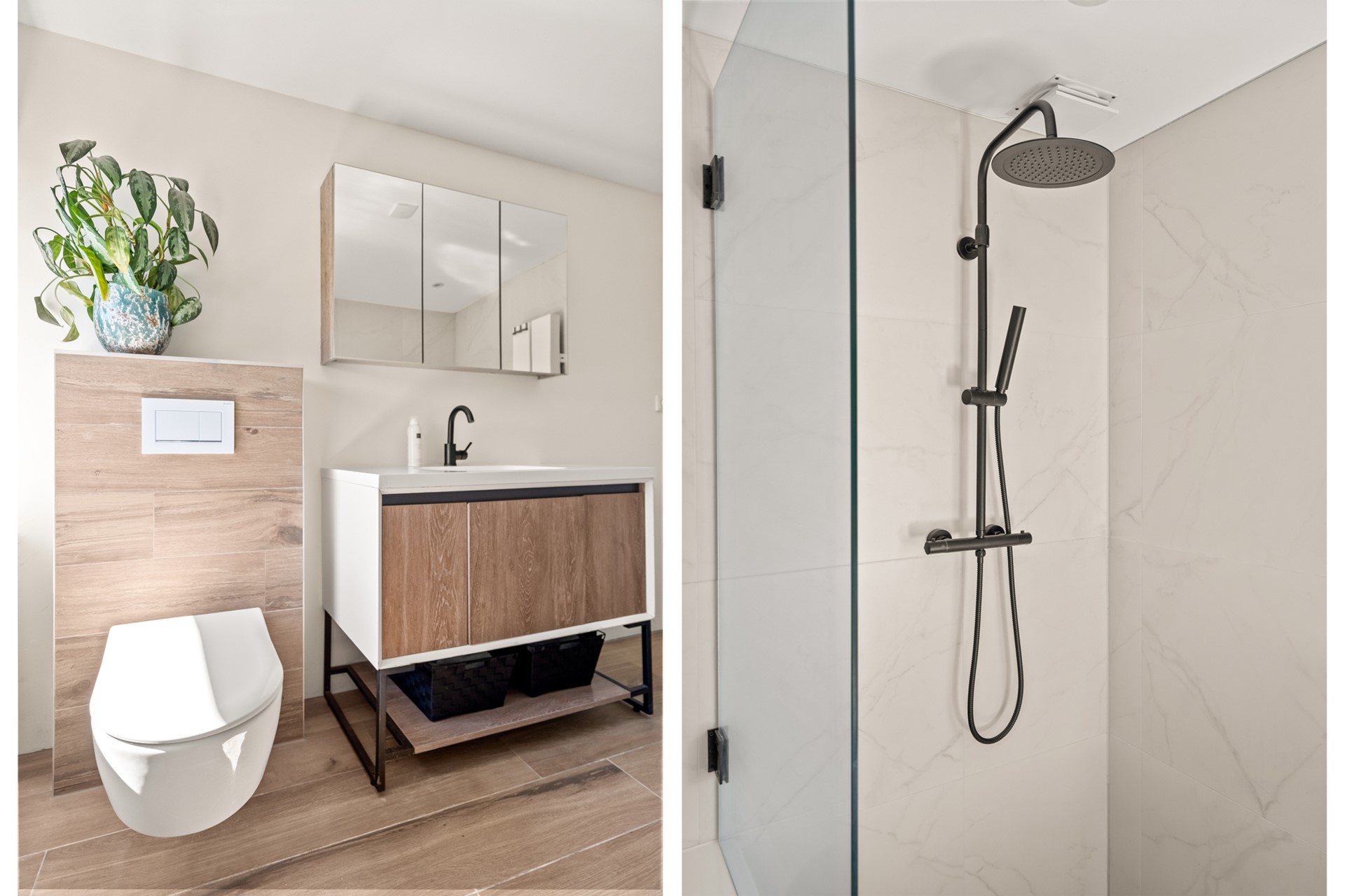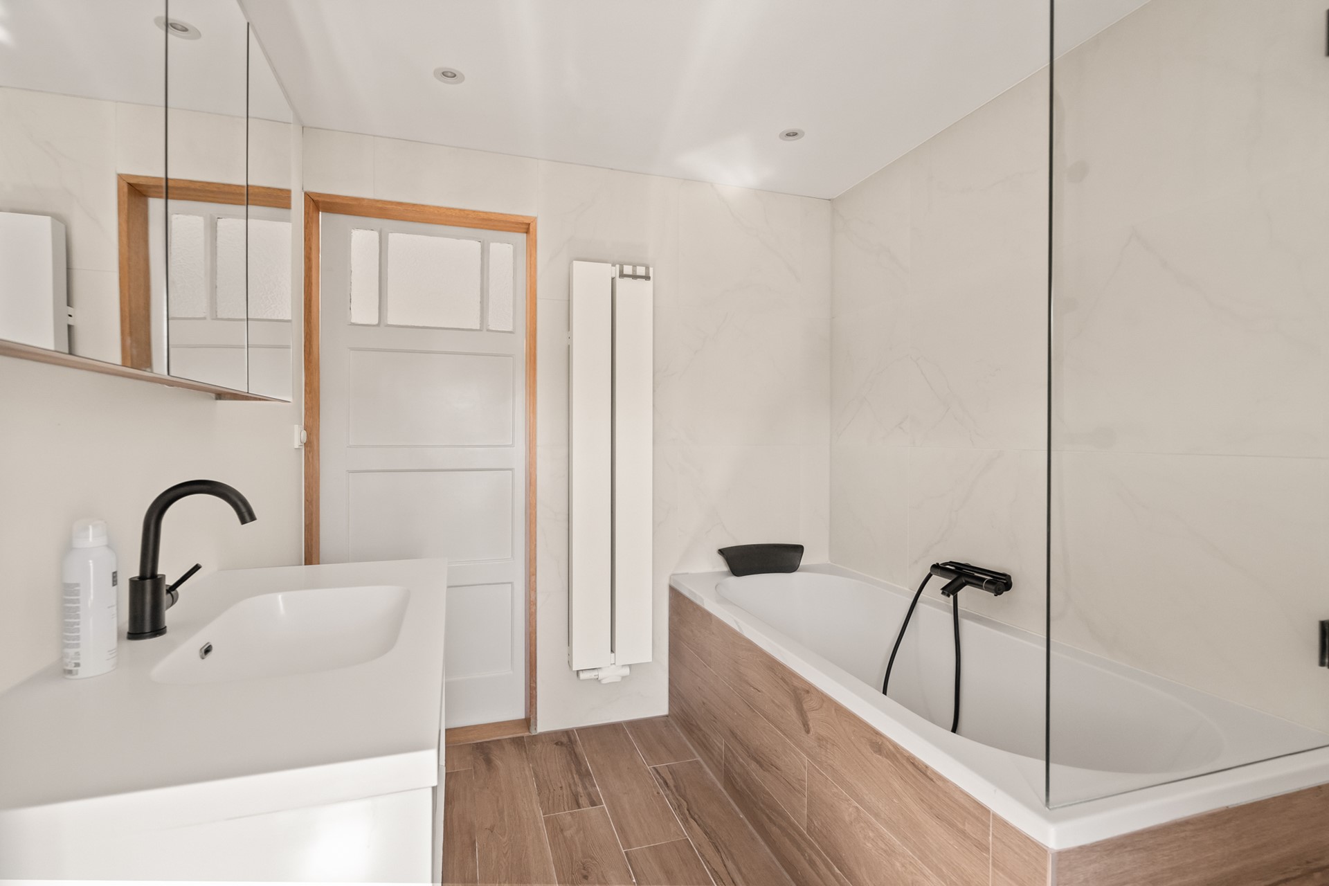 Overloop met toegang tot twee goed bemeten slaapkamers aan de voor- en achterzijde. Beide kamers zijn licht en flexibel in te richten. Daarnaast een aparte wasruimte met cv-opstelling en aansluitingen voor wasmachine en droger. De moderne badkamer is compleet uitgevoerd met ligbad, douche, toilet en wastafelmeubel.