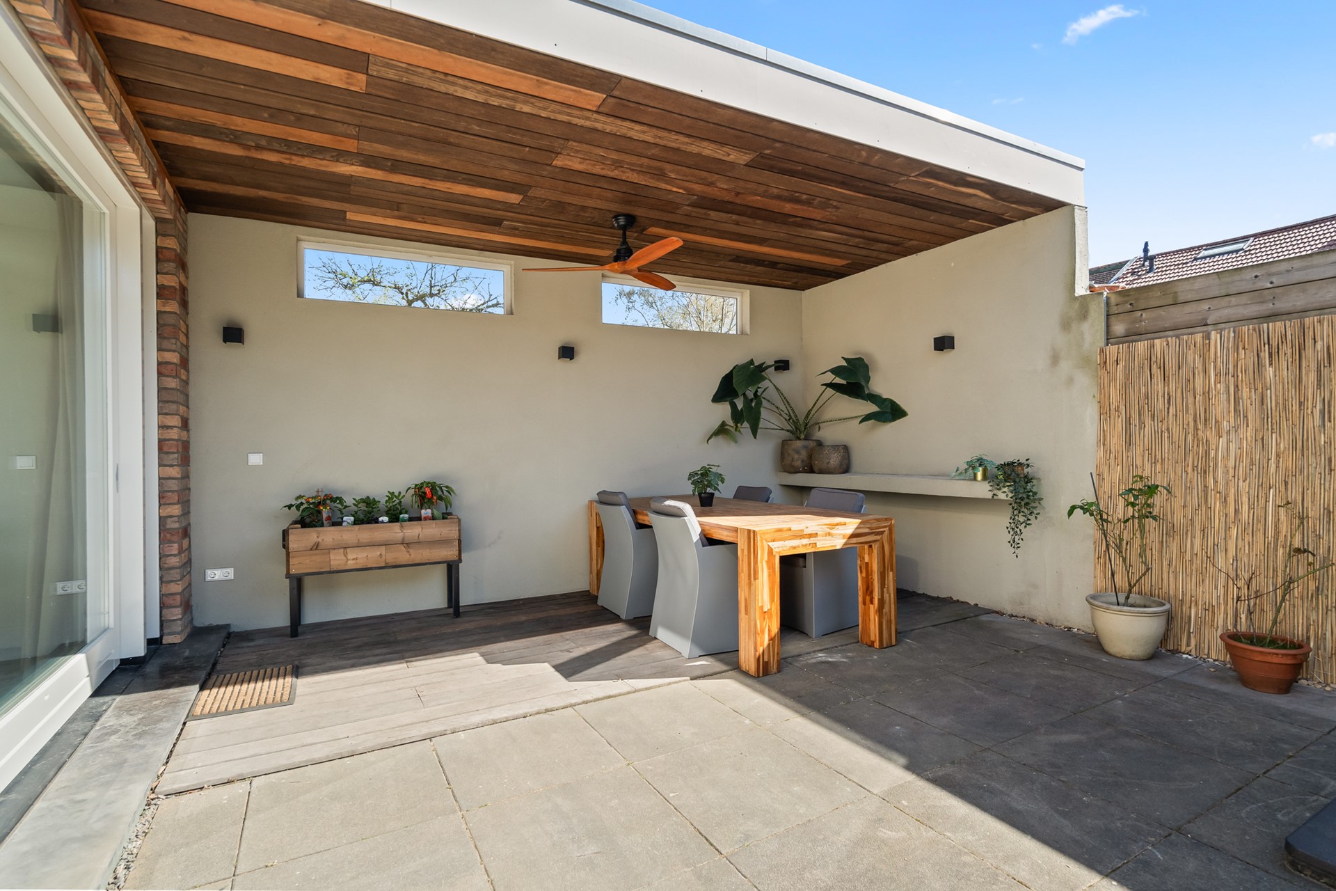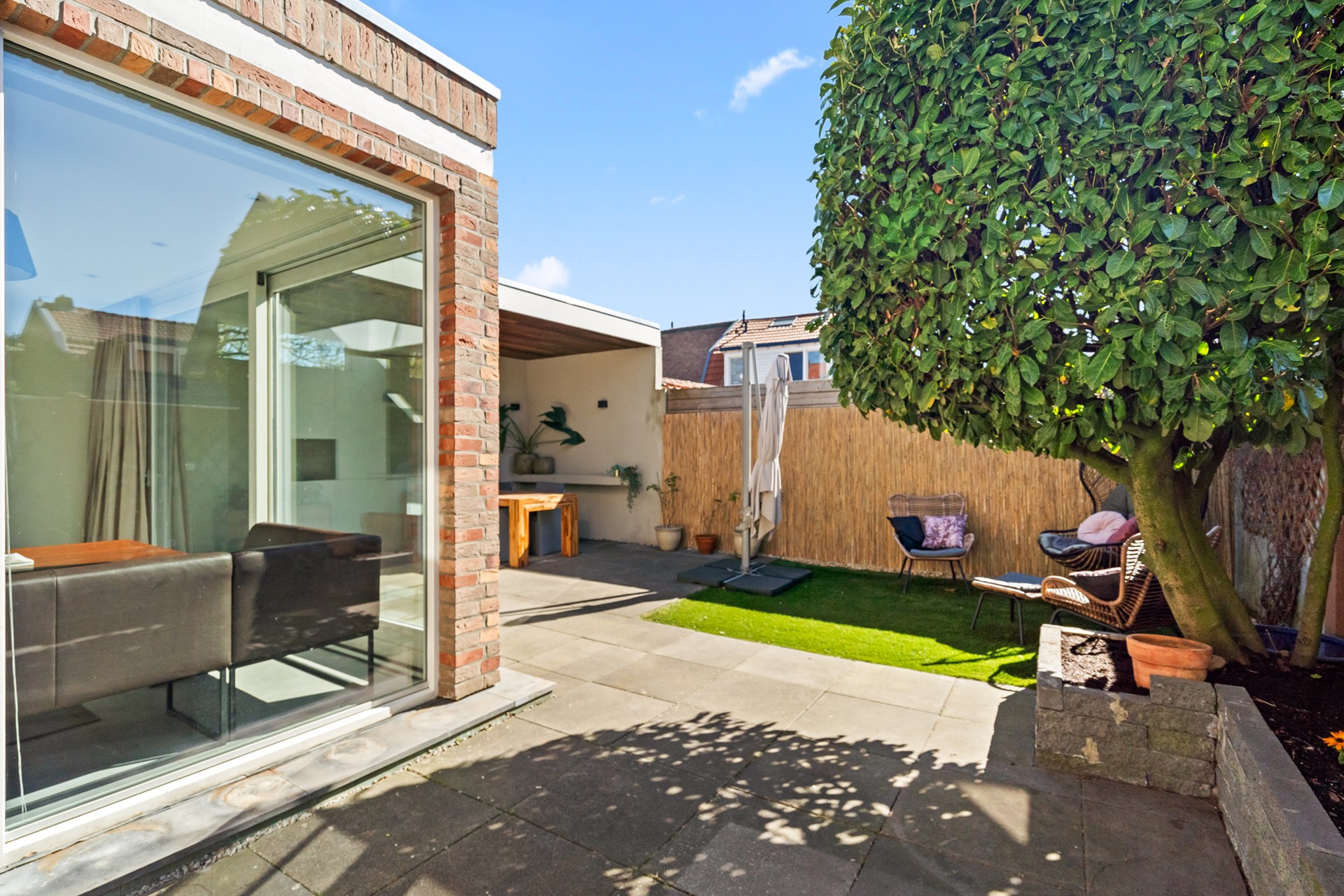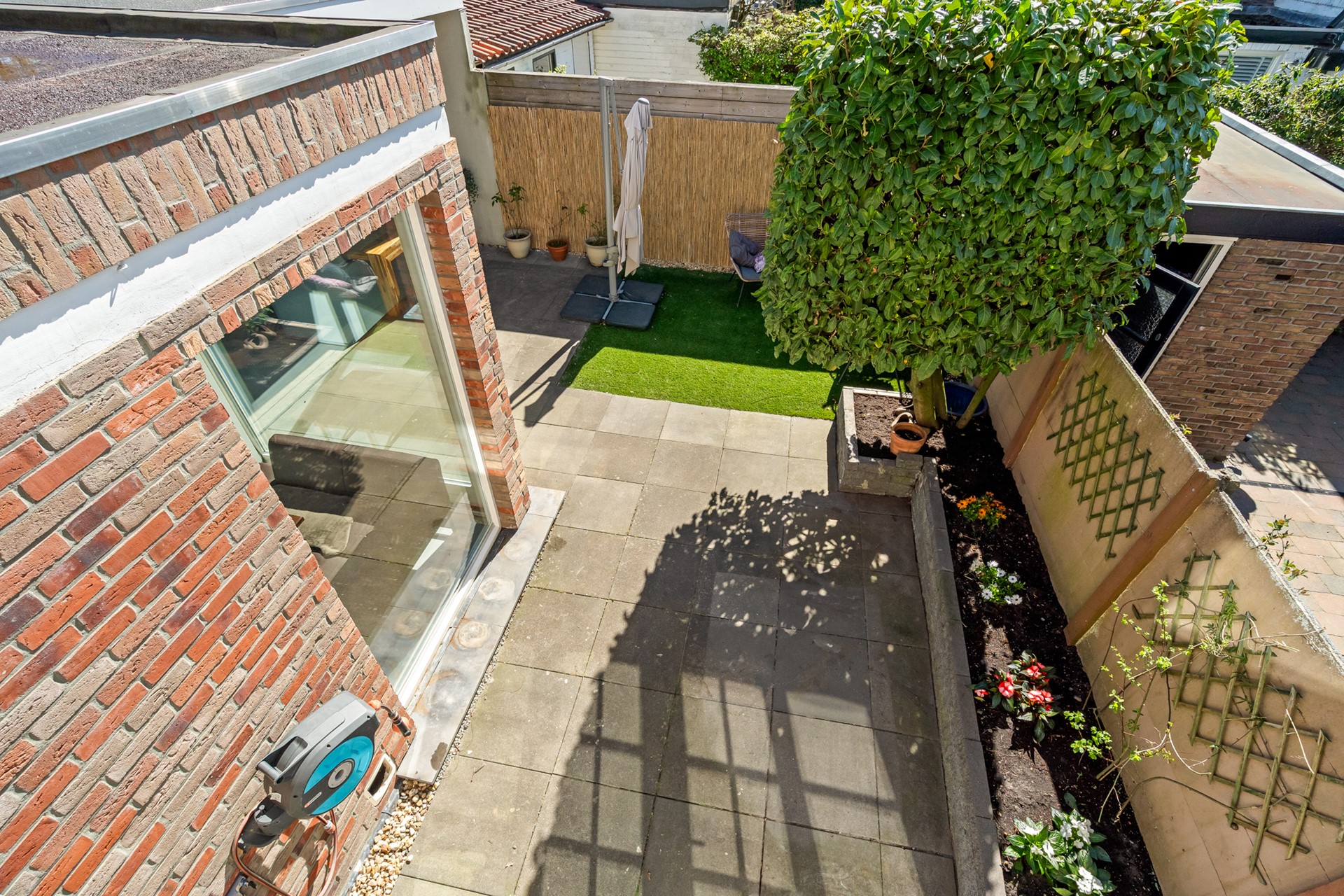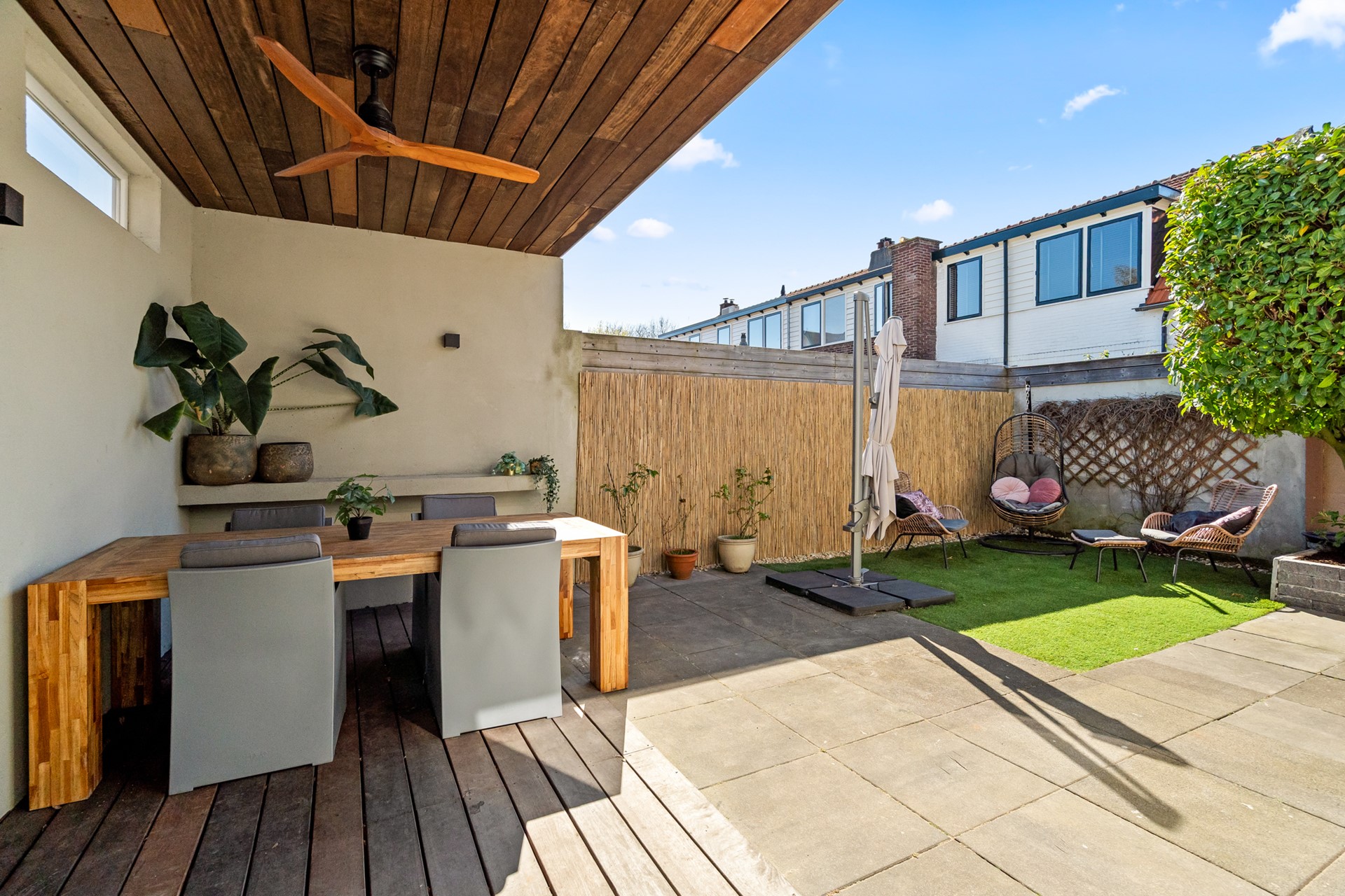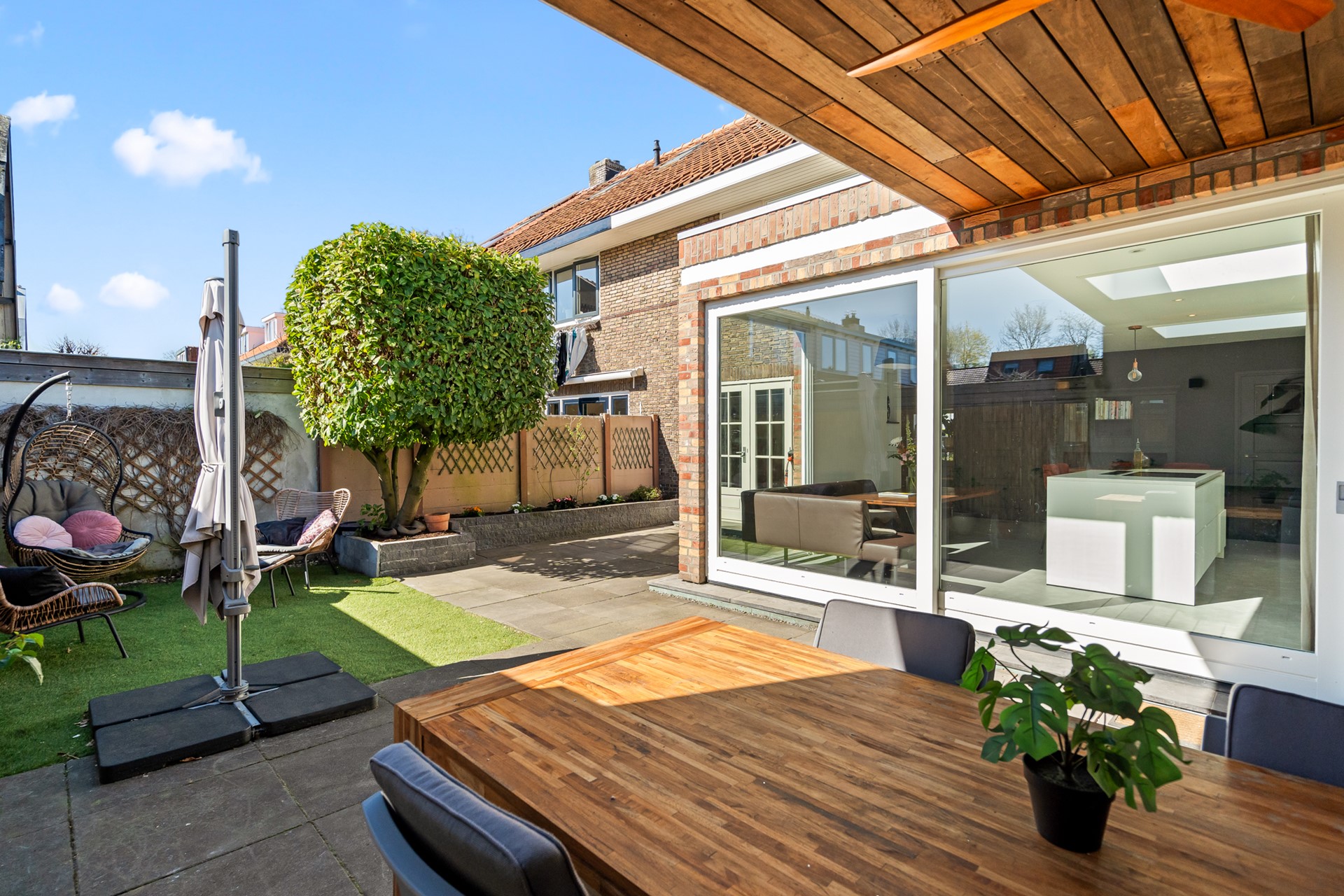 De woning beschikt over een ruime voortuin met eigen oprit, geschikt voor één grote of twee kleinere auto’s. De achtertuin is compact maar sfeervol en voorzien van een overkapping, waardoor je hier ook bij minder weer comfortabel buiten kunt zitten. In combinatie met de uitbouw ontstaat hier een prettig verlengstuk van de leefruimte binnen.