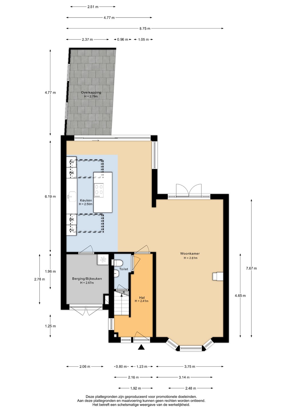 Entree met hal, trapopgang en modern toilet. Vanuit hier toegang tot de lichte woonkamer aan de voorzijde met erker en houtkachel. Aan de achterzijde de royale woonkeuken met kookeiland, schuifpui en lichtkoepel, een plek waar binnen en buiten naadloos in elkaar overlopen.